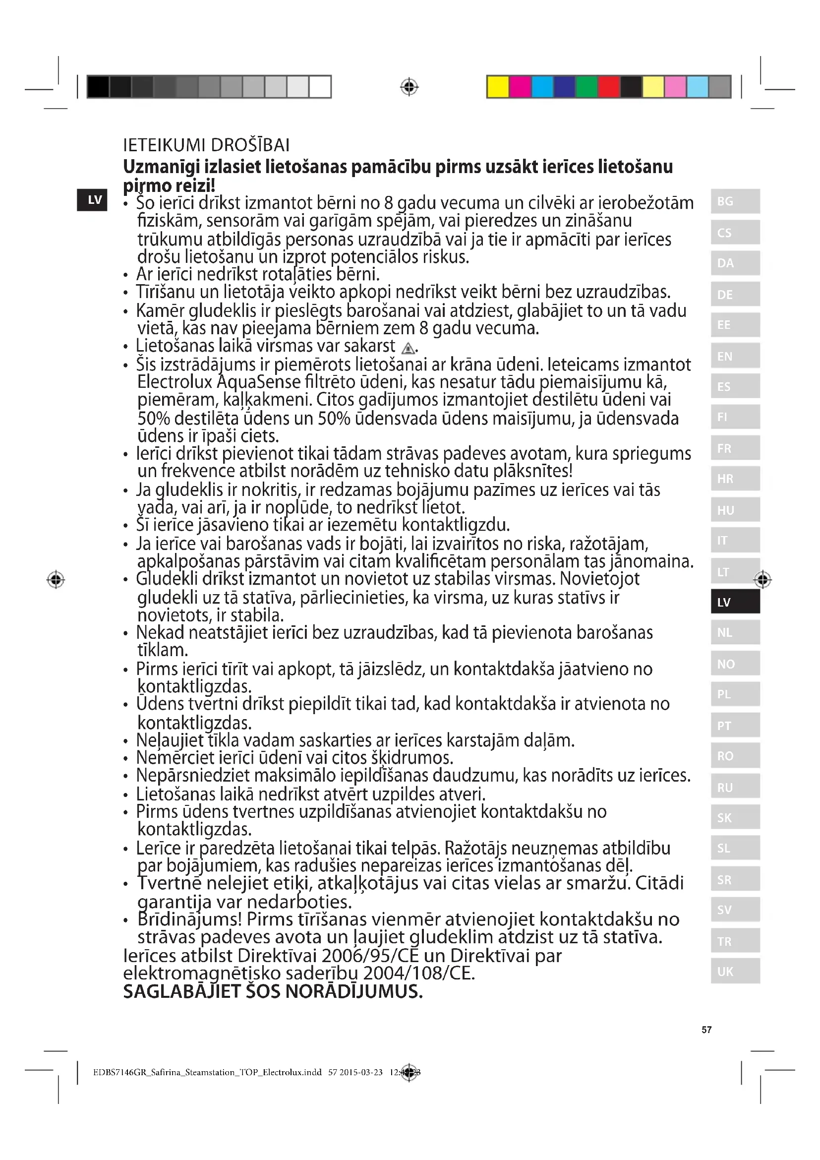Brīdinājums! Pirms tīrīšanas vienmēr atvienojiet kontaktdakšu no strāvas padeves avota un ļaujiet gludeklim atdzist uz tā statīva. Ierīces atbilst Direktīvai 2006/95/CE un Direktīvai par elektromagnētisko saderību 2004/108/CE. SAGLABĀJIET ŠOS NORĀDĪJUMUS.