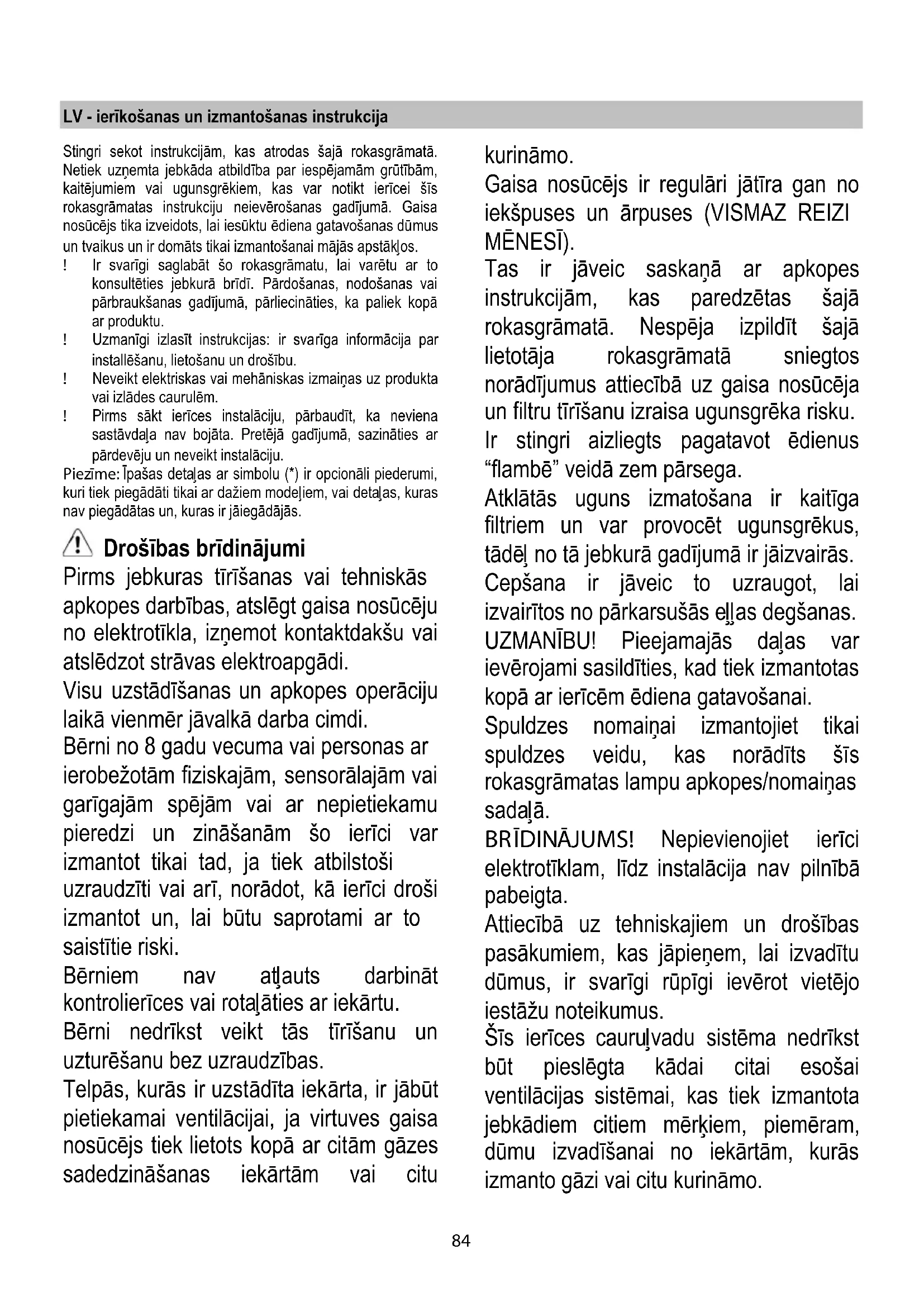 Lempų keitimas 1 pav. Išjunkite prietaisą iš elektros tinklo. Dėmesio! Prieš liesdami lempas, įsitikinkite, kad jos atvėsusios. Pakeiskite sugedusią lemputę nauja tokios pačios arba panašios rūšies lempute, vadovaudamiesi savybių duomenimis, pateiktais etiketėje ant lemputės arba ant gaubto šalia lemputės. Norėdami pasiekti lempoms skirtą ertmę, nuimkite dangtį A. Jei apšvietimas neveiks, prieš kviesdami techninę pagalbą, patikrinkite, ar lempas įstatėte teisinga pozicija.84 LV - ierīkošanas un izmantošanas instrukcija Stingri sekot instrukcijām, kas atrodas šajā rokasgrāmatā. Netiek uzņemta jebkāda atbildība par iespējamām grūtībām, kaitējumiem vai ugunsgrēkiem, kas var notikt ierīcei šīs rokasgrāmatas instrukciju neievērošanas gadījumā. Gaisa nosūcējs tika izveidots, lai iesūktu ēdiena gatavošanas dūmus un tvaikus un ir domāts tikai izmantošanai mājās apstākļos. ! Ir svarīgi saglabāt šo rokasgrāmatu, lai varētu ar to konsultēties jebkurā brīdī. Pārdošanas, nodošanas vai pārbraukšanas gadījumā, pārliecināties, ka paliek kopā ar produktu. ! Uzmanīgi izlasīt instrukcijas: ir sva rīga informācija par installēšanu, lietošanu un drošību. ! Neveikt elektriskas vai mehāniskas izmaiņas uz produkta vai izlādes caurulēm. ! Pirms sākt ierīces instalāciju, pārbaudīt, ka neviena sastāvdaļa nav bojāta. Pretējā gadījumā, sazināties ar pārdevēju un neveikt instalāciju. Piezīme: Īpašas detaļas ar simbolu (*) ir opcionāli piederumi, kuri tiek piegādāti tikai ar dažiem modeļiem, vai detaļas, kuras nav piegādātas un, kuras ir jāiegādājās. Drošības brīdinājumi Pirms jebkuras tīrīšanas vai tehniskās apkopes darbības, atslēgt gaisa nosūcēju no elektrotīkla, izņemot kontaktdakšu vai atslēdzot strāvas elektroapgādi. Visu uzstādīšanas un apkopes operāciju laikā vienmēr jāvalkā darba cimdi. Bērni no 8 gadu vecuma vai personas ar ierobežotām fiziskajām, sensorālajām vai garīgajām spējām vai ar nepietiekamu pieredzi un zināšanām šo ierīci var izmantot tikai tad, ja tiek atbilstoši uzraudzīti vai arī, norādot, kā ierīci droši izmantot un, lai būtu saprotami ar to saistītie riski. Bērniem nav atļauts darbināt kontrolierīces vai rotaļāties ar iekārtu. Bērni nedrīkst veikt tās tīrīšanu un uzturēšanu bez uzraudzības. Telpās, kurās ir uzstādīta iekārta, ir jābūt pietiekamai ventilācijai, ja virtuves gaisa nosūcējs tiek lietots kopā ar citām gāzes sadedzinā šanas iekārtām vai citu kurināmo. Gaisa nosūcējs ir regulāri jātīra gan no iekšpuses un ārpuses (VISMAZ REIZI MĒNESĪ). Tas ir jāveic saskaņā ar apkopes instrukcijām, kas paredzētas šajā rokasgrāmatā. Nespēja izpildīt šajā lietotāja rokasgrāmatā sniegtos norādījumus attiecībā uz gaisa nosūcēja un filtru tīrīšanu izraisa ugunsgrēka risku. Ir stingri aizliegts pagatavot ēdienus “flambē” veidā zem pārsega. Atklātās uguns izmatošana ir kaitīga filtriem un var provocēt ugunsgrēkus, tādēļ no tā jebkurā gadījumā ir jāizvairās. Cepšana ir jāveic to uzraugot, lai izvairītos no pārkarsušās eļļas degšanas. UZMANĪBU! Pieejamajās daļas var ievērojami sasildīties, kad tiek izmantotas kopā ar ierīcēm ēdiena gatavošanai. Spuldzes nomaiņai izmantojiet tikai spuldzes veidu, kas norādīts šīs rokasgrāmatas lampu apkopes/nomaiņas sadaļā. BRĪDINĀJUMS! Nepievienojiet ierīci elektrotīklam, līdz instalācija nav pilnībā pabeigta. Attiecībā uz tehniskajiem un drošības pasākumiem, kas jāpieņem, lai izvadītu dūmus, ir svarīgi rūpīgi ievērot vietējo iestāžu noteikumus. Šīs ierīces cauruļvadu sistēma nedrīkst būt pieslēgta kādai citai esošai ventilācijas sistēmai, kas tiek izmantota jebkādiem citiem mērķiem, piemēram, dūmu izvadīšanai no iekārtām, kurās izmanto gāzi vai citu kurināmo.85 Neizmantot vai neatstāt gaisa nosūcēju bez pareizi ierīkotām spuldzēm iespējama elektriskā trieciena riska dēļ. Nekad nelietojiet gaisa nosūcēju bez pienācīgi instalētiem elektrotīkliem. Gaisa nosūcēju nekad nedrīkst izmantot kā atbalsta virsmu, ja vien nav īpaši norādīts. Izmantojiet tikai stiprinājuma skrūves, kas iekļautas komplektācijā ar izstrādājumu tā uzstādīšanai, vai arī, ja tās nav piegādātas, iegādājieties pareizā veida skrūves. Izmantojiet pareizā garuma skrūves, kas identificētas Uzstādīšanas rokasgrāmatā. Šaubu gadījumā sazinieties ar pilnvarotu servisa palīdzības centru vai līdzīgu kvalificētu personu. BRĪDINĀJUMS! Nespēja uzstādīt skrūves vai stiprinājuma ierīci saskaņā ar šiem norādījumiem, var izraisīt elektriskā apdraudējuma risku. Mēs neuzņemamies nekādu atbildību par jebkādiem defektiem, bojājumiem vai ugunsgrēka izraisītiem zaudējumiem iekārtā, ja netiek ievērotas instrukcijas, kas iekļautas šajā rokasgrāmatā. Šī ierīce atbilst Eiropas Direktīvai 2012/19/EC, Waste Electrical And Electronic Equipment (WEEE). Pārliecinoties, vai šis produkts tiek izmests ārā pareizā veidā, izmantotājs veicina izvairīšanos no negatīvajām sekām apkārtējai videi un veselībai. Simbols uz produkta vai uz pievienotās dokumetācijas nozīmē, ka ar šo produktu nav jārīkojas, kā mājas atkritumam, bet tas ir jānogādā uz tam domātu savākšanas punktu, kur atkārtoti izlieto elektriskās un elektroniskās ierīces. Tas ir jāizmet, respektējot vietējos likumus, kas attiecas uz atkritumu aizvākšanu. Pēc papildus informācijas par produkta izmantošanu, apstrādi un atkārtotu izlietošanu, ir jāgriežas vietējā iestādē ,kas nodarbojas ar attiecīgo jautājumu, atkritumu atkārtotās izlietošanas servisu, vai uz veikalu, kur produkts tika iegadāts. Ierīce ir izstrādāta, pārbaudīta un ražota atbilst oši šādām prasībām.