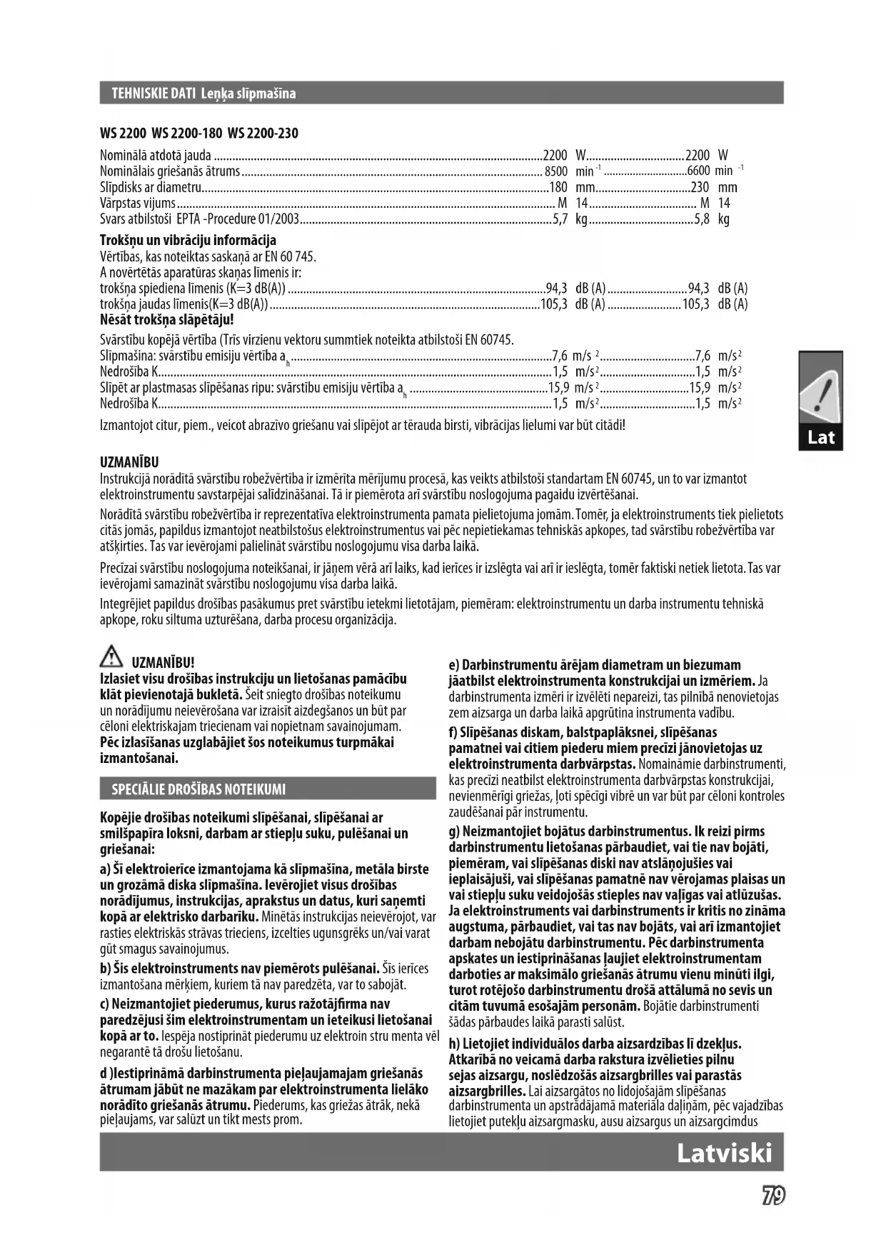 Pieslēgt tikai vienpola maiņstrāvas tīklam un tikai spriegumam, kas norādīts uz jaudas paneļa. Pieslēgums iespējams arī kontaktligzdām bez aizsargkontaktiem, jo runa ir par uzbūvi, kas atbilst II. aizsargklasei. Ieslēgšanas process izraisa īslaicīgu sprieguma pazemināšanos. Pie nelabvēlīgiem tīkla nosacījumiem var tikt ietekmēti arī citi instrumenti. Pie tīkla atkarības zem 0,2 Ohm nevajadzētu būt traucējumiem. APKOPE Vajag vienmēr uzmanīt, lai būtu tīras dzesēšanas atveres. Sakarā ar to, ka var izraisīt īsslēdzienu, dzesēšanas atverēs nedrīkst iekļūt nekādi metāla priekšmeti. Izmantojiet tikai rmu AEG piederumus un rmas rezerves daļas. Lieciet nomainīt detaļas, kuru nomaiņa nav aprakstīta, kādā no rmu AEG klientu apkalpošanas servisiem. (Skat. brošūru „Garantija/klientu apkalpošanas serviss“.) Ja nepieciešams, klientu apkalpošanas servisā vai tieši pie rmas AEG Electric Tools GmbH, Max-Eyth-Straße10, D-71364Winnenden, Germany, var pieprasīt instrumenta eksplozijas zīmējumu, šim nolūkam jāuzrāda mašīnas tips un desmitvietīgais numurs, kas norādīts uz jaudas paneļa.z strupceļam82 Lat Latviski SIMBOLI Pirms sākt lietot instrumentu, lūdzu, izlasiet lietošanas pamācību. UZMANĪBU! BÎSTAMI! Strādājot ar mašīnu, vienmēr jānēsā aizsargbrilles. Pirms veicat jebkādas darbības attiecībā uz mašīnas apkopi, atvienojiet kontaktdakšu no kontaktligzdas. Piederumi - standartaprīkojumā neietvertās, bet ieteicamās papildus komplektācijas detaļas no piederumu programmas. Neizmetiet elektroiekartas sadzives atkritumos! Saskana ar Eiropas Direktivu 2002/96/EK par lietotajam lektroiekartam, elektronikas iekartam un tas ieklaušanu valsts likumdošana lietotas ektroiekartas ir jasavac atseviški un janogada otrreizejai parstradei videi draudziga veida.83 Liet Lietuviškai TECHNINIAI DUOMENYS Kampinis šlifuoklis WS 2200 WS 2200-180 WS 2200-230 Vardinė imamoji galia .............................................................................................................2200 W................................2200 W Nominalus sūkių skaičius ........................................................................................................8500 min