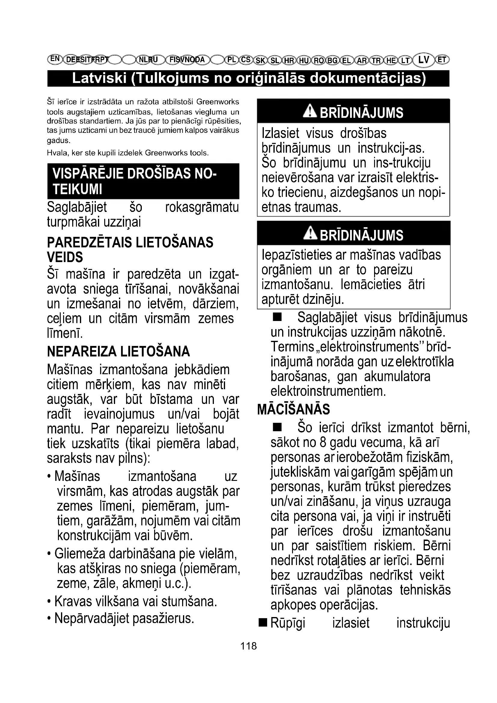 Šo ierīci drīkst izmantot bērni, sākot no 8 gadu vecuma, kā arī personas ar ierobežotām fiziskām, jutekliskām vai garīgām spējām un personas, kurām trūkst pieredzes un/vai zināšanu, ja viņus uzrauga cita persona vai, ja viņi ir instruēti par ierīces drošu izmantošanu un par saistītiem riskiem. Bērni nedrīkst rotaļāties ar ierīci. Bērni bez uzraudzības nedrīkst veikt tīrīšanas vai plānotas tehniskās apkopes operācijas. Rūpīgi izlasiet instrukciju Šī ierīce ir izstrādāta un ražota atbilstoši Greenworks tools augstajiem uzticamības, lietošanas viegluma un drošības standartiem. Ja jūs par to pienācīgi rūpēsities, tas jums uzticami un bez traucē jumiem kalpos vairākus gadus. Hvala, ker ste kupili izdelek Greenworks tools.