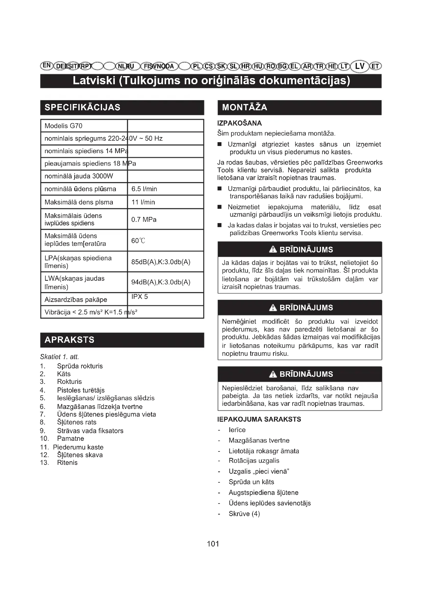 Nepieslēdziet barošanai, līdz salikšana nav pabeigta. Ja tas netiek izdarīts, var notikt nejauša iedarbināšana, kas var radīt nopietnas traumas. IEPAKOJUMA SARAKSTS - Ierīce - Mazgāšanas tvertne - Lietotāja rokasgr āmata - Rotācijas uzgalis - Uzgalis „pieci vienā“ - Sprūda un kāts - Augstspiediena šļūtene - Ūdens ieplūdes savienotājs - Skrūve (4)102 Latviski (Tulkojums no oriģinālās dokumentācijas)