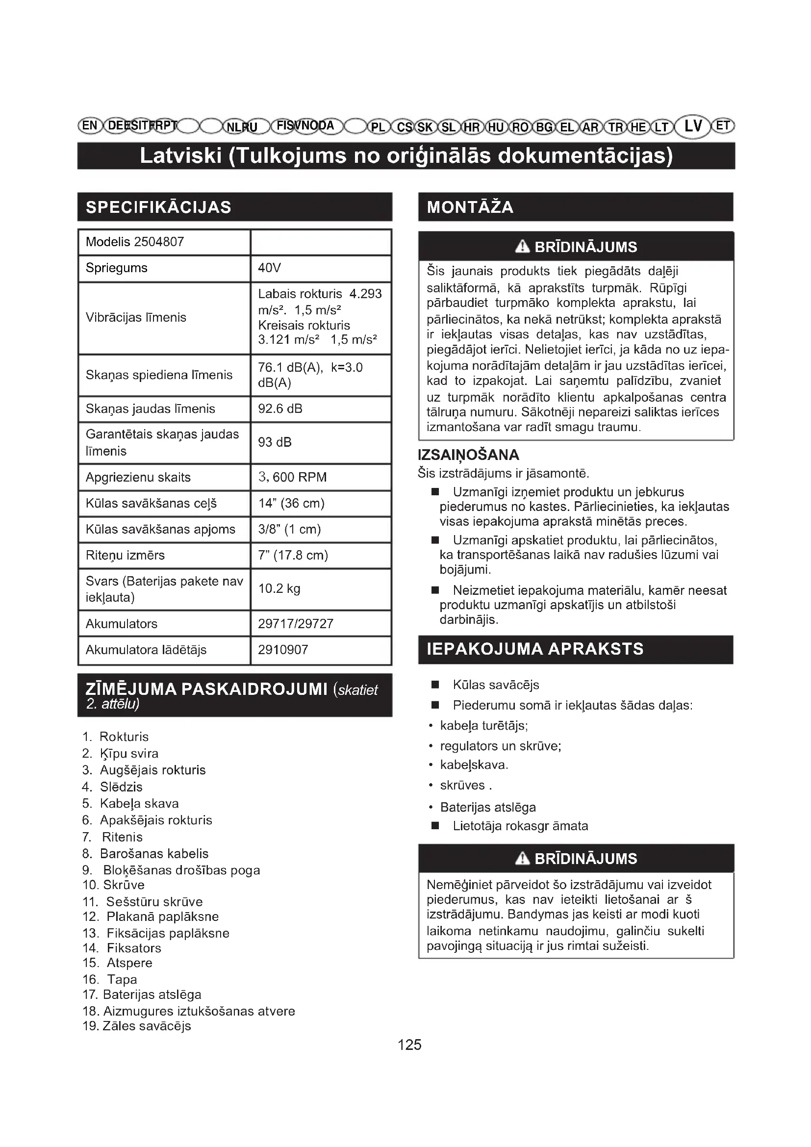 Nemēģiniet pārveidot šo izstrādājumu vai izveidot piederumus, kas nav ieteikti lietošanai ar š izstrādājumu. Bandymas jas keisti ar modi kuoti laikoma netinkamu naudojimu, galinčiu sukelti pavojingą situaciją ir jus rimtai sužeisti. SPECIFIKĀCIJAS Modelis 2504807 Spriegums 40V Vibrācijas līmenis Labais rokturis 4.293 m/s². 1,5 m/s² Kreisais rokturis