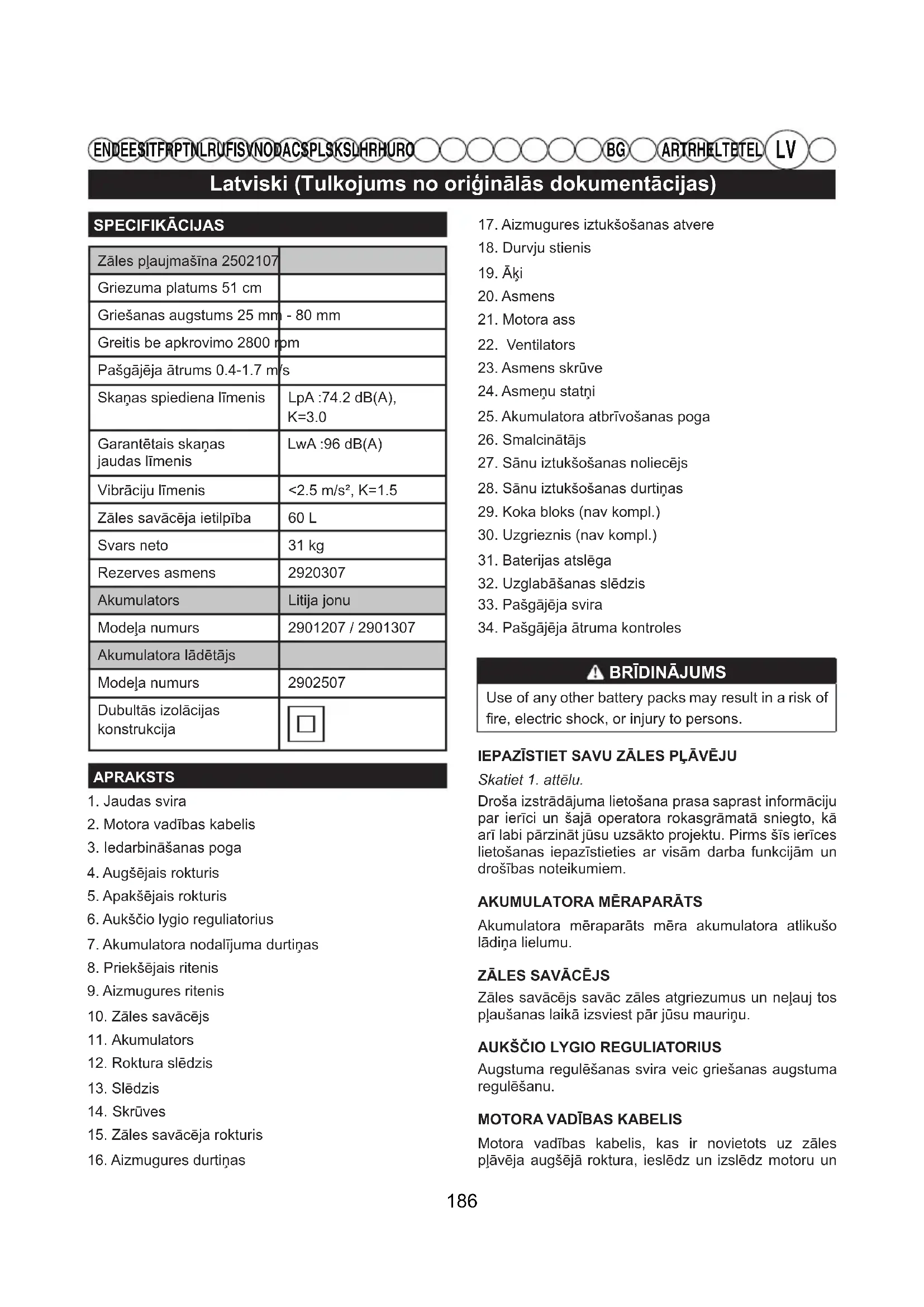 Use of any other battery packs may result in a risk of re, electric shock, or injury to persons. IEPAZĪSTIET SAVU ZĀLES PĻĀVĒJUSkatiet 1. attēlu.Droša izstrādājuma lietošana prasa saprast informāciju par ierīci un šajā operatora rokasgrāmatā sniegto, kā arī labi pārzināt jūsu uzsākto projektu. Pirms šīs ierīces lietošanas iepazīstieties ar visām darba funkcijām un drošības noteikumiem.AKUMULATORA MĒRAPARĀTS Akumulatora mēraparāts mēra akumulatora atlikušo lādiņa lielumu.ZĀLES SAVĀCĒJS Zāles savācējs savāc zāles atgriezumus un neļauj tos pļaušanas laikā izsviest pār jūsu mauriņu.AUKŠČIO LYGIO REGULIATORIUS Augstuma regulēšanas svira veic griešanas augstuma regulēšanu.MOTORA VADĪBAS KABELIS Motora vadības kabelis, kas ir novietots uz zāles pļāvēja augšējā roktura, ieslēdz un izslēdz motoru un 186Latviski (Tulkojums no oriģinālās dokumentācijas)