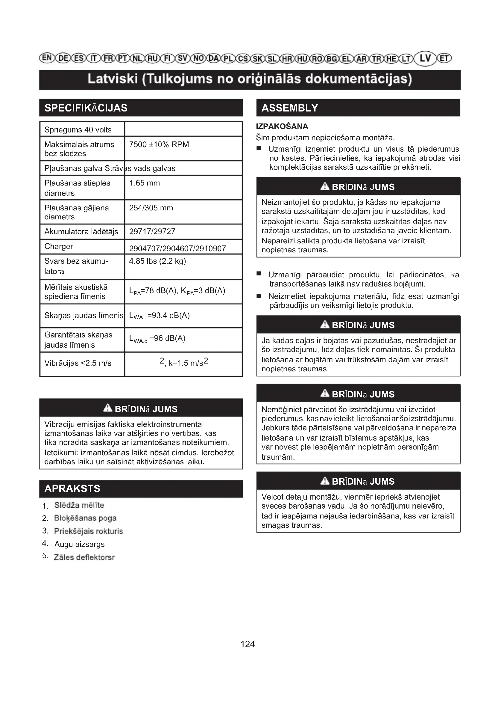 BRĪDINā JUMS Vibrāciju emisijas faktiskā elektroinstrumenta izmantošanas laikā var atšķirties no vērtības, kas tika norādīta saskaņā ar izmantošanas noteikumiem. Ieteikumi: izmantošanas laikā nēsāt cimdus. Ierobežot darbības laiku un saīsināt aktivizēšanas laiku. APRAKSTS