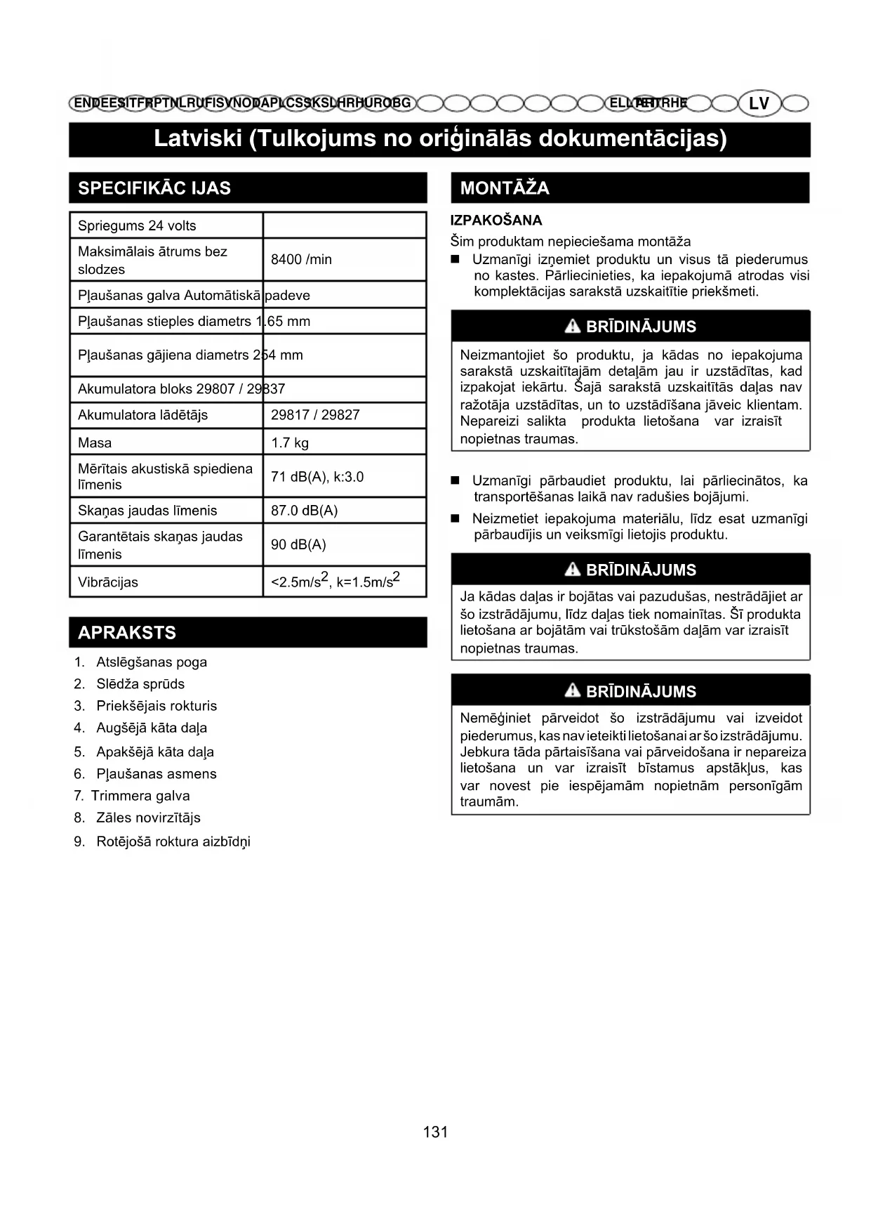 EN DE ES IT FR PT NL RU FI SV NO DA PL CS SK SL HR HU RO BGAR TR HEEL LT ET BRĪDINā JUMS Veicot detaļu montāžu, vienmēr iepriekš atvienojiet sveces barošanas vadu. Ja šo norādījumu neievēro, tad ir iespējama nejauša iedarbināšana, kas var izraisīt smagas traumas. Z ĀLES DEFLEK TOR A MONTĀ ŽU Skatīt 2-3.Att. BRĪDINā JUMS Izvairīties no saskares ar asmeni. Neievērojot šo noteikumu, var tikt izraisīti nopietni miesas bojājumi. Izmantojiet Phillips skrūvgriezi, lai no trimmera galvas noņemtu skrūvi. Uzlieciet zāles novirzītāju uz pacēluma trimmera galvā. Ielieciet skrūvi un nostipriniet to, griežot pulksteņrādītāja virzienā. BRĪDINā JUMS Vienmēr esiet uzmanīgi, pat pēc tam, kad esat jau iepazinušies ar ierīci. Nekad neaizmirstiet, ka tikai sekunde neuzmanības var radīt nopietnus savainojumus. BRĪDINā JUMS Vienmēr aizsargājiet acis. Neņemot vērā šo brīdinājumu, var tikt izraisīti nopietni miesas bojājumi, kurus acīs radīt izmesti priekšmeti. BRĪDINā JUMS Neizmantojiet sastāvdaļas vai piederumus, kurus nav ieteicis ražotājs. Neieteikto detaļu vai piederumu lietošana var izraisīt nopietnus miesas bojājumus. APAKŠĒJĀS KĀTA DAĻAS UZSTĀDĪŠANA PIE AUGŠĒJĀ KĀTA Skatīt 4. Att. Nospiediet rotējošā roktura aizbīdņus, kas atrodas uz apakšējā kāta. Savietojiet aizbīdņus ar caurumiem augšējā kāta daļā. Ieslidiniet apakšējo kātu augšējā, kamēr rotējošā roktura aizbīdņi ieguļ attiecīgajā caurumā. Ievietojiet skrūves kātā, nostipriniet apakšējo kātu vietā. EKSPLUATCIJA ZĀLES PĻĀVĒJA MONTĀŽAI Skatīt 5.Att. Novietojiet akumulatora bloku krūmgriezī. Izvirzīto pārlaidumu uz akumulatora bloka saskaņojiet ar krūmgrieža akumulatora nodalījuma nišām. Pirms uzsākt lietot ierīci, pārliecinieties, vai bloķēšanas izcilnis akumulatora apakšpusē ir ievietots pareizi, un, vai akumulators ir pienācīgi nostiprināts krūmgriezī. LAI NOŅEMTU AKUMULATORU Skatīt 5.Att. Nospiediet un paturiet akumulatora aizgriežņa pogu akumulatora apakšā. Noņemiet akumulatoru no trimmera. KRŪMGRIEŽA PALAIŠANA/APTURĒŠANA Skatīt 6.Att. Lai iedarbinātu trimmeri, nospiediet atslēgšanas pogu (1) un pavelciet slēdža sprūdu (2). Lai apturētu auklas trimmeru, atlaidiet slēdža sprūdu. BRĪDINā JUMS Trokšņa līmenis. Nav novēršams, ka mašīna ekspluatācijas fāzes laikā sasniedz noteiktu trokšņa emisiju līmeni. Darba skaļuma līmenis ir atkarīgs no atļaujām, un noteiktos laika periodos tas ir ierobežots. Lai ierobežotu darba stundu skaitu, var būt nepieciešamas papildu pauzes periodi; Personām, kas uzturas mašīnas tuvumā, savas personīgās drošības labad jālieto attiecīgi dzirdes aizsardzības līdzekļi. Pārāk augstas vibrācijas var radīt efektu, ka pirksts kļūst balts vai izraisīt karpālā kanāla sindromu. Ja mašīnas lietošanas laikā jums rodas nepatīkama, ādu balinoša sajūta, nekavējoties pārtrauciet darbu. Ievērojiet atbilstošus darba pārtraukumus. Regulāriem mašīnas lietotājiem bieži jāpārbauda pirkstu stāvoklis. BRĪDINā JUMS Saskare ar krūmgrieža pļaušanas galvu var izraisīt nopietnus miesas bojājumus. 132Latviski (Tulkojums no oriģinālās dokumentācijas)