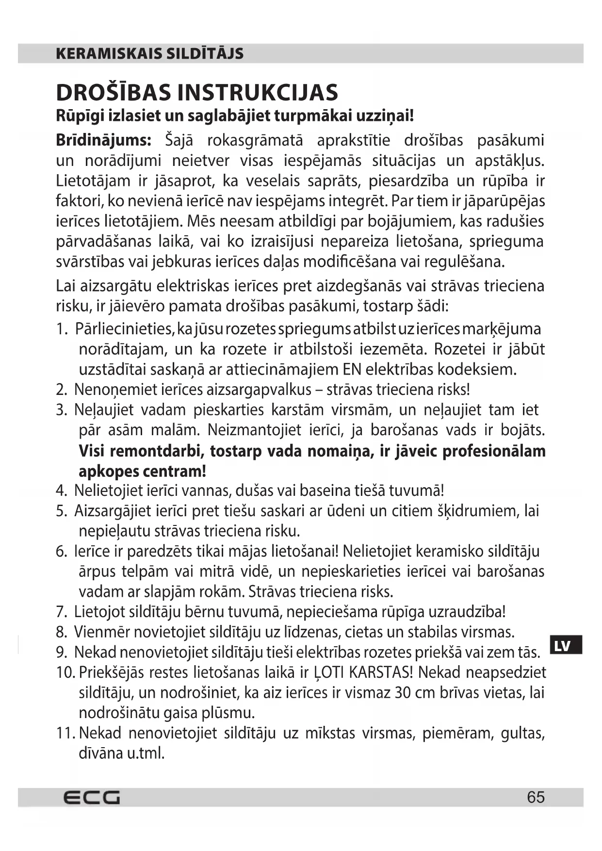 - Ierīce ir paredzēts tikai mājas lietošanai! Nelietojiet keramisko sildītāju ārpus telpām vai mitrā vidē, un nepieskarieties ierīcei vai barošanas vadam ar slapjām rokām. Strāvas trieciena risks.