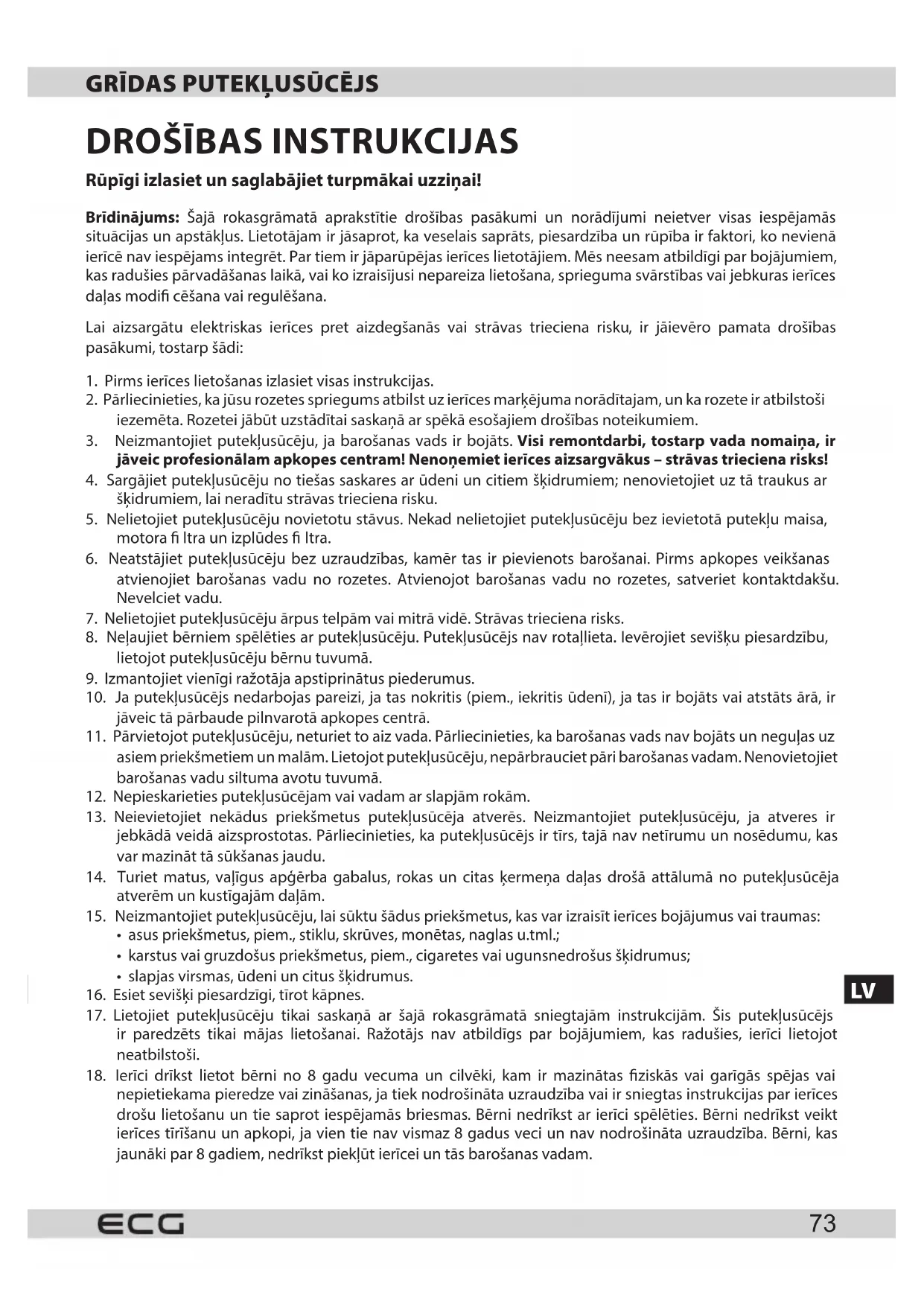Bridinajums: Saja rokasgramata aprakstitie drošibas pasakumi un noradijumi neietver visas iespejamās situácijs un apstaklus. Lietotajam ir jasaprot, ka veselais saprats, piesardziba un rupiba ir faktori, ko neviena ierice nav iespejams integret. Par tiem ir japarupejas icerces lietotajiem. Mēs neesam atbildigi par bojajumiem, kas radusies parvadaśanas laikā, vai ko izraisijusi nepareiza lietošana, sprieguma svärstibas vai jebkuras icerces dalas modifi Česana vai regulešana.