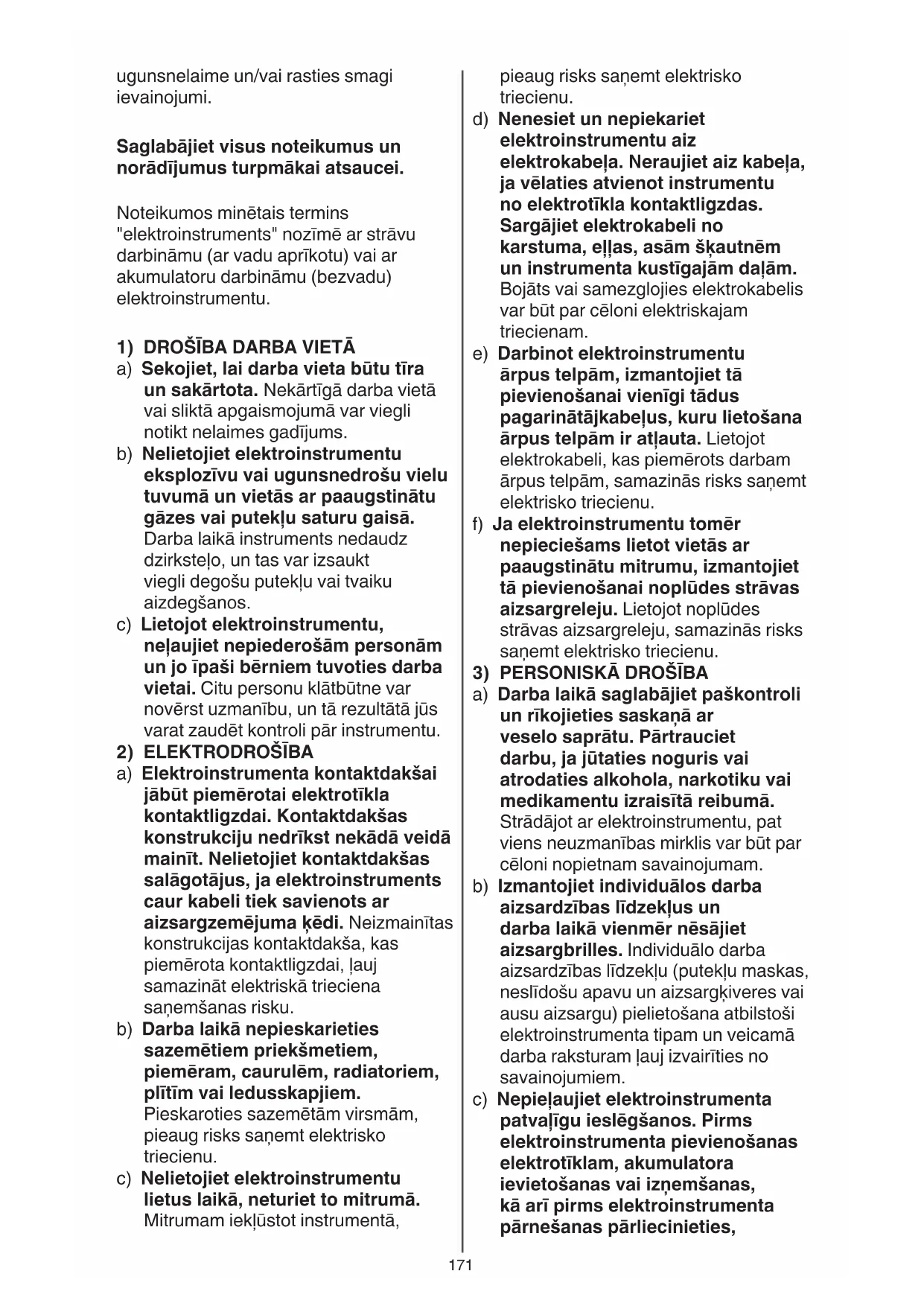 a) Elektroinstrumenta kontaktdakšai jābūt piemērotai elektrotīkla kontaktligzdai. Kontaktdakšas konstrukciju nedrīkst nekādā veidā mainīt. Nelietojiet kontaktdakšas salāgotājus, ja elektroinstruments caur kabeli tiek savienots ar aizsargzemējuma ķēdi. Neizmainītas konstrukcijas kontaktdakša, kas piemērota kontaktligzdai, ļauj samazināt elektriskā trieciena saņemšanas risku. b) Darba laikā nepieskarieties sazemētiem priekšmetiem, piemēram, caurulēm, radiatoriem, plītīm vai ledusskapjiem. Pieskaroties sazemētām virsmām, pieaug risks saņemt elektrisko triecienu. c) Nelietojiet elektroinstrumentu lietus laikā, neturiet to mitrumā. Mitrumam iekļūstot instrumentā,172 un izslēgt, ir bīstams lietošanai un to nepieciešams remontēt. c) Pirms elektroinstrumenta apkopes, regulēšanas vai darbinstrumenta nomaiņas atvienojiet tā kontaktdakšu no barojošā elektrotīkla vai izņemiet no tā akumulatoru, ja tas ir izņemams. Šādi iespējams samazināt elektroinstrumenta nejaušas ieslēgšanās risku. d) Elektroinstrumentu, kas netiek darbināts, uzglabājiet piemērotā vietā, kur tas nav sasniedzams bērniem un personām, kuras neprot rīkoties ar instrumentu. Ja elektroinstrumentu lieto nekompetentas personas, tas var apdraudēt cilvēku veselību. e) Savlaicīgi apkalpojiet elektroinstrumentus un to piederumus. Pārbaudiet, vai kustīgās daļas darbojas bez traucējumiem un nav iespīlētas, vai kāda no daļām nav salauzta vai bojāta, vai katra no tām pareizi funkcionē un pilda tai paredzēto uzdevumu. Nodrošiniet, lai bojātās daļas tiktu savlaicīgi nomainītas vai remontētas pilnvarotā remontu darbnīcā. Daudzi nelaimes gadījumi notiek tāpēc, ka elektroinstruments pirms lietošanas nav pienācīgi apkalpots. f) Savlaicīgi notīriet un uzasiniet griezošos darbinstrumentus. Rūpīgi kopti instrumenti, kas apgādāti ar asiem griezējinstrumentiem, ļauj strādāt daudz ražīgāk un ir vieglāk vadāmi. g) Lietojiet vienīgi tādus elektroinstrumentus, papildpiederumus, darbinstrumentus utt., kas paredzēti attiecīgajam pielietojuma veidam. Bez tam jāņem vērā arī konkrētie darba apstākļi un pielietojuma īpatnības. Elektroinstrumentu lietošana citiem mērķiem, nekā to ir paredzējusi ražotājrma, ir bīstama un var novest pie neparedzamām sekām. h) Uzturiet elektroinstrumenta rokturus un noturvirsmas sausas un tīras, sargājiet tās no eļļas ka tas ir izslēgts. Pārnesot elektroinstrumentu, ja pirksts atrodas uz ieslēdzēja, kā arī pievienojot to elektrobarošanas avotam laikā, kad elektroinstruments ir ieslēgts, var viegli notikt nelaimes gadījums. d) Pirms instrumenta ieslēgšanas neaizmirstiet izņemt no tā regulējošos instrumentus vai skrūvjatslēgas. Patronatslēga vai skrūvjatslēga, kas instrumenta ieslēgšanas brīdī nav izņemta no tā, var radīt savainojumu. e) Strādājot ar elektroinstrumentu, ieturiet stingru stāju. Darba laikā vienmēr saglabājiet līdzsvaru un centieties nepaslīdēt. Tas atvieglos instrumenta vadību neparedzētās situācijās. f) Izvēlieties darbam piemērotu apģērbu. Darba laikā nenēsājiet brīvi plandošas drēbes un rotaslietas. Netuviniet garus matus un drēbes elektroinstrumenta kustīgajām daļām. Vaļīgas drēbes, rotaslietas un gari mati var ieķerties instrumenta kustīgajās daļās. g) Ja elektroinstrumenta konstrukcija ļauj tam pievienot ārējo putekļu uzsūkšanas vai savākšanas/uzkrāšanas ierīci, sekojiet, lai tā tiktu pievienota elektroinstrumentam un pareizi darbotos. Pielietojot putekļu uzsūkšanu vai savākšanu/uzkrāšanu, samazinās to kaitīgā ietekme uz strādājošās personas veselību. h) Nepaļaujieties uz iemaņām, kas tiek iegūtas, bieži lietojot instrumentus, neieslīgstiet pašapmierinātībā un neignorējiet instrumenta drošas lietošanas principus. Neuzmanīgas rīcības dēļ dažās sekundes daļās var gūt nopietnu savainojumu.