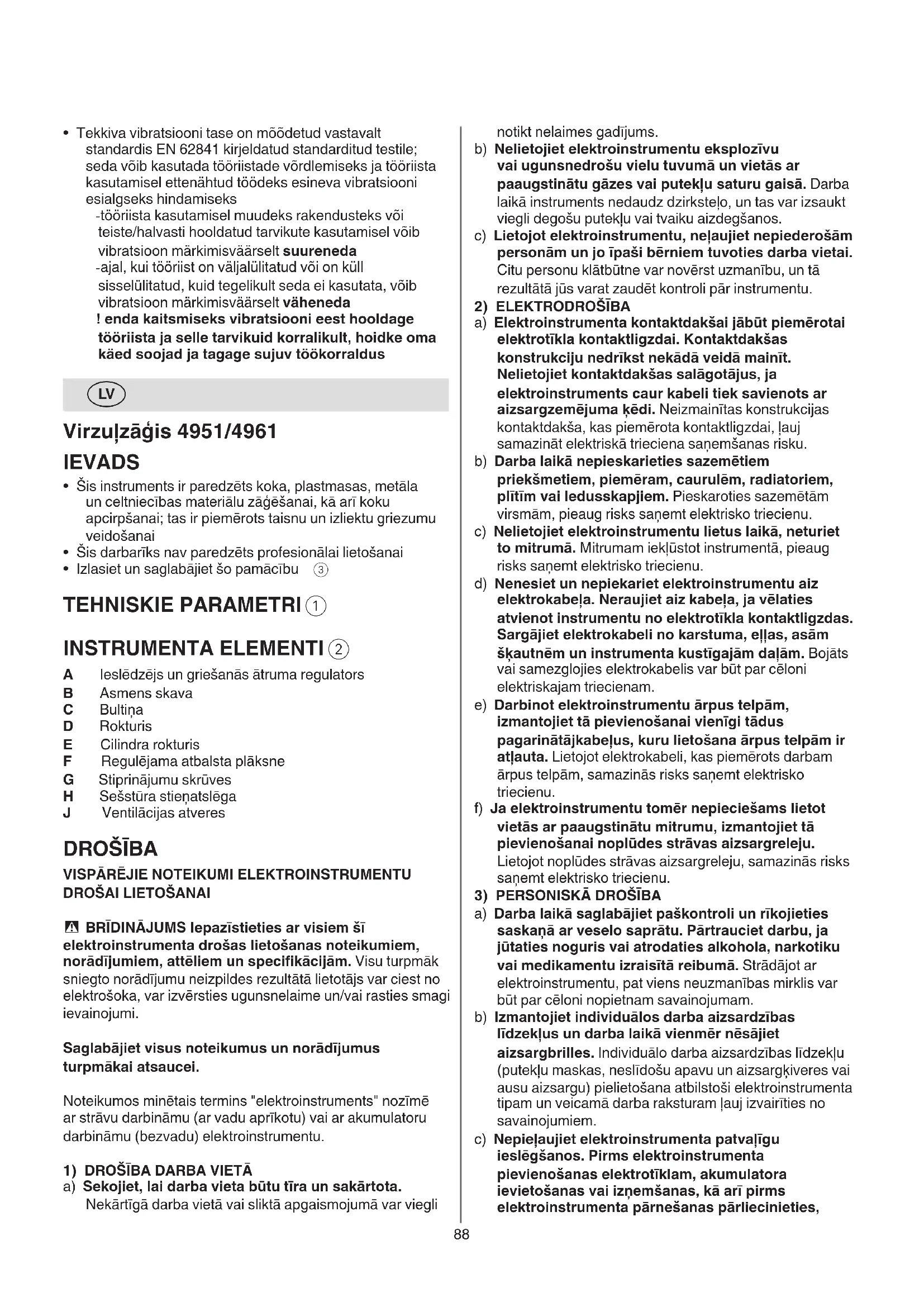 - Elektriska vai mehāniska rakstura kļūmes gadījumā nekavējoties izslēdziet instrumentu un atvienojiet kabeļa ka tas ir izslēgts. Pārnesot elektroinstrumentu, ja pirksts atrodas uz ieslēdzēja, kā arī pievienojot to elektrobarošanas avotam laikā, kad elektroinstruments ir ieslēgts, var viegli notikt nelaimes gadījums. d) Pirms instrumenta ieslēgšanas neaizmirstiet izņemt no tā regulējošos instrumentus vai skrūvjatslēgas. Patronatslēga vai skrūvjatslēga, kas instrumenta ieslēgšanas brīdī nav izņemta no tā, var radīt savainojumu. e) Strādājot ar elektroinstrumentu, ieturiet stingru stāju. Darba laikā vienmēr saglabājiet līdzsvaru un centieties nepaslīdēt. Tas atvieglos instrumenta vadību neparedzētās situācijās. f) Izvēlieties darbam piemērotu apģērbu. Darba laikā nenēsājiet brīvi plandošas drēbes un rotaslietas. Netuviniet garus matus un drēbes elektroinstrumenta kustīgajām daļām. Vaļīgas drēbes, rotaslietas un gari mati var ieķerties instrumenta kustīgajās daļās. g) Ja elektroinstrumenta konstrukcija ļauj tam pievienot ārējo putekļu uzsūkšanas vai savākšanas/ uzkrāšanas ierīci, sekojiet, lai tā tiktu pievienota elektroinstrumentam un pareizi darbotos. Pielietojot putekļu uzsūkšanu vai savākšanu/uzkrāšanu, samazinās to kaitīgā ietekme uz strādājošās personas veselību. h) Nepaļaujieties uz iemaņām, kas tiek iegūtas, bieži lietojot instrumentus, neieslīgstiet pašapmierinātībā un neignorējiet instrumenta drošas lietošanas principus. Neuzmanīgas rīcības dēļ dažās sekundes daļās var gūt nopietnu savainojumu.