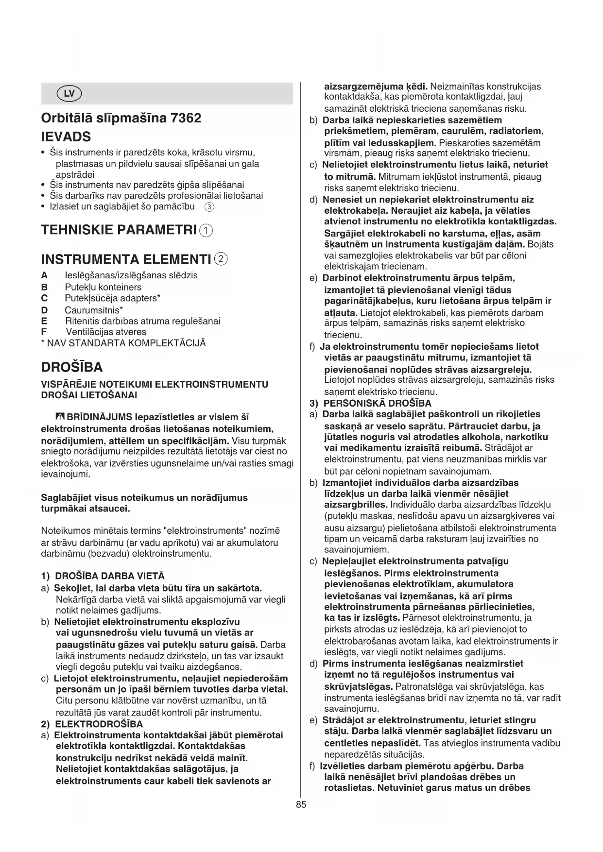 - Lihvpaberi soovitatav karedus: - värvi eemaldamiseks ja väga ebatasase puidu lihvimiseks kasutage jämedate teradega suurusi (40, 60) - kareda või tavalise puidu lihvimiseks kasutage keskmiste teradega suurusi (80, 100, 120) - puidu ja vana värviga pindade silendamiseks ning palja puidu viimistlemiseks kasutage peene teraa suurusi85 aizsargzemējuma ķēdi. Neizmainītas konstrukcijas kontaktdakša, kas piemērota kontaktligzdai, ļauj samazināt elektriskā trieciena saņemšanas risku. b) Darba laikā nepieskarieties sazemētiem priekšmetiem, piemēram, caurulēm, radiatoriem, plītīm vai ledusskapjiem. Pieskaroties sazemētām virsmām, pieaug risks saņemt elektrisko triecienu. c) Nelietojiet elektroinstrumentu lietus laikā, neturiet to mitrumā. Mitrumam iekļūstot instrumentā, pieaug risks saņemt elektrisko triecienu. d) Nenesiet un nepiekariet elektroinstrumentu aiz elektrokabeļa. Neraujiet aiz kabeļa, ja vēlaties atvienot instrumentu no elektrotīkla kontaktligzdas. Sargājiet elektrokabeli no karstuma, eļļas, asām šķautnēm un instrumenta kustīgajām daļām. Bojāts vai samezglojies elektrokabelis var būt par cēloni elektriskajam triecienam. e) Darbinot elektroinstrumentu ārpus telpām, izmantojiet tā pievienošanai vienīgi tādus pagarinātājkabeļus, kuru lietošana ārpus telpām ir atļauta. Lietojot elektrokabeli, kas piemērots darbam ārpus telpām, samazinās risks saņemt elektrisko triecienu. f) Ja elektroinstrumentu tomēr nepieciešams lietot vietās ar paaugstinātu mitrumu, izmantojiet tā pievienošanai noplūdes strāvas aizsargreleju. Lietojot noplūdes strāvas aizsargreleju, samazinās risks saņemt elektrisko triecienu.