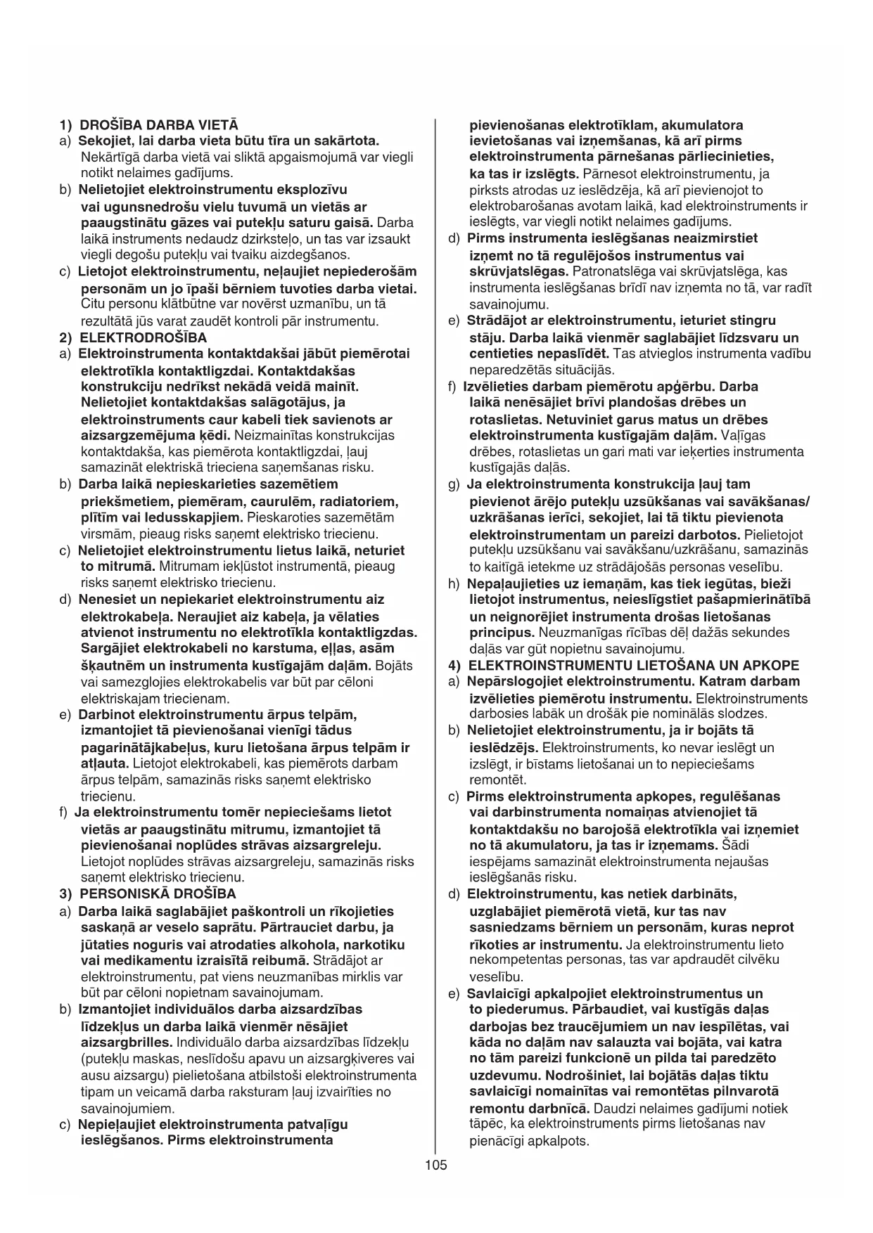 a) Darba laikā saglabājiet paškontroli un rīkojieties saskaņā ar veselo saprātu. Pārtrauciet darbu, ja jūtaties noguris vai atrodaties alkohola, narkotiku vai medikamentu izraisītā reibumā. Strādājot ar elektroinstrumentu, pat viens neuzmanības mirklis var būt par cēloni nopietnam savainojumam. b) Izmantojiet individuālos darba aizsardzības līdzekļus un darba laikā vienmēr nēsājiet aizsargbrilles. Individuālo darba aizsardzības līdzekļu (putekļu maskas, neslīdošu apavu un aizsargķiveres vai ausu aizsargu) pielietošana atbilstoši elektroinstrumenta tipam un veicamā darba raksturam ļauj izvairīties no savainojumiem. c) Nepieļaujiet elektroinstrumenta patvaļīgu ieslēgšanos. Pirms elektroinstrumenta106 oriģinālās rezerves daļas un piederumus. Tikai tā iespējams panākt instrumenta ilgstošu un nevainojamu darbību bez atteikumiem. b) Nekādā gadījumā neveiciet bojātu akumulatoru apkalpošanu. Akumulatoru apkalpošanu drīkst veikt tikai ražotājrma vai pilnvarots servisa speciālists.