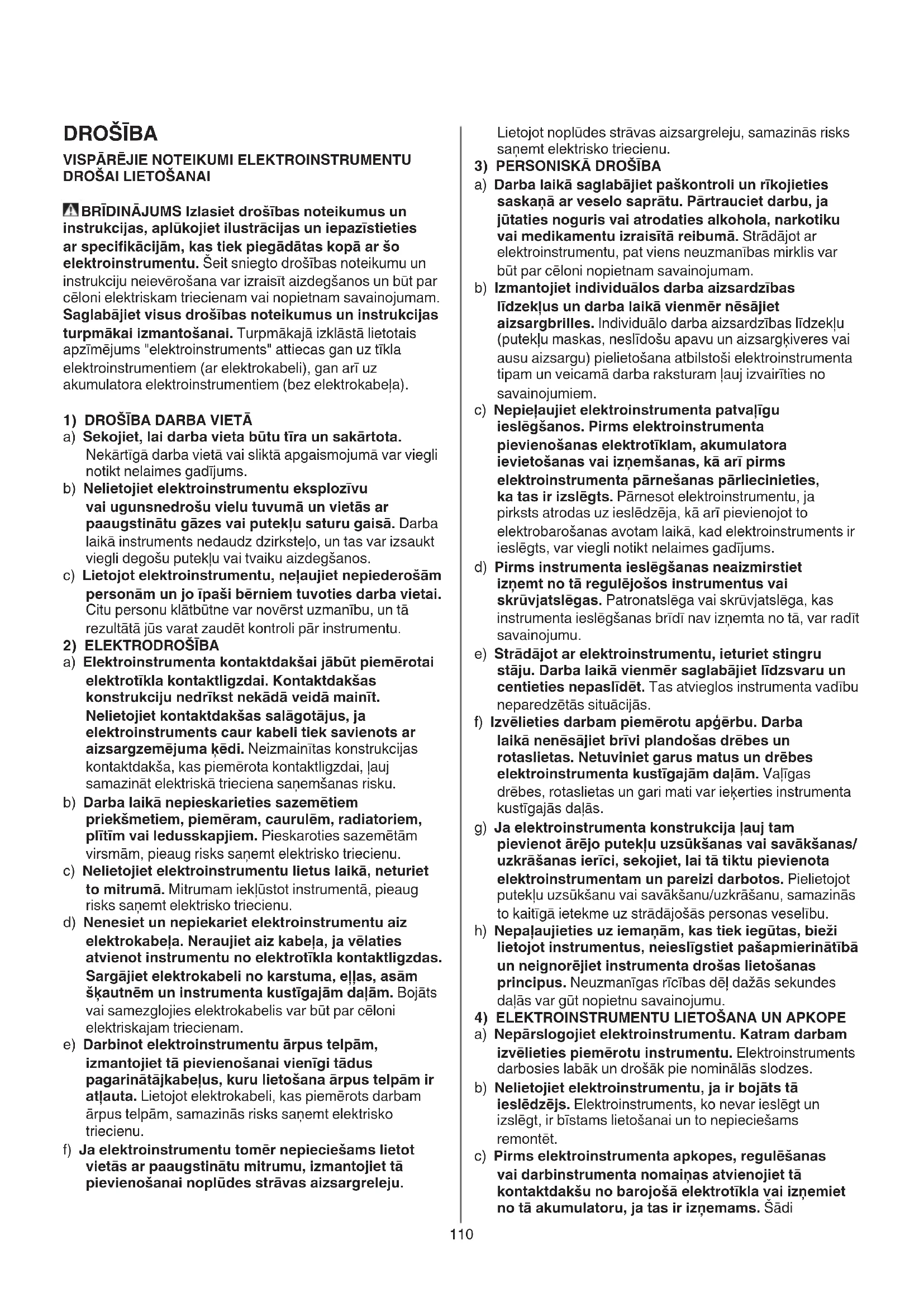 - Veicot darbu, kura laikā darbinstruments vai skrūve var skart slēptus elektriskos vadus, turiet instrumentu tikai aiz izolētajām virsmām (darbinstrumentam skarot spriegumnesošus vadus, spriegums nonāk arī uz instrumenta metāla daļām un var būt par cēloni elektriskajam triecienam)
