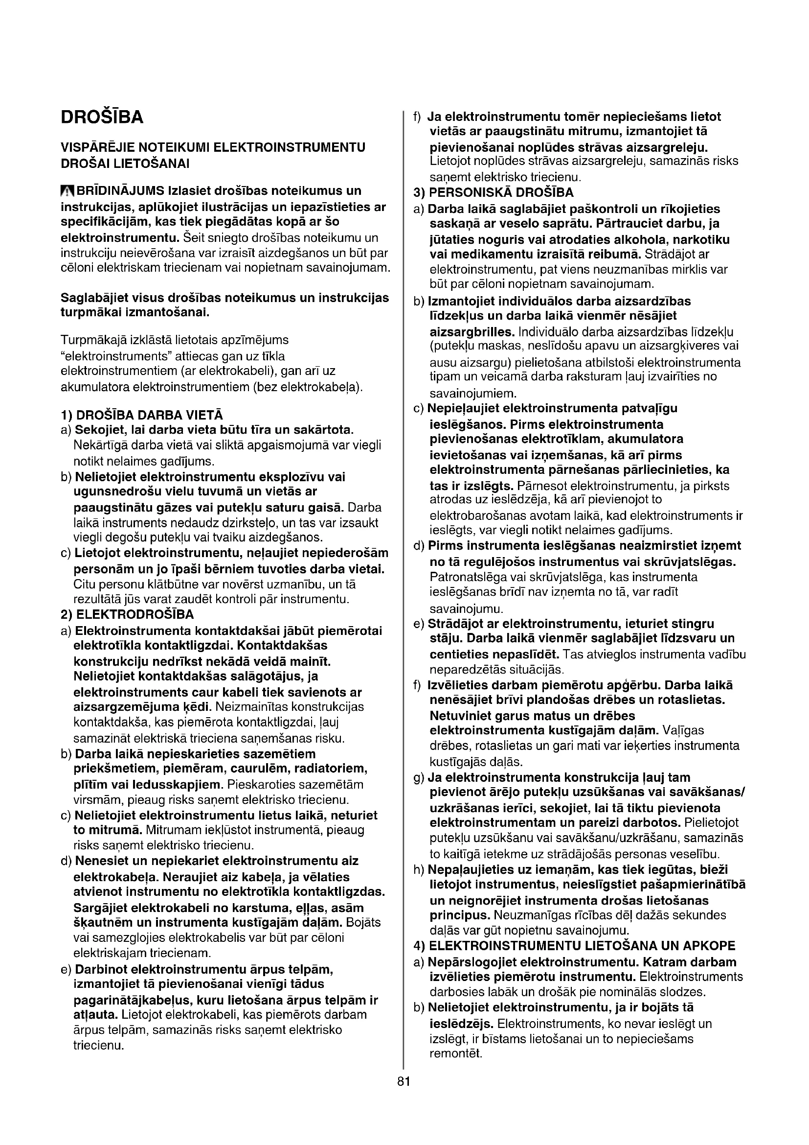 a) Nepārslogojiet elektroinstrumentu. Katram darbam izvēlieties piemērotu instrumentu. Elektroinstruments darbosies labāk un drošāk pie nominālās slodzes. b) Nelietojiet elektroinstrumentu, ja ir bojāts tā ieslēdzējs. Elektroinstruments, ko nevar ieslēgt un izslēgt, ir bīstams lietošanai un to nepieciešams remontēt.82 c) Pirms elektroinstrumenta apkopes, regulēšanas vai darbinstrumenta nomaiņas atvienojiet tā kontaktdakšu no barojošā elektrotīkla vai izņemiet no tā akumulatoru, ja tas ir izņemams. Šādi iespējams samazināt elektroinstrumenta nejaušas ieslēgšanās risku. d) Elektroinstrumentu, kas netiek darbināts, uzglabājiet piemērotā vietā, kur tas nav sasniedzams bērniem un personām, kuras neprot rīkoties ar instrumentu. Ja elektroinstrumentu lieto nekompetentas personas, tas var apdraudēt cilvēku veselību. e) Savlaicīgi apkalpojiet elektroinstrumentus un to piederumus. Pārbaudiet, vai kustīgās daļas darbojas bez traucējumiem un nav iespīlētas, vai kāda no daļām nav salauzta vai bojāta, vai katra no tām pareizi funkcionē un pilda tai paredzēto uzdevumu. Nodrošiniet, lai bojātās daļas tiktu savlaicīgi nomainītas vai remontētas pilnvarotā remontu darbnīcā. Daudzi nelaimes gadījumi notiek tāpēc, ka elektroinstruments pirms lietošanas nav pienācīgi apkalpots. f) Savlaicīgi notīriet un uzasiniet griezošos darbinstrumentus. Rūpīgi kopti instrumenti, kas apgādāti ar asiem griezējinstrumentiem, ļauj strādāt daudz ražīgāk un ir vieglāk vadāmi. g) Lietojiet vienīgi tādus elektroinstrumentus, papildpiederumus, darbinstrumentus utt., kas paredzēti attiecīgajam pielietojuma veidam. Bez tam jāņem vērā arī konkrētie darba apstākļi un pielietojuma īpatnības. Elektroinstrumentu lietošana citiem mērķiem, nekā to ir paredzējusi ražotājfirma, ir bīstama un var novest pie neparedzamām sekām. h) Uzturiet elektroinstrumenta rokturus un noturvirsmas sausas un tīras, sargājiet tās no eļļas un smērvielām. Slideni rokturi un noturvirsmas traucē efektīvi rīkoties ar elektroinstrumentu un to droši vadīt neparedzētās situācijās.