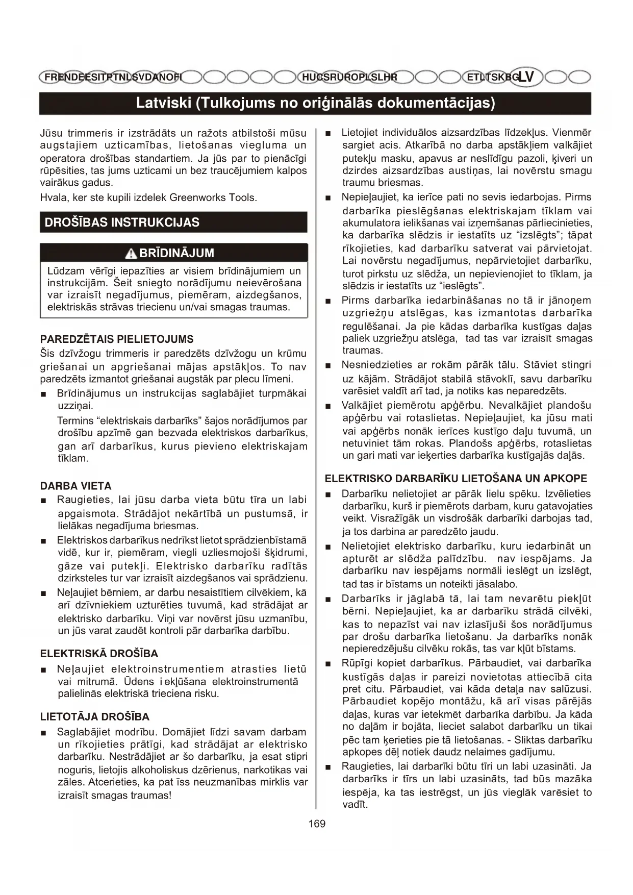 INSTRUKCIJAS n Pirms akumulatora ievietošanas ierīcē pārliecinieties, ka slēdzis ir pārslēgts aptures stāvoklī vai bloķētā stāvoklī. Ievietojot akumulatoru darbarīkā, kurš ir ieslēgts, jūs varat izraisīt nelaimes gadījumu. n Darbarīka akumulatoru drīkst uzlādēt tikai ar tādu uzlādētāju, kuru ir noteicis ražotājuzņēmums. Uzlādētājs, kurš ir piemērots tikai noteiktam akumulatoru veidam, var izraisīt aizdegšanos, ja to lieto, lai uzlādētu kāda cita veida akumulatoru. n Bezvada darbarīku drīkst lietot tikai ar noteikta veida akumulatoru. Ja lietojat cita veida akumulatoru, tad var notikt aizdegšanās. n Kad akumulatoru nelietojat, raugieties, ka tā tuvumā nebūtu metāla priekšmetu, piemēram, papīra saspraužu, monētu, atslēgu, skrūvju, naglu un citu lietu, kas var savienot akumulatora kontaktus. Ja notiek akumulatora kontaktu īssavienojums, tad ir iespējami apdegumi un var izcelties ugunsgrēks. n Ja, darbarīku nepareizi lietojot, noplūst akumulatora šķidrums, tad nekādā gadījumā nepieskarieties šim šķidrumam. Ja notiek noplūde, tad šķidruma skartās vietas noskalojiet ar tīru ūdeni. Ja akumulatora šķidrums nonāk acīs, tad vērsieties pie ārsta. Šķidrums, kas izplūst no akumulatora, var radīt kairinājumu vai apdegumu. APKOPE n Darbarīka labošana ir jāveic kvalificētam meistaram, izmantojot tikai oriģinālās rezerves daļas. Ja tas tiks ievērots, darbarīks būs droši lietojams. DZÎVŽOGU TRIMMERA DROŠÎBAS BRÎDINÂJUMI n Turiet visas ķermeņa daļas drošā attālumā no griezēja asmens. Ja asmeņi ir kustoši, nenoņemiet nogriezto materiālu, kā arī neturiet nogriežamo materiālu. Ja attīriet no iesprūdušā materiāla, pārliecinieties, ka slēdzis ir atslēgts. Neuzmanīga rīcība jebkurā dzīvžogu trimmera darbības brīdī var izraisīt nopietnas personāla traumas. n Pārnēsājiet dzīvžogu trimmeri aiz roktura ar atslēgtu griezēja asmeni. Ja transportējiet vai uzglabājiet dzīvžogu trimmeri, vienmēr uzlieciet ierīces pārvalku. Pareiza apiešanās ar dzīvžogu trimmeri samazinās personāla traumēšanas iespējas ar griezēja asmeņiem. n Turiet kabeli attālu no griešanas vietas. Darbības laikā kabelis var būt apslēpts zaros un var nejauši tikt sagriezts ar asmeni. LŪDZAM IEPAZĪTIES AR VISĀM ŠEIT SNIEGTAJĀM DROŠĪBAS INSTRUKCIJĀM UN TIKAI TAD SĀKT DARBARĪKA LIETOŠANU. n Uzmanīgi izlasiet visas drošības instrukcijas. Izpētiet un iemācieties, kā drīkst lietot šo darbarīku, iepazīstieties ar tā darbības principiem. n Nestrādājiet ar šo darbarīku, ja esat stipri noguris, apslimis, lietojis alkoholiskus dzērienus vai narkotikas vai tad, ja lietojat zāles. n Pirms sākat lietot darbarīku, pārbaudiet, vai tas ir darba kārtībā. Nomainiet bojātās detaļas. Pārliecinieties, ka nenotiek akumulatora šķidruma noplūde. n Pārliecinieties, ka visi stiprinājumi un aizsarglīdzekļi ir pareizi uzstādīti un nostiprināti. Ja asmens vai jebkura cita detaļa ir ieplaisājusi vai citādi bojāta, tad tā jānomaina. Pārbaudiet, vai asmens ir pareizi uzstādīts un stingri nostiprināts. Tādējādi novērsīsiet smagu traumu briesmas gan sev, gan citām personām, kā arī darbarīka bojājumu risku. n Lietojiet veicamajam darbam piemērotu darbarīku. Krūmgriezi drīkst izmantot tikai tiem darbiem, kuriem tas ir paredzēts. n Nelietojiet krūmgriezi, ja to nav iespējams iedarbināt un apturēt ar slēdža palīdzību. Ja darbarīku nav iespējams normāli ieslēgt un izslēgt, tad tas ir bīstams un noteikti jāsalabo. n Pirms darba uzsākšanas atbrīvojiet darba zonu. Tur nedrīkst atrasties stieples, elektrības vadi, auklas un citi priekšmeti, kas var ieķerties asmenī. n Darba zonas tuvumā nedrīkst atrasties bērni, ar darbu nesaistītas personas, kā arī mājdzīvnieki. Bērni, nepiederošas personas un mājdzīvnieki nedrīkst atrasties tuvāk par 15 m, jo ierīces darba laikā ir iespējama negaidīta dažādu priekšmetu izsviešana. Personām, kuras tuvojas darba vietai, ieteicams lietot aizsargbrilles. Ja darba zonai tuvojas nepiederoša persona, tad nekavējoties apturiet krūmgriezi. n Lai novērstu elektriskās strāvas trieciena briesmas, uzlādētāju nedrīkst pakļaut lietus vai mitruma iedarbībai. n Strādājot ar krūmgriezi, rokas nedrīkst būt mitras. n Krūmgriezi aizliegts lietot bērniem, kas jaunāki par 15 gadiem, un personām, kurām nav šā darbarīka lietošanas pieredzes. n Lai mazinātu smagu acu traumu briesmas, krūmgrieža lietošanas laikā noteikti valkājiet aizsargbrilles. 170Latviski (Tulkojums no oriģinālās dokumentācijas) F R E N D E E S I T P T N L S V D A N O F I H U CS RU R O P L S L H R E T L T L V SK B G E N F R D E E S I T P T N L S V D A N O F I D E F R E N E S I T P T N L S V D A N O F I E S F R E N D E I T P T N L S V D A N O F I I T F R E N D E E S P T NL S V D A N O F I P T F R E N D E E S IT N L SV D A N O F I N L F R E N D E E S IT P T S V D A N O F I S V F R E N D E E S IT P T NL D A N O F I D A F R E N D E E S IT P T NL S V N O F I N O F R E N D E E S IT P T NL S V D A F I F I F R E N D E E S IT P T NL S V D A NO H U C S R U RO P L S L H R H U C S R U RO P L S L H R H U C S R U RO P L S L H R H U C S R U RO P L S L H R H U C S R U RO P L S L H R H U C S R U RO P L S L H R H U C S R U RO P L S L H R H U C S R U RO P L S L H R H U C S R U RO P L S L H R H U C S R U R O P L S L H R E T L T L V SK B G E T L T L V SK B G E T L T L V SK B G E T L T L V SK B G E T L T L V SK B G E T L T L V SK B G E T L T L V SK B G E T L T L V SK B G E T L T L V SK B G E T L T L V SK B G F R E N D E E S IT P T NL S V D A NO FI F R E N D E E S IT P T NL S V D A NO FI F R E N D E E S IT P T NL S V D A NO FI F R E N D E E S IT P T NL S V D A NO FI F R E N D E E S IT P T NL S V D A NO FI F R E N D E E S IT P T NL S V D A NO FI F R E N D E E S IT P T NL S V D A NO FI H U C S R U R O PL SL HR E T L T