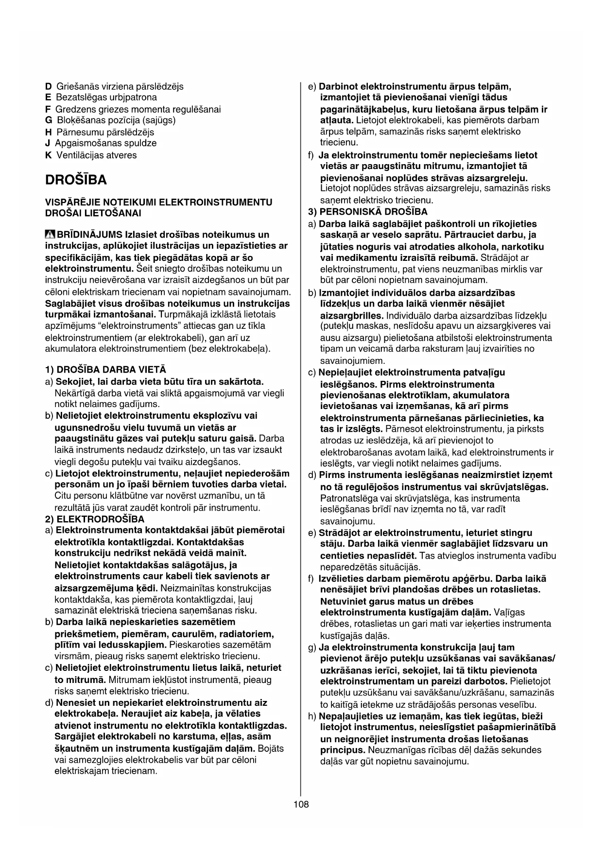 - Izlasiet un saglabājiet šo pamācību 3 TEHNISKIE PARAMETRI 1 Maks. griezes moments cietam skrūvēšanas režīmam atbilstoši standartam ISO 5393 : 36Nm INSTRUMENTA ELEMENTI 2 A Uzlādes ierīce B Uzlādes ierīces indikators (sarkans) C Ieslēdzējs un griešanās ātruma regulators108 D Griešanās virziena pārslēdzējs E Bezatslēgas urbjpatrona F Gredzens griezes momenta regulēšanai G Bloķēšanas pozīcija (sajūgs) H Pārnesumu pārslēdzējs J Apgaismošanas spuldze K Ventilācijas atveres DROŠĪBA