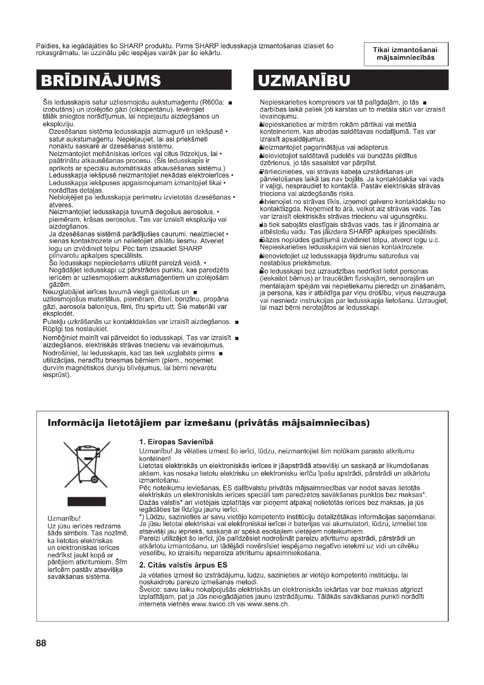 UZMANĪBU Nepieskarieties kompresors vai tā palīgdaļām, jo tās ■ darbības laikā paliek ļoti karstas un to metāla stūri var izraisīt ievainojumu. Nepieskarieties ar mitrām rokām pārtikai vai metāla ■ konteineriem, kas atrodas saldētavas nodalījumā. Tas var izraisīt apsaldējumus. Neizmantojiet pagarinātājus vai adapterus. ■ Neievietojiet saldētavā pudelēs vai bundžās pildītus ■ dzērienus, jo tās sasalstot var pārplīst. Pārliecinieties, vai strāvas kabeļa uzstādīšanas un ■ pārvietošanas laikā tas nav bojāts. Ja kontaktdakša vai vads ir vaļīgi, nespraudiet to kontaktā. Pastāv elektriskās strāvas trieciena vai aizdegšanās risks. Atvienojiet no strāvas tīkls, izņemot galveno kontaktdakšu no ■ kontaktlizgda. Neņemiet to ārā, velkot aiz strāvas vads. Tas var izraisīt elektriskās strāvas triecienu vai ugunsgrēku. Ja tiek sabojāts elastīgais strāvas vads, tas ir jānomaina ar ■ atbilstošu vadu. Tas jāizdara SHARP apkalpes speciālists. Gāzes noplūdes gadījumā izvēdiniet telpu, atverot logu u.c. ■ Nepieskarieties ledusskapim vai sienas kontaktrozete. Nenovietojiet uz ledusskapja šķidrumu saturošus vai ■ nestabilus priekšmetus. Šo ledusskapi bez uzraudzības nedrīkst lietot personas ■ (ieskaitot bērnus) ar traucētām ziskajām, sensorajām un mentālajām spējām vai nepietiekamu pieredzi un zināšanām, ja persona, kas ir atbildīga par viņu drošību, viņus neuzrauga vai nesniedz instrukcijas par ledusskapja lietošanu. Uzraugiet, lai mazi bērni nerotaļātos ar ledusskapi. Informācija lietotājiem par izmešanu (privātās mājsaimniecības)