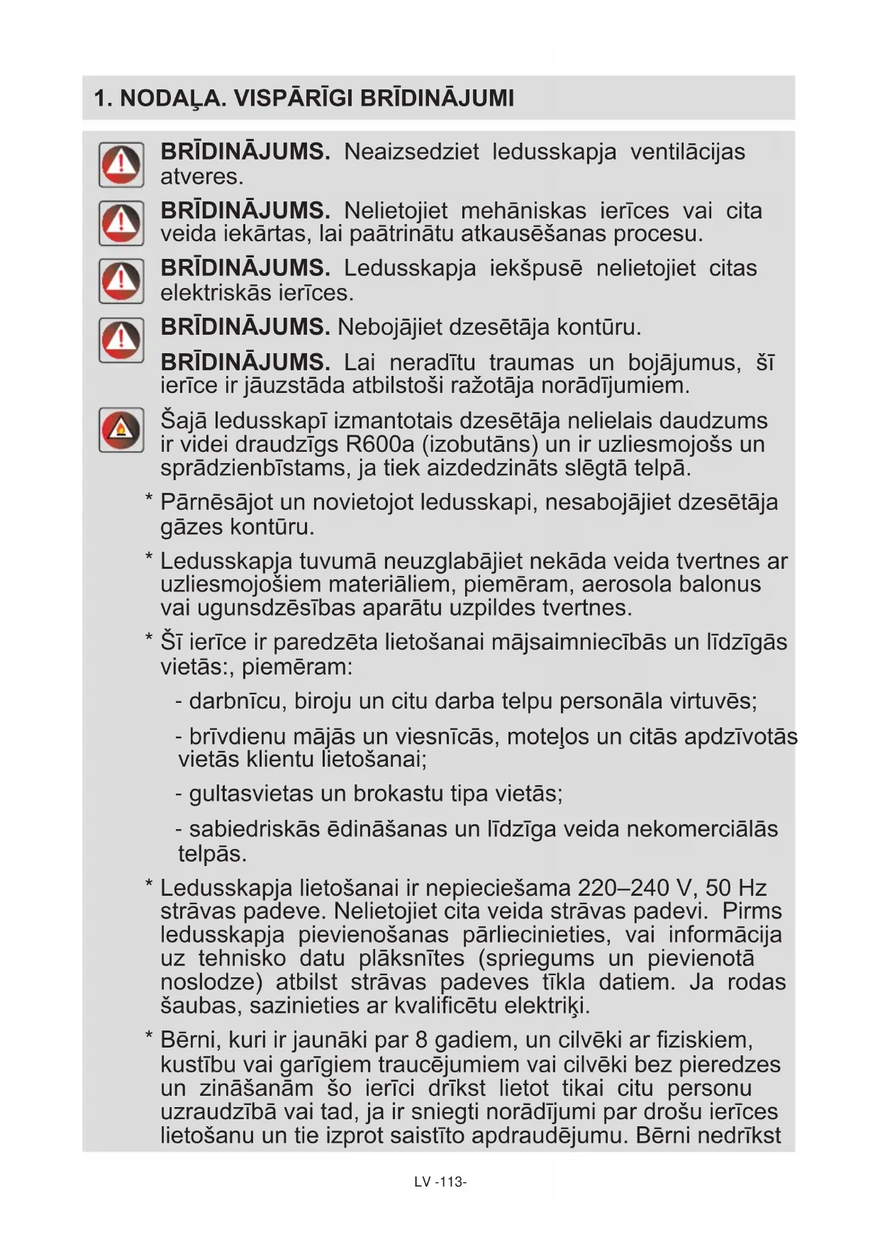 BRĪDINĀJUMS. Neaizsedziet ledusskapja ventilācijas atveres. BRĪDINĀJUMS. Nelietojiet mehāniskas ierīces vai cita veida iekārtas, lai paātrinātu atkausēšanas procesu. BRĪDINĀJUMS. Ledusskapja iekšpusē nelietojiet citas elektriskās ierīces. BRĪDINĀJUMS. Nebojājiet dzesētāja kontūru. BRĪDINĀJUMS. Lai neradītu traumas un bojājumus, šī ierīce ir jāuzstāda atbilstoši ražotāja norādījumiem. Šajā ledusskapī izmantotais dzesētāja nelielais daudzums ir videi draudzīgs R600a (izobutāns) un ir uzliesmojošs un sprādzienbīstams, ja tiek aizdedzināts slēgtā telpā.