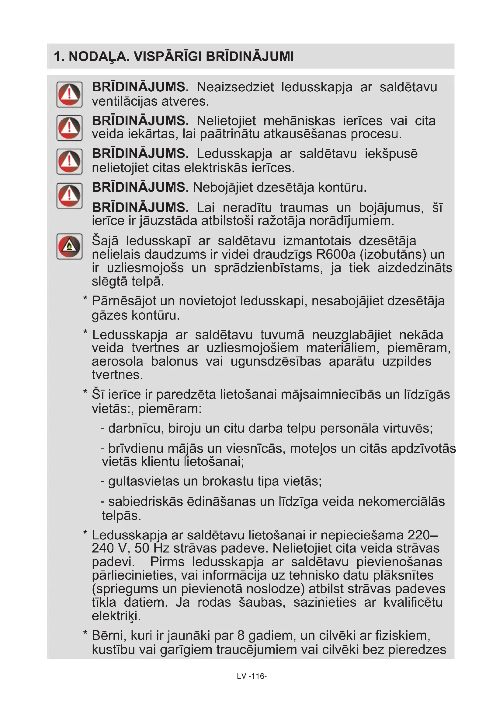 BRĪDINĀJUMS. Neaizsedziet ledusskapja ar saldētavu ventilācijas atveres. BRĪDINĀJUMS. Nelietojiet mehāniskas ierīces vai cita veida iekārtas, lai paātrinātu atkausēšanas procesu. BRĪDINĀJUMS. Ledusskapja ar saldētavu iekšpusē nelietojiet citas elektriskās ierīces. BRĪDINĀJUMS. Nebojājiet dzesētāja kontūru. BRĪDINĀJUMS. Lai neradītu traumas un bojājumus, šī ierīce ir jāuzstāda atbilstoši ražotāja norādījumiem. Šajā ledusskapī ar saldētavu izmantotais dzesētāja nelielais daudzums ir videi draudzīgs R600a (izobutāns) un ir uzliesmojošs un sprādzienbīstams, ja tiek aizdedzināts slēgtā telpā.