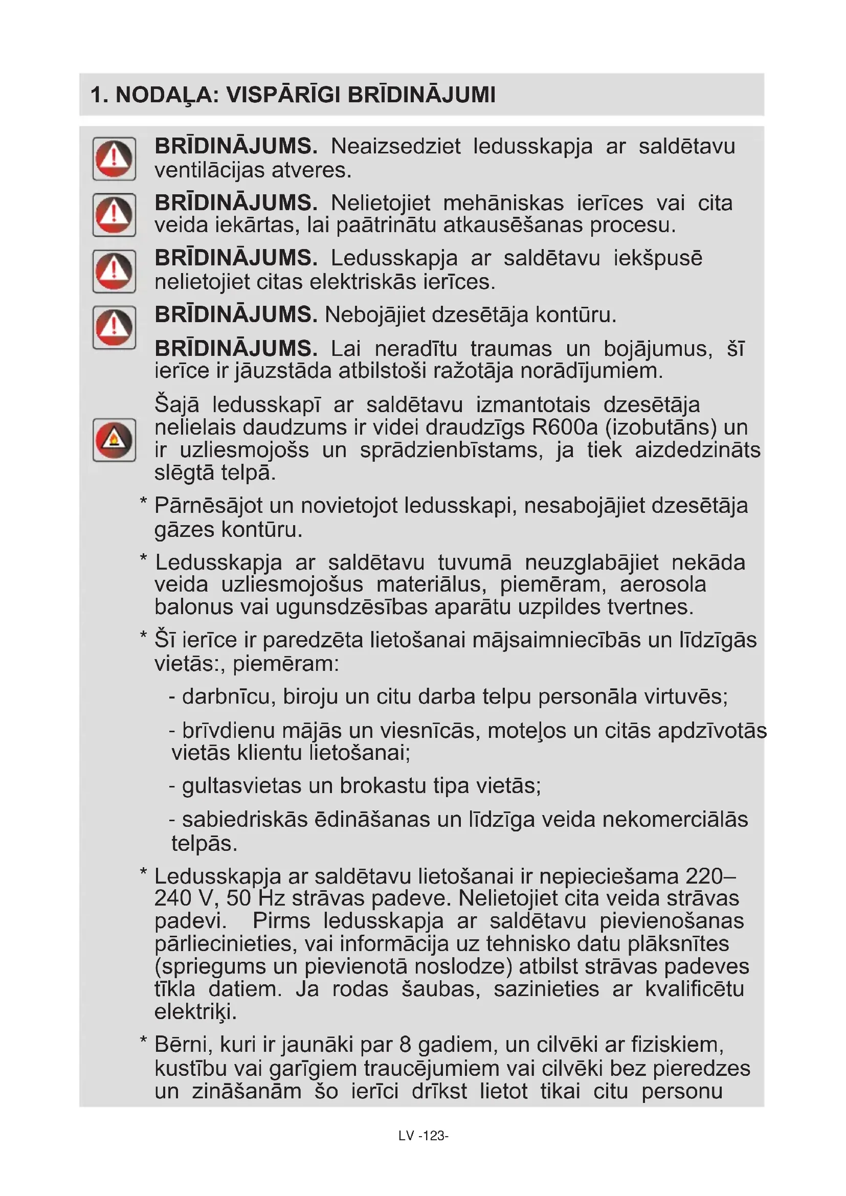 BRĪDINĀJUMS. Neaizsedziet ledusskapja ar saldētavu ventilācijas atveres. BRĪDINĀJUMS. Nelietojiet mehāniskas ierīces vai cita veida iekārtas, lai paātrinātu atkausēšanas procesu. BRĪDINĀJUMS. Ledusskapja ar saldētavu iekšpusē nelietojiet citas elektriskās ierīces. BRĪDINĀJUMS. Nebojājiet dzesētāja kontūru. BRĪDINĀJUMS. Lai neradītu traumas un bojājumus, šī ierīce ir jāuzstāda atbilstoši ražotāja norādījumiem. Šajā ledusskapī ar saldētavu izmantotais dzesētāja nelielais daudzums ir videi draudzīgs R600a (izobutāns) un ir uzliesmojošs un sprādzienbīstams, ja tiek aizdedzināts slēgtā telpā.