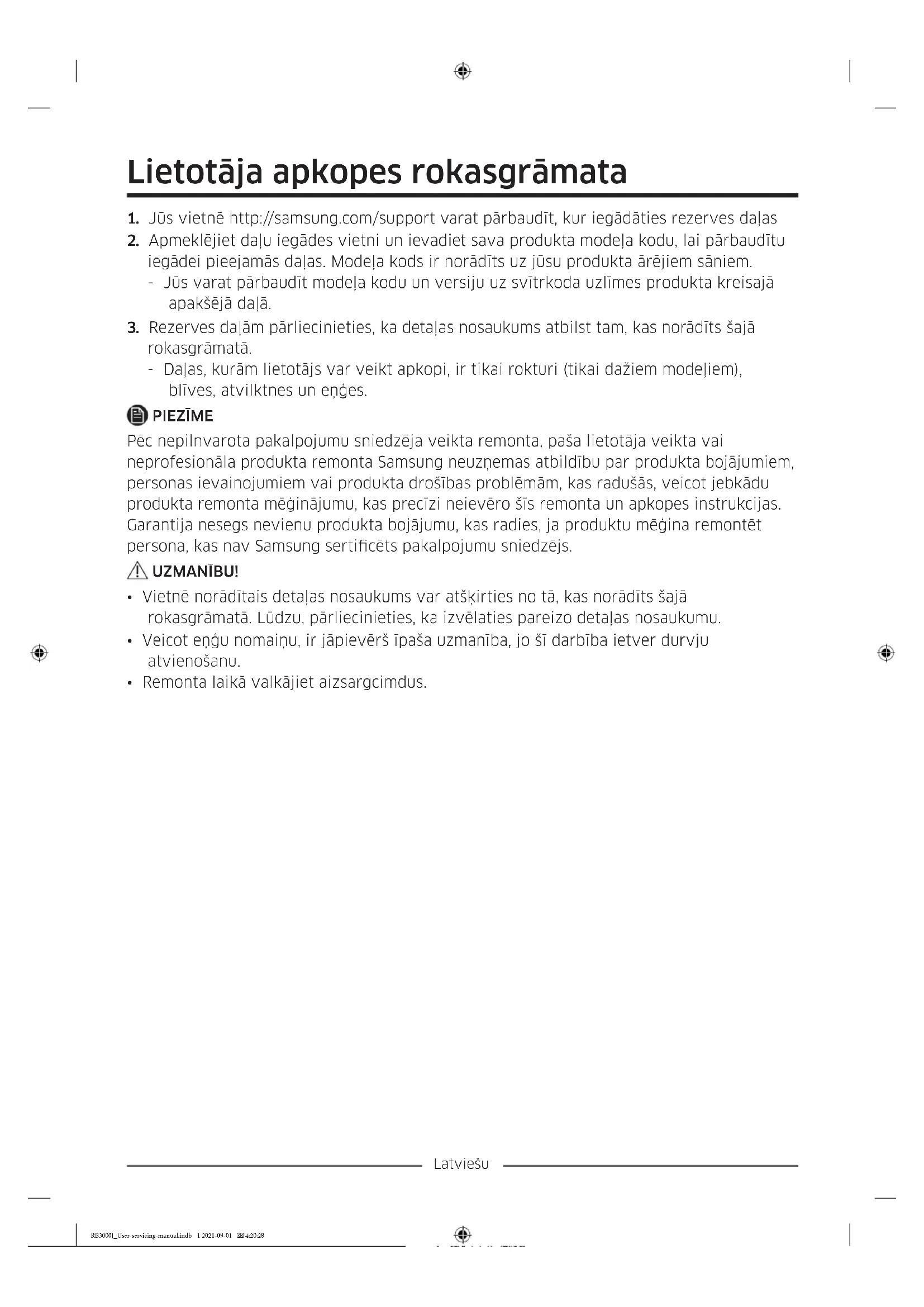 rokasgrāmatā. - Daļas, kurām lietotājs var veikt apkopi, ir tikai rokturi (tikai dažiem modeļiem), blīves, atvilktnes un eņģes. PIEZĪME Pēc nepilnvarota pakalpojumu sniedzēja veikta remonta, paša lietotāja veikta vai neprofesionāla produkta remonta Samsung neuzņemas atbildību par produkta bojājumiem, personas ievainojumiem vai produkta drošības problēmām, kas radušās, veicot jebkādu produkta remonta mēģinājumu, kas precīzi neievēro šīs remonta un apkopes instrukcijas. Garantija nesegs nevienu produkta bojājumu, kas radies, ja produktu mēģina remontēt persona, kas nav Samsung serticēts pakalpojumu sniedzējs. UZMANĪBU!