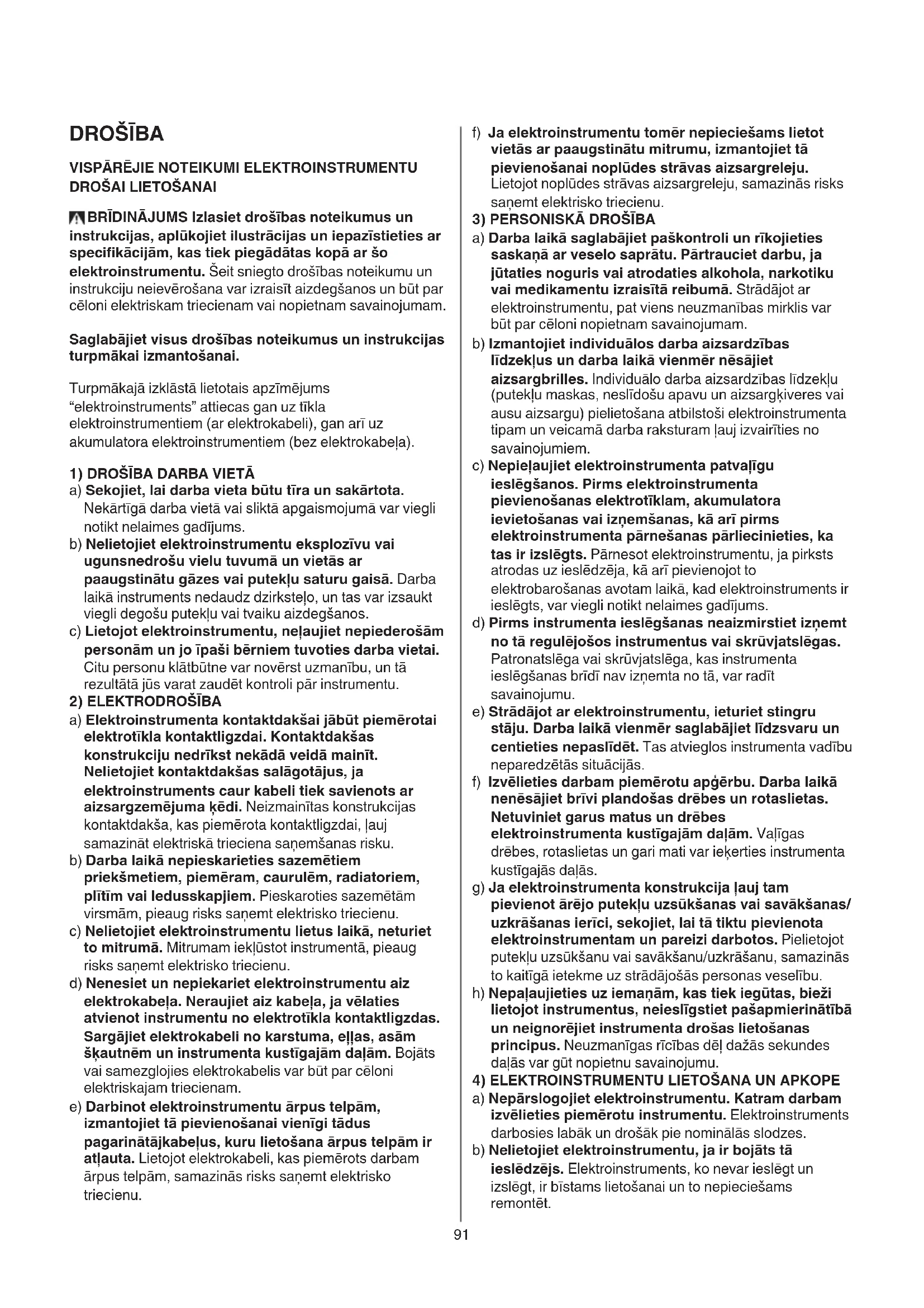 a) Nepārslogojiet elektroinstrumentu. Katram darbam izvēlieties piemērotu instrumentu. Elektroinstruments darbosies labāk un drošāk pie nominālās slodzes. b) Nelietojiet elektroinstrumentu, ja ir bojāts tā ieslēdzējs. Elektroinstruments, ko nevar ieslēgt un izslēgt, ir bīstams lietošanai un to nepieciešams remontēt.92 c) Pirms elektroinstrumenta apkopes, regulēšanas vai darbinstrumenta nomaiņas atvienojiet tā kontaktdakšu no barojošā elektrotīkla vai izņemiet no tā akumulatoru, ja tas ir izņemams. Šādi iespējams samazināt elektroinstrumenta nejaušas ieslēgšanās risku. d) Elektroinstrumentu, kas netiek darbināts, uzglabājiet piemērotā vietā, kur tas nav sasniedzams bērniem un personām, kuras neprot rīkoties ar instrumentu. Ja elektroinstrumentu lieto nekompetentas personas, tas var apdraudēt cilvēku veselību. e) Savlaicīgi apkalpojiet elektroinstrumentus un to piederumus. Pārbaudiet, vai kustīgās daļas darbojas bez traucējumiem un nav iespīlētas, vai kāda no daļām nav salauzta vai bojāta, vai katra no tām pareizi funkcionē un pilda tai paredzēto uzdevumu. Nodrošiniet, lai bojātās daļas tiktu savlaicīgi nomainītas vai remontētas pilnvarotā remontu darbnīcā. Daudzi nelaimes gadījumi notiek tāpēc, ka elektroinstruments pirms lietošanas nav pienācīgi apkalpots. f) Savlaicīgi notīriet un uzasiniet griezošos darbinstrumentus. Rūpīgi kopti instrumenti, kas apgādāti ar asiem griezējinstrumentiem, ļauj strādāt daudz ražīgāk un ir vieglāk vadāmi. g) Lietojiet vienīgi tādus elektroinstrumentus, papildpiederumus, darbinstrumentus utt., kas paredzēti attiecīgajam pielietojuma veidam. Bez tam jāņem vērā arī konkrētie darba apstākļi un pielietojuma īpatnības. Elektroinstrumentu lietošana citiem mērķiem, nekā to ir paredzējusi ražotājfirma, ir bīstama un var novest pie neparedzamām sekām. h) Uzturiet elektroinstrumenta rokturus un noturvirsmas sausas un tīras, sargājiet tās no eļļas un smērvielām. Slideni rokturi un noturvirsmas traucē efektīvi rīkoties ar elektroinstrumentu un to droši vadīt neparedzētās situācijās.