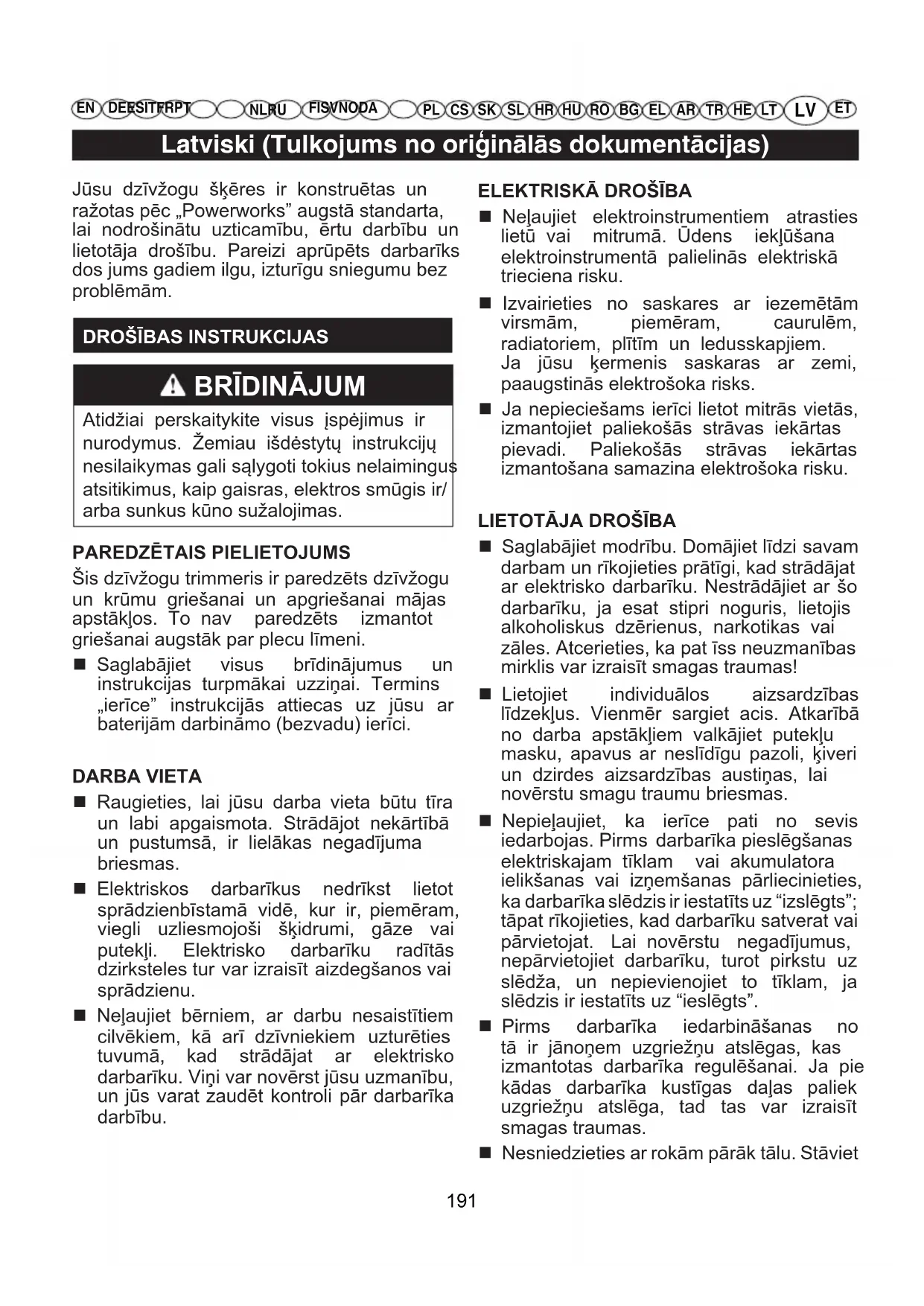 Šis dzīvžogu trimmeris ir paredzēts dzīvžogu un krūmu griešanai un apgriešanai mājas apstākļos. To nav paredzēts izmantot griešanai augstāk par plecu līmeni. Saglabājiet visus brīdinājumus un instrukcijas turpmākai uzziņai. Termins „ierīce” instrukcijās attiecas uz jūsu ar baterijām darbināmo (bezvadu) ierīci. DARBA VIETA Raugieties, lai jūsu darba vieta būtu tīra un labi apgaismota. Strādājot nekārtībā un pustumsā, ir lielākas negadījuma briesmas. Elektriskos darbarīkus nedrīkst lietot sprādzienbīstamā vidē, kur ir, piemēram, viegli uzliesmojoši šķidrumi, gāze vai putekļi. Elektrisko darbarīku radītās dzirksteles tur var izraisīt aizdegšanos vai sprādzienu. Neļaujiet bērniem, ar darbu nesaistītiem cilvēkiem, kā arī dzīvniekiem uzturēties tuvumā, kad strādājat ar elektrisko darbarīku. Viņi var novērst jūsu uzmanību, un jūs varat zaudēt kontroli pār darbarīka darbību.