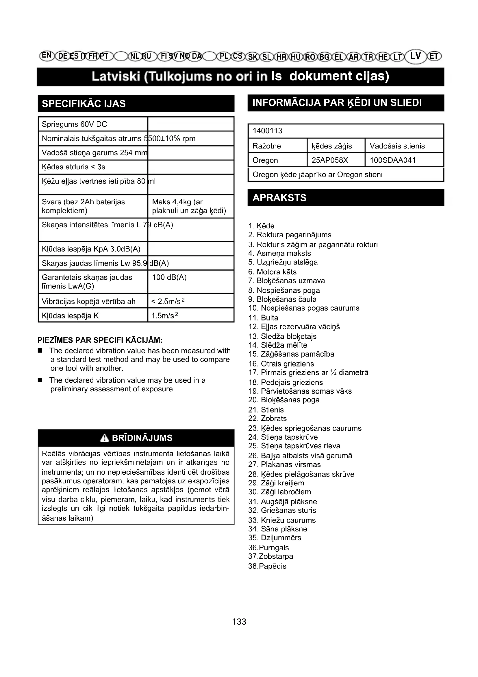 1400113Ražotne ķēdes zāģis Vadošais stienisOregon 25AP058X 100SDAA041Oregon ķēde jāaprīko ar Oregon stieni APRAKSTS 1. Ķēde2. Roktura pagarinājums3. Rokturis zāģim ar pagarinātu rokturi4. Asmeņa maksts5. Uzgriežņu atslēga6. Motora kāts7. Bloķēšanas uzmava8. Nospiešanas poga9. Bloķēšanas čaula10. Nospiešanas pogas caurums11. Bulta12. Eļļas rezervuāra vāciņš13. Slēdža bloķētājs14. Slēdža mēlīte15. Zāģēšanas pamācība16. Otrais grieziens17. Pirmais grieziens ar ¼ diametrā18. Pēdējais grieziens19. Pārvietošanas somas vāks20. Bloķēšanas poga21. Stienis22. Zobrats23. Ķēdes spriegošanas caurums 24. Stieņa tapskrūve25. Stieņa tapskrūves rieva26. Baļķa atbalsts visā garumā27. Plakanas virsmas 28. Ķēdes pielāgošanas skrūve29. Zāģi kreiļiem30. Zāģi labročiem31. Augšējā plāksne32. Griešanas stūris33. Kniežu caurums34. Sāna plāksne35. Dziļummērs36.Purngals37.Zobstarpa38.Papēdis 133ls dokument cijas)