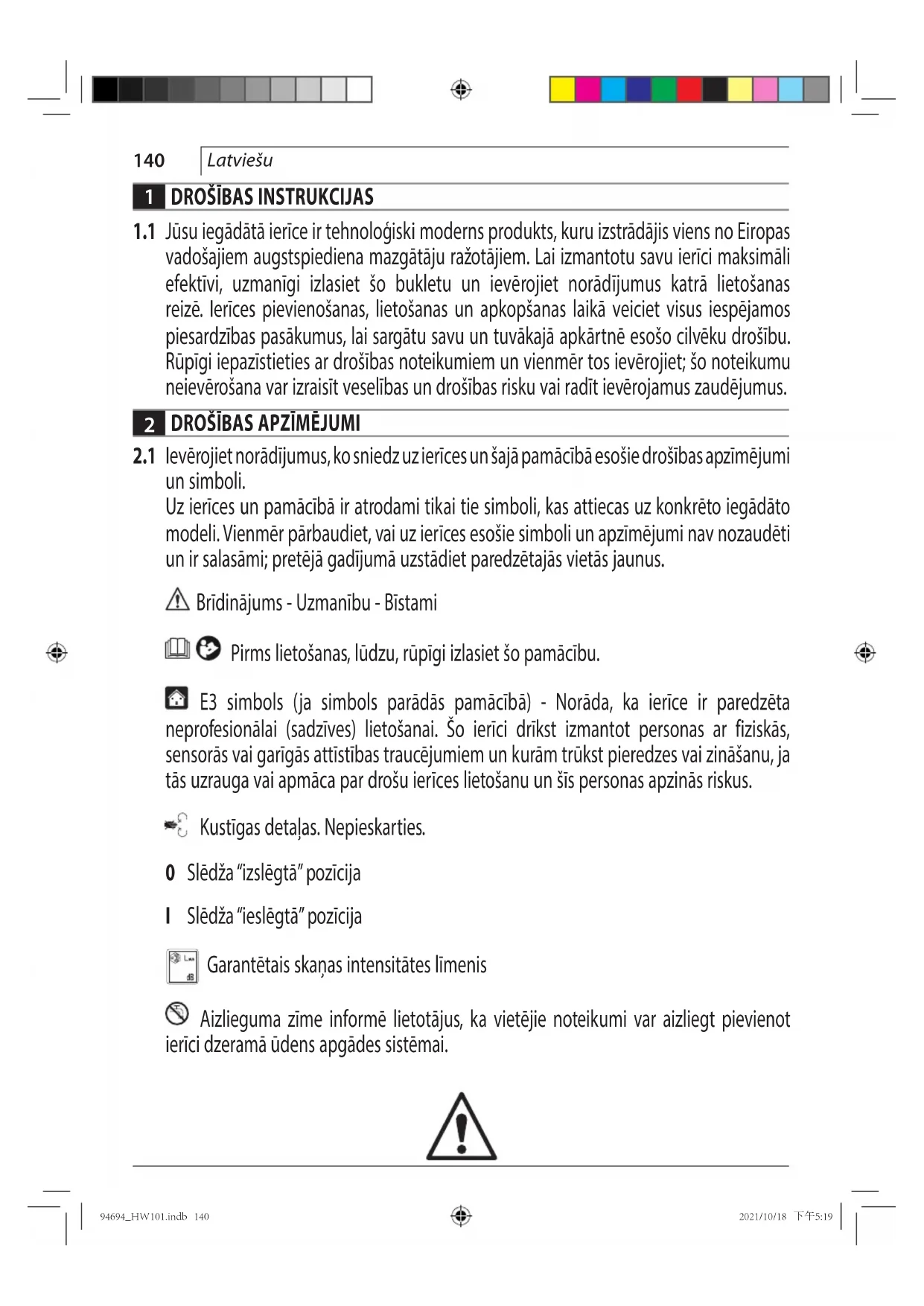 un simboli. Uz ierīces un pamācībā ir atrodami tikai tie simboli, kas attiecas uz konkrēto iegādāto modeli. Vienmēr pārbaudiet, vai uz ierīces esošie simboli un apzīmējumi nav nozaudēti un ir salasāmi; pretējā gadījumā uzstādiet paredzētajās vietās jaunus. Brīdinājums - Uzmanību - Bīstami Pirms lietošanas, lūdzu, rūpīgi izlasiet šo pamācību. E3 simbols (ja simbols parādās pamācī bā) - Norāda, ka ierīce ir paredzēta neprofesionālai (sadzīves) lietošanai. Šo ierīci drīkst izmantot personas ar fiziskās, sensorās vai garīgās attīstības traucējumiem un kurām trūkst pieredzes vai zināšanu, ja tās uzrauga vai apmāca par drošu ierīces lietošanu un šīs personas apzinās riskus. Kustīgas detaļas. Nepieskarties. 0 Slēdža “izslēgtā” pozīcija I Slēdža “ieslēgtā” pozīcija Garantētais skaņas intensitātes līmenis Aizlieguma zīme informē lietotājus, ka vietējie noteikumi var aizliegt pievienot ierīci dzeramā ūdens apgādes sistēmai. 94694_HW101.indb 14094694_HW101.indb 140 2021/10/18 下午5:192021/10/18 下午5:19141 Latviešu Bīstamības zīme, kas lietotājam atgādina, ka ūdens strūklu nedrīkst vērst pret cilvēkiem, dzīvniekiem, elektroierīcēm vai pašu produktu. Šis produkts atbilst izolācijas klasei II. Tas nozīmē, ka tam ir pastiprināta vai dubulta izolācija (tikai tad, ja simbols parādās uz ierīces). Produkts atbilst attiecīgajām Eiropas direktīvām. E1 simbols - Norāda, ka ierīci nedrīkst izmest kopā ar sadzīves atkritumiem; to var nodot pārdevējam, iegādājoties jaunu ierīci. Ierīces elektriskās un elektroniskās detaļas nedrīkst izmantot atkārtoti neparedzētā veidā, jo tās satur vielas, kas rada veselības apdraudējumu. Tikai ES valstīm Tā kā šajā aprīkojumā ir bīstamas sastāvdaļas, lietotas elektriskās un elektroniskās iekārtas var negatīvi ietekmēt apkārtējo vidi un cilvēka veselību. Elektroierīces un elektroniskās ierīces nedrīkst izmest kopā ar mājsaimniecības atkritumiem! Saskaņā ar Eiropas direktīvu par elektrisko un elektronisko iekārtu atkritumiem un tās pielāgošanu valsts tiesību aktiem lietotas elektriskās un elektroniskās iekārtas ir jāsavāc atsevišķi un jānogādā uz sadzīves atkritumu dalītās savākšanas vietu, ievērojot attiecīgos vides aizsardzības noteikumus. Par to liecina uz iekārtas redzams simbols ar pārsvītrotu atkritumu konteineru uz riteņiem. Izmantojiet dzirdes aizsardzības līdzekļus. Izmantojiet aizsargmasku. Izmantojiet elpceļu aizsardzības līdzekļus. Jāvalkā aizsargcimdi. Jāvalkā aizsargapavi. Jāvalkā aizsargapģērbs. 94694_HW101.indb 14194694_HW101.indb 141 2021/10/18 下午5:192021/10/18 下午5:19142 Latviešu