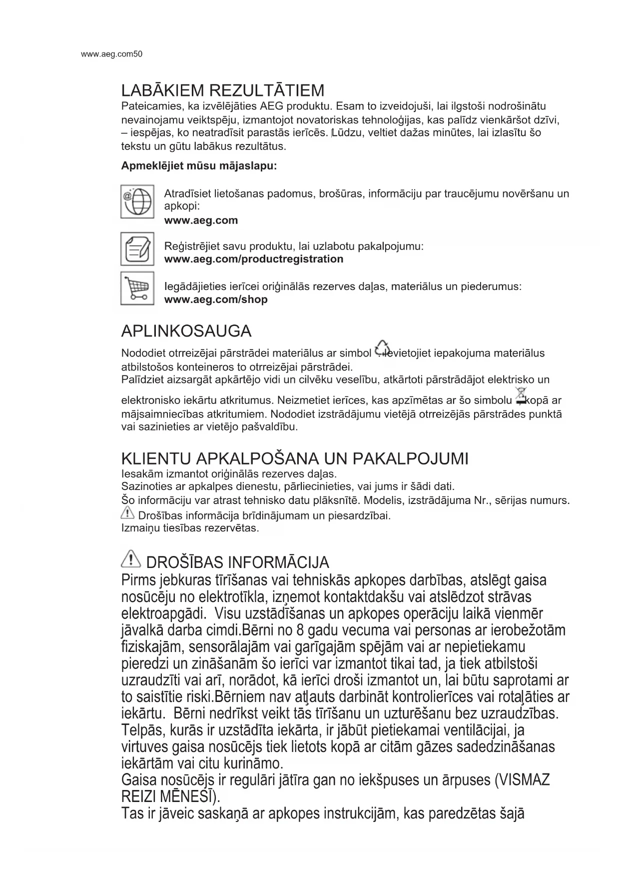 Pateicamies, ka izvēlējāties AEG produktu. Esam to izveidojuši, lai ilgstoši nodrošinātu nevainojamu veiktspēju, izmantojot novatoriskas tehnoloģijas, kas palīdz vienkāršot dzīvi, – iespējas, ko neatradīsit parastās ierīcēs. Lūdzu, veltiet dažas minūtes, lai izlasītu šo tekstu un gūtu labākus rezultātus. Apmeklējiet mūsu mājaslapu: Atradīsiet lietošanas padomus, brošūras, informāciju par traucējumu novēršanu un apkopi: www.aeg.com Reģistrējiet savu produktu, lai uzlabotu pakalpojumu: www.aeg.com/productregistration Iegādājieties ierīcei oriģinālās rezerves daļas, materiālus un piederumus: www.aeg.com/shop APLINKOSAUGA Nododiet otrreizējai pārstrādei materiālus ar simbol . Ievietojiet iepakojuma materiālus atbilstošos konteineros to otrreizējai pārstrādei. Palīdziet aizsargāt apkārtējo vidi un cilvēku veselību, atkārtoti pārstrādājot elektrisko un elektronisko iekārtu atkritumus. Neizmetiet ierīces, kas apzīmētas ar šo simbolu , kopā ar mājsaimniecības atkritumiem. Nododiet izstrādājumu vietējā otrreizējās pārstrādes punktā vai sazinieties ar vietējo pašvaldību.