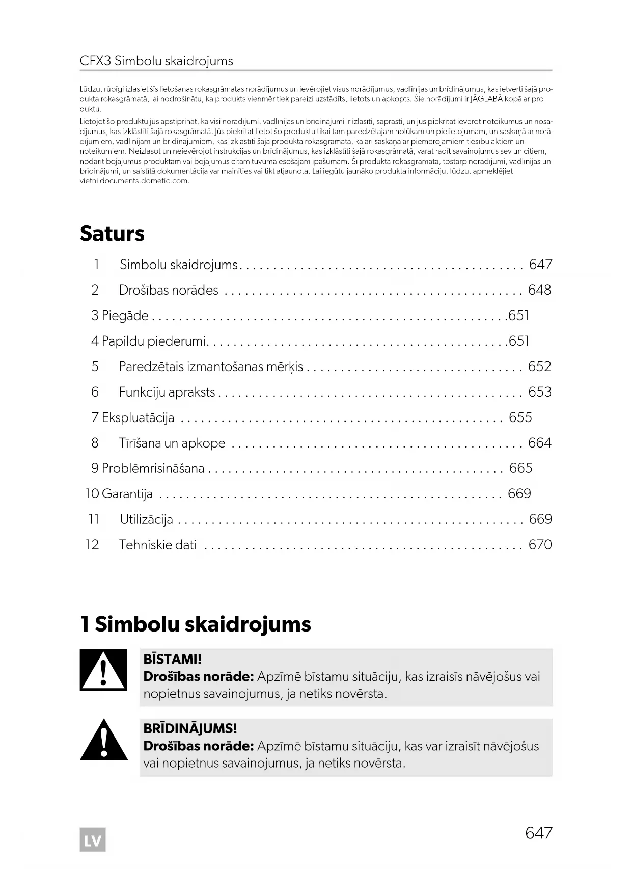 - Lūdzu, rūpīgi izlasiet šīs lietošanas rokasgrāmatas norādījumus un ievērojiet visus norādījumus, vadlīnijas un brīdinājumus, kas ietverti šajā pro- dukta rokasgrāmatā, lai nodrošinātu, ka produkts vienmēr tiek pareizi uzstādīts, lietots un apkopts. Šie norādījumi ir JĀGLABĀ kopā ar pro- duktu. Lietojot šo produktu jūs apstiprināt, ka visi norādījumi, vadlīnijas un brīdinājumi ir izlasīti, saprasti, un jūs piekrītat ievērot noteikumus un nosa- cījumus, kas izklāstīti šajā rokasgrāmatā. Jūs piekrītat lietot šo produktu tikai tam paredzētajam nolūkam un pielietojumam, un saskaņā ar norā- dījumiem, vadlīnijām un brīdinājumiem, kas izklāstīti šajā produkta rokasgrāmatā, kā arī saskaņā ar piemērojamiem tiesību aktiem un noteikumiem. Neizlasot un neievērojot instrukcijas un brīdinājumus, kas izklāstīti šajā rokasgrāmatā, varat radīt savainojumus sev un citiem, nodarīt bojājumus produktam vai bojājumus citam tuvumā esošajam īpašumam. Šī produkta rokasgrāmata, tostarp norādījumi, vadlīnijas un brīdinājumi, un saistītā dokumentācija var mainīties vai tikt atjaunota. Lai iegūtu jaunāko produkta informāciju, lūdzu, apmeklējiet vietni documents.dometic.com. Saturs 1 Simbolu skaidrojums p. 647