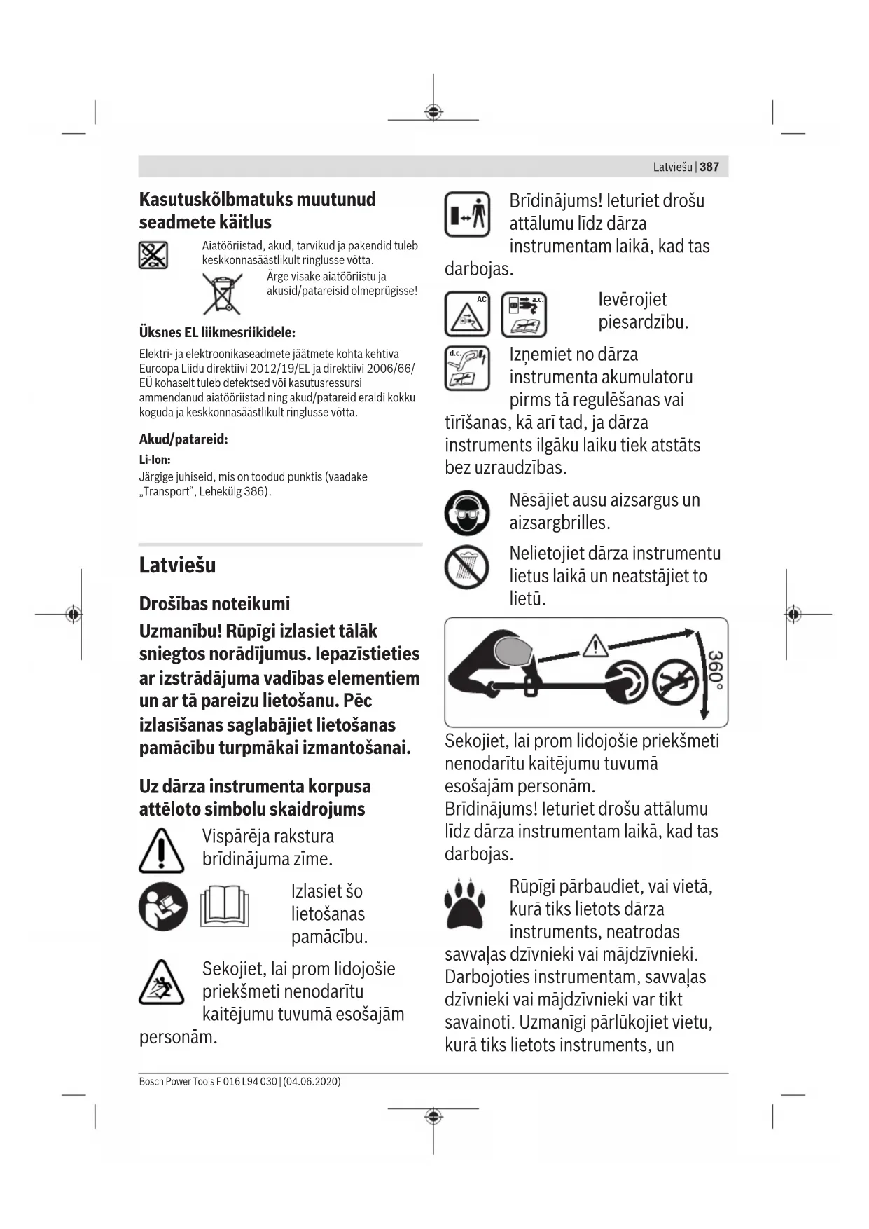 a.c. Ievērojiet piesardzību. d.c. Izņemiet no dārza instrumenta akumulatoru pirms tā regulēšanas vai tīrīšanas, kā arī tad, ja dārza instruments ilgāku laiku tiek atstāts bez uzraudzības. Nēsājiet ausu aizsargus un aizsargbrilles. Nelietojiet dārza instrumentu lietus laikā un neatstājiet to lietū. Sekojiet, lai prom lidojošie priekšmeti nenodarītu kaitējumu tuvumā esošajām personām. Brīdinājums! Ieturiet drošu attālumu līdz dārza instrumentam laikā, kad tas darbojas. Rūpīgi pārbaudiet, vai vietā, kurā tiks lietots dārza instruments, neatrodas savvaļas dzīvnieki vai mājdzīvnieki. Darbojoties instrumentam, savvaļas dzīvnieki vai mājdzīvnieki var tikt savainoti. Uzmanīgi pārlūkojiet vietu, kurā tiks lietots instruments, un Bosch Power Tools F 016 L94 030 | (04.06.2020)388 | Latviešu novāciet tajā atrodošos akmeņus, nūjas, stieples, kaulus un citus svešķermeņus. Lietojot instrumentu, sekojiet, lai tas nenodarītu kaitējumu savvaļas dzīvniekiem un mājdzīvniekiem, kā ari, lai tas nesadurtos ar īsiem koku celmiem, kas slēpjas garajā zālē. Vispārēji drošības noteikumi elektroinstrumentiem u Izlasiet visus drošības noteikumus un instrukcijas, aplūkojiet ilustrācijas un iepazīstieties ar specifikācijām, kas tiek piegādātas kopā ar šo elektroinstrumentu. Šeit sniegto drošības noteikumu un instrukciju neievērošana var izraisīt aizdegšanos un būt par cēloni elektriskajam triecienam vai nopietnam savainojumam. u Pēc izlasīšanas uzglabājiet šos noteikumus turpmākai izmantošanai. u Drošības noteikumos lietotais apzīmējums "elektroinstruments" attiecas gan uz Jūsu tīkla elektroinstrumentiem (ar elektrokabeli), gan arī uz akumulatora elektroinstrumentiem (bez elektrokabeļa). Drošība darba vietā u Uzturiet savu darba vietu tīru un labi apgaismotu. Nekārtīgās un tumšās vietās var viegli notikt nelaimes gadījums. u Nedarbiniet elektroinstrumentus sprādzienbīstamā atmosfērā, piemēram, viegli uzliesmojošu šķidrumu tuvumā un vietās ar paaugstinātu gāzu vai putekļu saturu gaisā. Darba laikā elektroinstruments nedaudz dzirksteļo, un tas var izsaukt viegli degošu putekļu vai tvaiku aizdegšanos. u Darbinot elektroinstrumentu, neļaujiet bērniem un nepiederošām personām tuvoties darba vietai. Citu personu klātbūtne var novērst uzmanību, kā rezultātā jūs varat zaudēt kontroli pār elektroinstrumentu. Elektrodrošība u Elektroinstrumenta kontaktdakšai jābūt piemērotai elektrotīkla kontaktligzdai. Kontaktdakšas konstrukciju nedrīkst nekādā veidā mainīt. Nelietojiet kontaktdakšas adapterus, ja elektroinstruments caur kabeli tiek savienots ar aizsargzemējuma ķēdi. Neizmainītas konstrukcijas kontaktdakša, kas piemērota kontaktligzdai, ļauj samazināt elektriskā trieciena saņemšanas risku. u Nepieļaujiet ķermeņa daļu saskaršanos ar sazemētiem priekšmetiem, piemēram, ar caurulēm, radiatoriem, plītīm vai ledusskapjiem. Pieskaroties F 016 L94 030 | (04.06.2020) Bosch Power ToolsLatviešu | 389 sazemētām virsmām, pieaug risks saņemt elektrisko triecienu. u Nelietojiet elektroinstrumentu lietus laikā, neturiet to mitrumā. Mitrumam iekļūstot elektroinstrumentā, pieaug risks saņemt elektrisko triecienu. u Nenoslogojiet kabeli. Neizmantojiet kabeli, lai elektroinstrumentu nestu, vilktu vai atvienotu no elektrotīkla kontaktligzdas. Sargājiet kabeli no karstuma, eļļas, asām malām un kustošām daļām. Bojāts vai samezglojies elektrokabelis var būt par cēloni elektriskā trieciena saņemšanai. u Darbinot elektroinstrumentu ārpus telpām, izmantojiet tā pievienošanai vienīgi ārpustelpu lietošanai derīgus pagarinātājkabeļus. Lietojot elektrokabeli, kas piemērots darbam ārpus telpām, samazinās elektriskā trieciena saņemšanas risks. u Ja elektroinstrumentu tomēr nepieciešams darbināt vietās ar paaugstinātu mitrumu, pievienojiet to elektrobarošanas ķēdēm, kas aizsargātas ar noplūdes strāvas aizsargreleju (RCD). Lietojot noplūdes strāvas aizsargreleju, samazinās risks saņemt elektrisko triecienu. Personiskā drošība u Strādājot ar elektroinstrumentu, saglabājiet paškontroli un rīkojieties saskaņā ar veselo saprātu. Pārtrauciet darbu, ja jūtaties noguris vai arī atrodaties narkotiku, alkohola vai medikamentu iespaidā. Strādājot ar elektroinstrumentu, pat viens neuzmanības mirklis var būt par cēloni nopietnam savainojumam. u Lietojiet individuālo darba aizsargaprīkojumu. Darba laikā vienmēr nēsājiet aizsargbrilles. Individuālā darba aizsargaprīkojuma (putekļu maskas, neslīdošu apavu un aizsargķiveres vai ausu aizsargu) lietošana noteiktos apstākļos ļaus samazināt savainošanās risku. u Nepieļaujiet elektroinstrumenta patvaļīgu ieslēgšanos. Pirms elektroinstrumenta pievienošanas elektrotīklam, akumulatora ievietošanas vai izņemšanas, kā arī pirms elektroinstrumenta pārnešanas pārliecinieties, ka tas ir izslēgts. Pārnesot elektroinstrumentu, ja pirksts atrodas uz ieslēdzēja, kā arī pievienojot to elektrobarošanas avotam laikā, kad elektroinstruments ir ieslēgts, var viegli notikt nelaimes gadījums. u Pirms elektroinstrumenta ieslēgšanas izņemiet no tā regulējošos rīkus vai atslēgas. Regulējošais rīks vai atslēga, kas Bosch Power Tools F 016 L94 030 | (04.06.2020)390 | Latviešu ieslēgšanas brīdī atrodas elektroinstrumenta kustīgajās daļās, var radīt savainojumu. u Nesniedzieties pārāk tālu. Jebkurā situācijā saglabājiet līdzsvaru un stingru stāju. Tas atvieglos elektroinstrumenta vadīšanu neparedzētās situācijās. u Nēsājiet darbam piemērotu apģērbu. Darba laikā nenēsājiet brīvi plandošas drēbes un rotaslietas. Netuviniet garus matus un drēbes kustošām daļām. Vaļīgas drēbes, rotaslietas un gari mati var ieķerties kustošajās daļās. u Ja elektroinstrumenta konstrukcija ļauj tam pievi