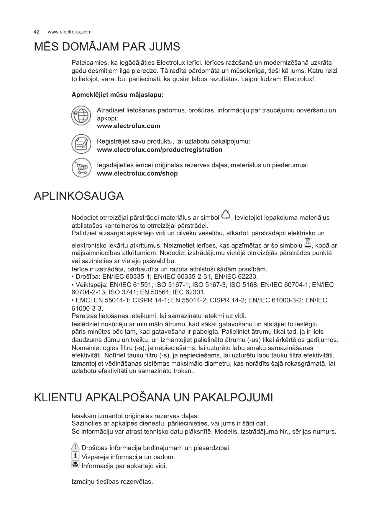 Pateicamies, ka iegādājāties Electrolux ierīci. Ierīces ražošanā un modernizēšanā uzkrāta gadu desmitiem ilga pieredze. Tā radīta pārdomāta un mūsdienīga, tieši kā jums. Katru reizi to lietojot, varat būt pārliecināti, ka gūsiet labus rezultātus. Laipni lūdzam Electrolux! Apmeklējiet mūsu mājaslapu: Atradīsiet lietošanas padomus, brošūras, informāciju par traucējumu novēršanu un apkopi: www.electrolux.com Reģistrējiet savu produktu, lai uzlabotu pakalpojumu: www.electrolux.com/productregistration Iegādājieties ierīcei oriģinālās rezerves daļas, materiālus un piederumus: www.electrolux.com/shop