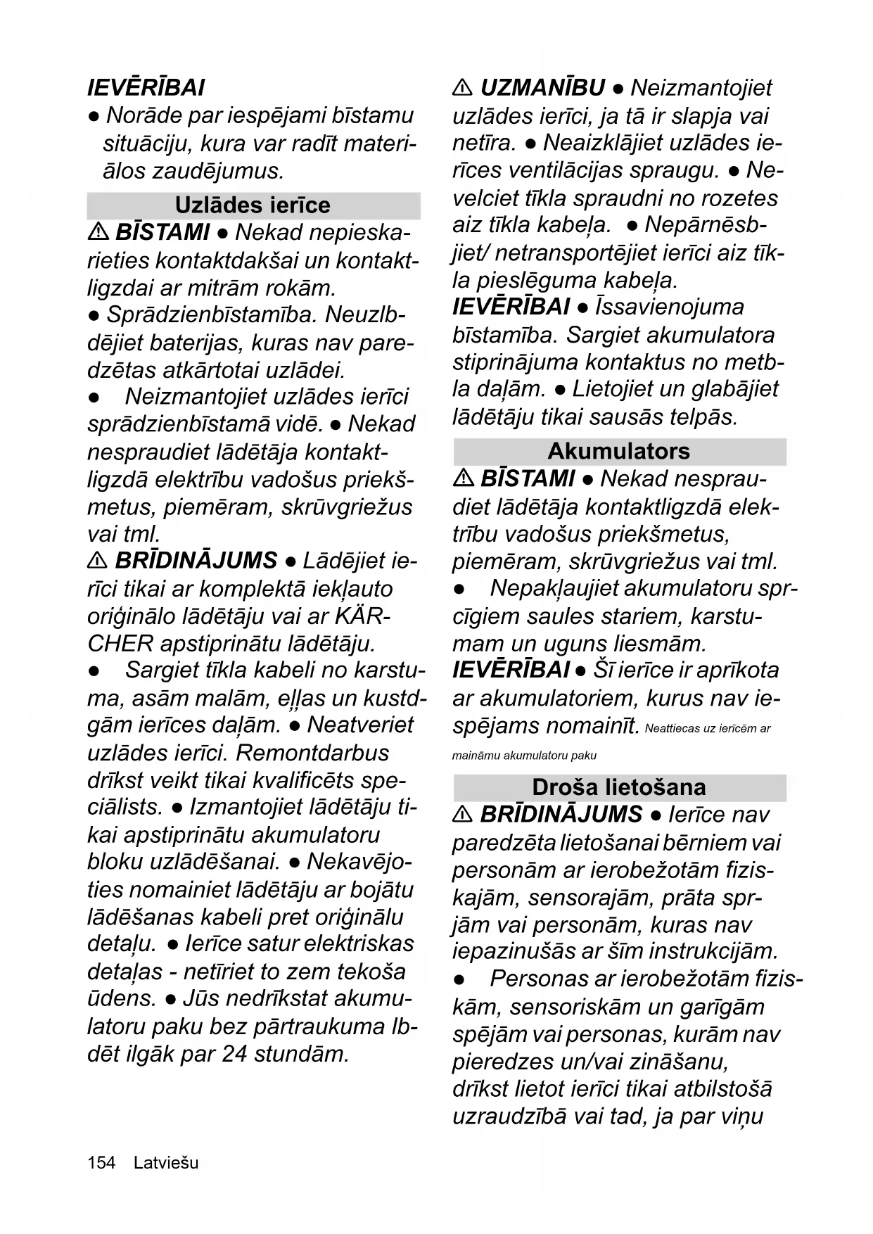 ● Norāde par iespējami bīstamu situāciju, kura var radīt materi- ālos zaudējumus. Uzlādes ierīce BĪSTAMI ● Nekad nepieska- rieties kontaktdakšai un kontakt- ligzdai ar mitrām rokām. ● Sprādzienbīstamība. Neuzlb- dējiet baterijas, kuras nav pare- dzētas atkārtotai uzlādei. ● Neizmantojiet uzlādes ierīci sprādzienbīstamā vidē. ● Nekad nespraudiet lādētāja kontakt- ligzdā elektrību vadošus priekš- metus, piemēram, skrūvgriežus vai tml. 몇 BRĪDINĀJUMS ● Lādējiet ie- rīci tikai ar komplektā iekļauto oriģinālo lādētāju vai ar KÄR- CHER apstiprinātu lādētāju. ● Sargiet tīkla kabeli no karstu- ma, asām malām, eļļas un kustd- gām ierīces daļām. ● Neatveriet uzlādes ierīci. Remontdarbus drīkst veikt tikai kvalificēts spe- ciālists. ● Izmantojiet lādētāju ti- kai apstiprinātu akumulatoru bloku uzlādēšanai. ● Nekavējo- ties nomainiet lādētāju ar bojātu lādēšanas kabeli pret oriģinālu detaļu. ● Ierīce satur elektriskas detaļas - netīriet to zem tekoša ūdens. ● Jūs nedrīkstat akumu- latoru paku bez pārtraukuma lb- dēt ilgāk par 24 stundām. 몇 UZMANĪBU ● Neizmantojiet uzlādes ierīci, ja tā ir slapja vai netīra. ● Neaizklājiet uzlādes ie- rīces ventilācijas spraugu. ● Ne- velciet tīkla spraudni no rozetes aiz tīkla kabeļa. ● Nepārnēsb- jiet/ netransportējiet ierīci aiz tīk- la pieslēguma kabeļa. IEVĒRĪBAI ● Īssavienojuma bīstamība. Sargiet akumulatora stiprinājuma kontaktus no metb- la daļām. ● Lietojiet un glabājiet lādētāju tikai sausās telpās. Akumulators BĪSTAMI ● Nekad nesprau- diet lādētāja kontaktligzdā elek- trību vadošus priekšmetus, piemēram, skrūvgriežus vai tml. ● Nepakļaujiet akumulatoru spr- cīgiem saules stariem, karstu- mam un uguns liesmām. IEVĒRĪBAI ● Šī ierīce ir aprīkota ar akumulatoriem, kurus nav ie- spējams nomainīt. Neattiecas uz ierīcēm ar maināmu akumulatoru paku Droša lietošana 몇 BRĪDINĀJUMS ● Ierīce nav paredzēta lietošanai bērniem vai personām ar ierobežotām fizis- kajām, sensorajām, prāta spr- jām vai personām, kuras nav iepazinušās ar šīm instrukcijām. ● Personas ar ierobežotām fizis- kām, sensoriskām un garīgām spējām vai personas, kurām nav pieredzes un/vai zināšanu, drīkst lietot ierīci tikai atbilstošā uzraudzībā vai tad, ja par viņu/DWYLHģX drošību atbildīgā persona dod norādes par ierīces drošu lieto- šanu un lietotājs ir izpratis iespr- jamās briesmas. ● Ar ierīci nedrīkst spēlēties bērni. ● Uz- raugiet bērnus, lai pārliecinātos, ka tie nespēlējas ar ierīci. ● Ierīci lietojiet tikai atbilstoši paredzēta- jam mērķim. Ņemiet vērā apkār- tējos apstākļus un darba laikā uzmanieties no trešām perso- nām, jo īpaši bērniem. ● Ap- draudējuma zonās (piem., degvielas uzpildes stacijās) ie- vērojiet attiecīgos drošības no- teikumus. Nekad neizmantojiet ierīci sprādzienbīstamās telpās. ● Neapsmidziniet priekšmetus, kas satur veselībai bīstamas vie- las (piem., azbestu). ● Savaino- šanās risks. Nevērsiet smidzināšanas strūklu acīs. 몇 UZMANĪBU ● Neizmantojiet ierīci, ja tā pirms tam ir nokritusi, ir redzami bojāta vai nav hermr- tiska. ● Lietojiet un uzglabājiet ierīci tikai atbilstoši aprakstam vai attēlam. ● Neatstājiet ierīci ekspluatācijas laikā bez uzrau- dzības. ● Lai nodrošinātu stabi- lu pozīciju, novietojiet ierīci uz stingras, līdzenas pamatnes. ● Nelaimes gadījumi vai bojā ju- mi, ko var radīt ierīces apgāša- nās. Pirms darbu veikšanas vienmēr nodrošiniet ierīces sta- bilitāti. IEVĒRĪBAI ● Neiepildiet tīrīša- nas līdzekļus vai citus papildinb- jums. ● Ierīces bojājumi. Neiepildiet ūdens tvertnē šķīdi- nātājus, šķīdinātājus saturošus šķidrumus vai neatšķaidītas skb- bes (piem., tīrīšanas līdzekļus, benzīnu, krāsas atšķaidītājus un acetonu). ● Ierīces bojājumi sausa gaitas dēļ. Ieslēdziet ierīci tikai, ja ūdens tvertnē ir ūdens. ● Nelietojiet ierīci, ja apkārtējās vides temperatūra ir zemāka par 0 °C. Noteikumiem atbilstoša lietošana Zemspiediena tīrītāju izmantojiet tikai privātā mājsaim- niecībā. Zemspiediena tīrītājs ir paredzēts mašīnu, transportlü- dzekļu, darbarīku, fasāžu, terašu, dārza ierīču, mājdzīv- nieku utt. mazgāšanai ar zemspiediena ūdens strūklu bez tīrīšanas līdzekļu pievienošanas. Apkārtējās vides aizsardzība Iepakošanas materiālus ir iespējams pārstrādāt atkārtoti. Likvidējiet iepakojumus videi nekaitīgā veidā. Elektriskās un elektroniskās ierīces satur noderü- gus pārstrādājumus materiālus un bieži vien tT- das sastāvdaļas kā baterijas, akumulatorus un eļļu, kuras nepareizas izmantošanas vai likvidс- šanas gadījumā var radīt potenciālu apdraudējumu cil- vēku veselībai un videi. Tomēr šīs sastāvdaļas ir nepieciešamas ierīces pareizai darbībai. Ierīces, kas apzīmētas ar šo simbolu, nedrīkst izmest kopā ar sadzü- ves atkritumiem. Tīrīšanas darbus, kuros notekūdens satur eļļu, pie- mēram, motora mazgāšanu, zemgrīdas mazgāša- nu, drīkst veikt tikai mazgāšanas vietās, kas aprīkotas ar eļļas atdalītāju. Darbus ar tīrīšanas līdzekļiem drīkst veikt tikai uz darba virsmām, kas ir nodrošinātas pret šķidruma noteci, ar pieslēgumu netīrā ūdens kanalizācijai. Neļau- jiet tīrīšanas līdzeklim nokļūt ūdenstilpnēs vai zemē. Dažās valstīs nav atļauta ūdens ņemšana no atklT- tām ūdenstilpnēm. Informācija par sastāvdaļām (REACH) Aktuālo informāciju par sastāvdaļām skatiet: www.kaer- cher.de/REACH Piederumi un rezerves daļas Izmantot tikai oriģinālos piederumus un oriģinālās re- zerves daļas, jo tie garantē drošu un nevainojamu ierü- ces darbību. Informāciju par piederumiem un rezerves daļām 