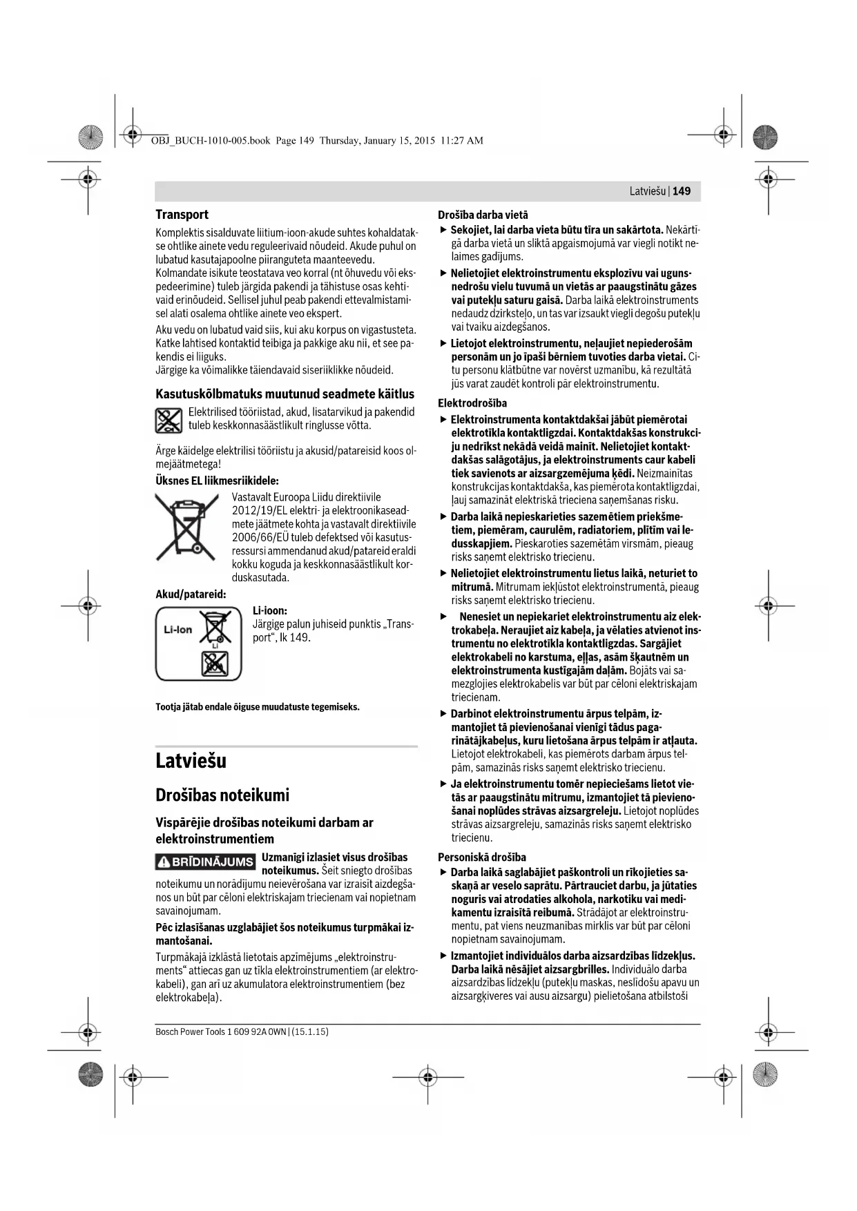 kruvipikkuse ulatuses auk ette puurida. Hooldus ja teenindus Hooldus ja puhastus Eemaldage aku seadmest enne mis tahes töid seadme kallal (nt hooldus, tarvikute vahetus jmt), samuti enne seadme transportimist ja hoiulepanekut. Lüliti (sis- se/välja) soovimatul käsitsemisel esineb vigastuste oht. Seadme laitmatu ja ohutu töö tagamiseks hoidke seade ja selle ventilatsiooniavad puhtad. Kui aku enam ei tööta, pöörduge palun Boschi elektriliste töö- riistade volitatud remonditöökotta. Hoidke padrun 2 ja tarvik alati puhtad, et tagada lukustushülsi 3 lukustus- ja vabastusfunktsiooni toimivust. Klienditeenindus ja müügijärgne nõustamine Klienditeeninduses vastatakse toote paranduse ja hoolduse ning varuosade kohta esitatud küsimustele. Joonised ja teabe varuosade kohta leiate ka veebisaidilt: www.bosch-pt.com Boschi nõustajad osutavad Teile toodete ja tarvikute küsimus- tes meeleldi abi. Järelepärimiste esitamisel ja tagavaraosade tellimisel näida- ke kindlasti ära seadme andmesildil olev 10-kohaline toote- number. Eesti Vabariik Mercantile Group AS Boschi elektriliste käsitööriistade remont ja hooldus Pärnu mnt. 549 76401 Saue vald, Laagri Tel.: 6549 568 Faks: 679 1129 OBJ_BUCH-1010-005.book Page 148 Thursday, January 15, 2015 11:27 AMLatviešu | 149 Bosch Power Tools 1 609 92A 0WN | (15.1.15) Transport Komplektis sisalduvate liitium-ioon-akude suhtes kohaldatak- se ohtlike ainete vedu reguleerivaid nõudeid. Akude puhul on lubatud kasutajapoolne piiranguteta maanteevedu. Kolmandate isikute teostatava veo korral (nt õhuvedu või eks- pedeerimine) tuleb järgida pakendi ja tähistuse osas kehti- vaid erinõudeid. Sellisel juhul peab pakendi ettevalmistami- sel alati osalema ohtlike ainete veo ekspert. Aku vedu on lubatud vaid siis, kui aku korpus on vigastusteta. Katke lahtised kontaktid teibiga ja pakkige aku nii, et see pa- kendis ei liiguks. Järgige ka võimalikke täiendavaid siseriiklikke nõudeid. Kasutuskõlbmatuks muutunud seadmete käitlus Elektrilised tööriistad, akud, lisatarvikud ja pakendid tuleb keskkonnasäästlikult ringlusse võtta. Ärge käidelge elektrilisi tööriistu ja akusid/patareisid koos ol- mejäätmetega! Üksnes EL liikmesriikidele: Vastavalt Euroopa Liidu direktiivile 2012/19/EL elektri- ja elektroonikasead- mete jäätmete kohta ja vastavalt direktiivile 2006/66/EÜ tuleb defektsed või kasutus- ressursi ammendanud akud/patareid eraldi kokku koguda ja keskkonnasäästlikult kor- duskasutada. Akud/patareid: Li-ioon: Järgige palun juhiseid punktis „Trans- port“, lk 149. Tootja jätab endale õiguse muudatuste tegemiseks. Latviešu Drošības noteikumi Vispārējie drošības noteikumi darbam ar elektroinstrumentiem Uzmanīgi izlasiet visus drošības noteikumus. Šeit sniegto drošības noteikumu un norādījumu neievērošana var izraisīt aizdegša- nos un būt par cēloni elektriskajam triecienam vai nopietnam savainojumam. Pēc izlasīšanas uzglabājiet šos noteikumus turpmākai iz- mantošanai. Turpmākajā izklāstā lietotais apzīmējums „elektroinstru- ments“ attiecas gan uz tīkla elektroinstrumentiem (ar elektro- kabeli), gan arī uz akumulatora elektroinstrumentiem (bez elektrokabeļa). Drošība darba vietā Sekojiet, lai darba vieta būtu tīra un sakārtota. Nekārtī- gā darba vietā un sliktā apgaismojumā var viegli notikt ne- laimes gadījums. Nelietojiet elektroinstrumentu eksplozīvu vai uguns- nedrošu vielu tuvumā un vietās ar paaugstinātu gāzes vai putekļ u saturu gaisā. Darba laikā elektroinstruments nedaudz dzirksteļo, un tas var izsaukt viegli degošu putekļu vai tvaiku aizdegšanos. Lietojot elektroinstrumentu, neļaujiet nepiederošām personām un jo īpaši bērniem tuvoties darba vietai. Ci- tu personu klātbūtne var novērst uzmanību, kā rezultātā jūs varat zaudēt kontroli pār elektroinstrumentu. Elektrodrošība Elektroinstrumenta kontaktdakšai jābūt piemērotai elektrotīkla kontaktligzdai. Kontaktdakšas konstrukci- ju nedrīkst nekādā veidā mainīt. Nelietojiet kontakt- dakšas salāgotājus, ja elektroinstruments caur kabeli tiek savienots ar aizsargzemējuma ķēdi. Neizmainītas konstrukcijas kontaktdakša, kas piemērota kontaktligzdai, ļauj samazināt elektriskā trieciena saņemšanas risku. Darba laikā nepieskarieties sazem ētiem priekšme- tiem, piemēram, caurulēm, radiatoriem, plītīm vai le- dusskapjiem. Pieskaroties sazemētām virsmām, pieaug risks saņemt elektrisko triecienu. Nelietojiet elektroinstrumentu lietus laikā, neturiet to mitrumā. Mitrumam iekļūstot elektroinstrumentā, pieaug risks saņemt elektrisko triecienu. Nenesiet un nepiekariet elektroinstrumentu aiz elek- trokabeļa. Neraujiet aiz kabeļa, ja vēlaties atvienot ins- trumentu no elektrotīkla kontaktligzdas. Sargājiet elektrokabeli no karstuma, eļļas, asām šķautnēm un elektroinstrumenta kustīgajām daļām. Bojāts vai sa- mezglojies elektrokabelis var būt par cēloni elektriskajam triecienam. Darbinot elektroinstrumentu ārpus telpām, iz- mantojiet tā pievienošanai vienīgi tādus paga- rinātājkabeļus, kuru lietošana ārpus telpām ir atļ auta. Lietojot elektrokabeli, kas piemērots darbam ārpus tel- pām, samazinās risks saņemt elektrisko triecienu. Ja elektroinstrumentu tomēr nepieciešams lietot vie- tās ar paaugstinātu mitrumu, izmantojiet tā pievieno- šanai noplūdes strāvas aizsargreleju. Lietojot noplūdes strāvas aizsargreleju, samazinās risks saņemt elektrisko triecienu. Personiskā drošība Darba laikā saglabājiet paškontroli un rīkojieties sa- skaņā ar veselo saprātu. Pārtrauciet darbu, ja jūtaties noguris vai atrodaties alkohola, narkotiku vai medi- kamentu izraisītā reibumā. Strādājot ar elektroinstru- mentu, pat viens neuzmanības mirklis var būt par cēloni nopietnam savainojumam. Izmantojiet individuālos darba aizsardzības līdzekļus. Darba laikā nēsājiet aizsargbrilles. Individuā lo darba aizsardzī