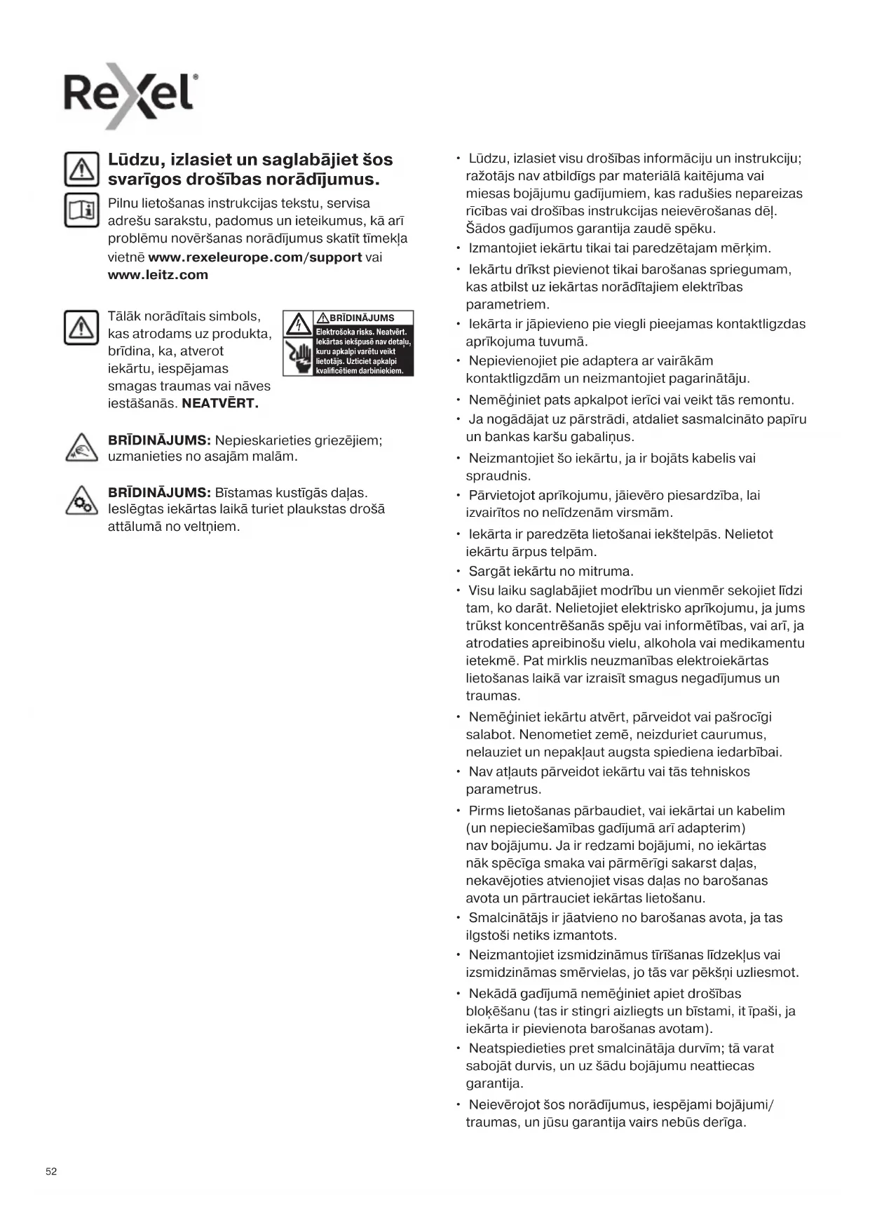 - Neievērojot šos norādījumus, iespējami bojājumi/ traumas, un jūsu garantija vairs nebūs derīga. Lūdzu, izlasiet un saglabājiet šos svarīgos drošības norādījumus. Pilnu lietošanas instrukcijas tekstu, servisa adrešu sarakstu, padomus un ieteikumus, kā arī problēmu novēršanas norādījumus skatīt tīmekļa vietnē www.rexeleurope.com/support vai www.leitz.com BRĪDINĀJUMS: Nepieskarieties griezējiem; uzmanieties no asajām malām. BRĪDINĀJUMS: Bīstamas kustīgās daļas. Ieslēgtas iekārtas laikā turiet plaukstas drošā attālumā no veltņiem.535353 Neturiet vaļīgas rotaslietas padeves atveres tuvumā Neturiet kaklasaites un brīvu apģērbu padeves atveres tuvumā Brīdinājuma simboli Neturiet garus matus padeves atveres tuvumā Nelieciet rokas padeves atverē Brīdinājuma simboli Lokšņu apjoms Nesmalcināt CD Nesmalcināt skavas, kas garākas par 26 mm Brīdinājums! Kustīgās daļas Šo iekārtu nav paredzēts izmantot bērniem Neizmantojiet aerosolus iekārtas tuvumā. Neizmantojiet izsmidzināmus tīrīšanas līdzekļus vai izsmidzināmas smērvielas, jo tās var pēkšņi uzliesmot. Ikona Tips Slīdņa slēdzis/indikators un darbība Vadības pogas Automātiskās palaišanas un gaidīšanas poga (jānospiež vienu reizi) Manuālās atpakaļpadeves poga (jānospiež un jāpietur poga) Manuālās padeves poga virzienā uz priekšu (jānospiež un jāpietur poga) Pārkaršanas indikators (ļaujiet smalcinātājam atdzist) Pārpildītas iekārtas indikators/iestrēgušu materiālu indikators (samaziniet lokšņu skaitu/ izvelciet iestrēgušo materiālu) Modeļi ar pogām Ikona Tips Slīdņa slēdzis/indikators un darbība Slīdņa slēdzis Automātiskā palaišana (pārvietot nepieciešamajā pozīcijā, lai sāktu smalcināšanu) Reversā darbība (pārvietot nepieciešamajā pozīcijā) Padeve uz priekšu (pārvietot nepieciešamajā pozīcijā) Statusa indikator Izslēgt (pārvietot nepieciešamajā pozīcijā) Darbgatavības indikators (smalcinātāja galvai ir jāatrodas uz tvertnes un slīdņa slēdzim ir jābūt automātiskās palaišanas stāvoklī) Pārkaršanas indikators (ļaujiet smalcinātājam atdzist) Kontrolierīces un indikatori Modeļi ar slīdņa slēdzi Nesmalcināt kredītkartes Piederumi Izmantot tikai Rexel piederumus: Eļļošanas lapas (20) - 2101949 Eļļošanas lapas (12) - 210194854 Biezs papīrs vai kartīte < 200 gsm. Vairākas salocītas loksnes (uz pusēm pārlocītas A3 loksnes). Glancēts papīrs vai no abām pusēm apdrukāta loksne. CD un DVD. Neizmantojiet aerosolus iekārtas tuvumā Nav eļļas, tikai eļļas loksnes Smalcināšanas iespējas VAR sasmalcināt sekojošo: