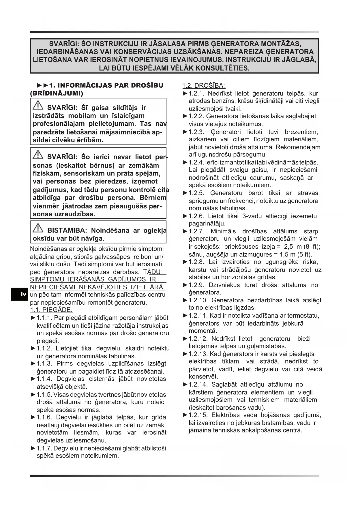 (BRĪDINĀJUMI) SVARĪGI: Šī gaisa sildītājs ir izstrādāts mobilam un īslaicīgam profesionālajam pielietojumam. Tas nav paredzēts lietošanai mājsaimniecībā ap- sildei cilvēku ērtībām. SVARĪGI: Šo ierīci nevar lietot per- sonas (ieskaitot bērnus) ar zemākām ziskām, sensoriskām un prāta spējām, vai personas bez pieredzes, izņemot gadījumus, kad tādu personu kontrolē cita atbildīga par drošību persona. Bērniem vienmēr jāatrodas zem pieaugušās per- sonas uzraudzības. BĪSTAMĪBA: Noindēšana ar oglekļa oksīdu var būt nāvīga. Noindēšanas ar oglekļa oksīdu pirmie simptomi atgādina gripu, stiprās galvassāpes, reiboni un/ vai sliktu dūšu. Tādi simptomi var būt ierosināti pēc ģeneratora nepareizas darbības. TĀDU SIMPTOMU IERĀŠANĀS GADĪJUMOS IR NEPIECIEŠAMI NEKAVĒJOTIES IZIET ĀRĀ, un pēc tam informēt tehniskās palīdzības centru par nepieciešamību remontēt ģeneratoru. 1.1. PIEGĀDE: ►1.1.1. Par piegādi atbildīgam personālam jābūt kvalicētam un tieši jāzina ražotāja instrukcijas un spēkā esošas normās par drošo ģeneratoru piegādi. ►1.1.2. Lietojiet tikai degvielu, skaidri noteiktu uz ģeneratora nominālas tabuliņas. ►1.1.3. Pirms degvielas uzpildīšanas izslēgt ģeneratoru un pagaidiet līdz tā atdzesēšanai. ►1.1.4. Degvielas cisternās jābūt novietotas atsevišķā objektā. ►1.1.5. Visas degvielas tvertnes jābūt novietotas drošā attālumā no ģeneratora, kuru noteic spēkā esošas normas. ►1.1.6. Degvielu ir jāglabā telpās, kur grīda neatļauj degvielai iesūkties un pilēt uz zemāk novietotām liesmām, kuras var ierosināt degvielas uzliesmošanu. ►1.1.7. Degvielu ir nepieciešami glabāt atbilstoši spēkā esošiem noteikumiem. 1.2. DROŠĪBA: ►1.2.1. Nedrīkst lietot ģeneratoru telpās, kur atrodas benzīns, krāsu šķīdinātāji vai citi viegli uzliesmojoši tvaiki. ►1.2.2. Ģeneratora lietošanas laikā saglabājiet visus vietējus noteikumus. ►1.2.3. Ģeneratori lietoti tuvi brezentiem, aizkariem vai citiem līdzīgiem materiāliem, jābūt novietoti drošā attālumā. Rekomendējam arī ugunsdrošu pārsegumu. ►1.2.4. Ierīci izmantot tikai labi vēdināmās telpās. Lai piegādāt svaigu gaisu, ir nepieciešami nodrošināt attiecīgu caurumu, saskaņā ar spēkā esošiem noteikumiem. ►1.2.5. Ģeneratoru barot tikai ar strāvas spriegumu un frekvenci, noteiktu uz ģeneratora nominālas tabuliņas. ►1.2.6. Lietot tikai 3-vadu attiecīgi iezemētu pagarinātāju. ►1.2.7. Minimāls drošības attālums starp ģeneratoru un viegli uzliesmojošām vielām ir sekojošs: priekšpuses izeja = 2,5 m (8 ft); sānu, augšēja un aizmugures = 1,5 m (5 ft). ►1.2.8. Lai izvairoties no ugunsgrēka riska, karstu vai strādājošu ģeneratoru novietot uz stabilas un horizontālas grīdas. ►1.2.9. Dzīvniekus turēt drošā attālumā no ģeneratora. ►1.2.10. Ģeneratora bezdarbības laikā atslēgt to no elektrības ligzdas. ►1.2.11. Kad ir noteikta vadīšana ar termostatu, ģenerators var būt iedarbināts jebkurā momentā. ►1.2.12. Nedrīkst lietot ģeneratoru bieži lietojamās telpās un guļamistabās. ►1.2.13. Kad ģenerators ir kārsts vai pieslēgts elektrības tīklam, vai strādā, nedrīkst to pārvietot, vadīt, ieliet degvielu vai citā veidā konservēt. ►1.2.14. Saglabāt attiecīgu attālumu no kārstiem ģeneratora elementiem un viegli uzliesmojošiem vai termiskiem materiāliem (ieskaitot barošanas vadu). ►1.2.15. Elektrības vada bojāšanas gadījumā, lai izvairoties no jebkuras bīstamības, vadu ir jāmaina tehniskās apkalpošanas centrā.