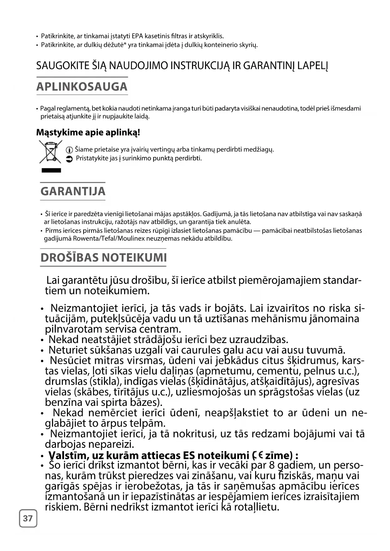 - Putekļsūcējs ir elektriska ierīce, tas jāizmanto normālos lietošanas apstākļos.• Pārbaudiet, vai putekļsūcējam nepieciešamais strāvas spriegums (voltāža) atbilst jūsu elektrotīkla parametriem.• Atvienojiet ierīces kontaktdakšu no elektrības kontaktligzdas, neraujot aiz elektrības vada:– uzreiz pēc lietošanas pabeigšanas;– pirms katras piederumu nomaiņas reizes;– pirms katras tīrīšanas, apkopes vai ltra nomaiņas reizes. Svarīgi : kontaktligzdai jābūt aizsargātai ar vienu vismaz 16A īsslēguma drošinātāju. Ja ierīces ieslēgšanas laikā nostrādā strāvas atslēgšanas ierīce, iespējams, pie tā vainojams fakts, ka vienlaicīgi pie elektropadeves tīkla tikušas pieslēgtas vairākas elektriskās ierīces ar augstu kopīgo jaudu. No atslēgšanas ierīces nostrādāšanas var izvairīties, pirms ierīces ieslēgšanas to noregulējot uz zemāko jaudas līmeni, un palielinot jaudu pēc tam.• Pirms katras lietošanas reizes pilnībā iztiniet vadu.• Nesaspiediet to un nepieļaujiet tā saskari ar asām malām.• Ja lietojat elektrisko pagarinātāju, pārliecinieties, ka tas ir nevainojamā stāvoklī un atbilst putekļsūcēja jaudai.• Daži putekļsūcēju modeļi ir aprīkoti ar aizsardzību pret motora pārkaršanu. Atsevišķos gadījumos (izmantojot cauruli uz atzveltnes krēsla, sēdekļiem u.c.), ieslēdzas aizsardzība, un ierīce var izdot neparastu troksni un pār- traukt sūkšanu. • Pārbaudiet, vai ltri ievietoti pareizi. • Izmantojiet tikai oriģinālos Rowenta/Tefal/Moulinex piederumus. • Ja Jums rodas grūtības iegādāties šī putekļsūcēja piederumus un ltrus, sazinieties ar Rowenta/Tefal/Moulinex patērētāju dienestu. • Ja Jūsu putekļsūcējam ir maisiņš : Nedarbiniet putekļsūcēju bez maisiņa un ltrēšanas sistēmas (ltra kasetnes*, ltra*, sūkļa*, mikroltra*).Lietojiet tikai Rowenta/Tefal/Moulinex oriģinālos maisiņus un ltrus. • Ja Jūsu putekļsūcējam nav maisiņa : Nedarbiniet putekļsūcēju bez ltrācijas sistēmas (ltra kasetnes*, sūkļa*, mikroltra* un ltra*).Neievietojiet sūkli un mikroltru ierīcē, līdz tie nav pilnībā izžuvuši.Izmantojiet tikai oriģinālos Rowenta/Tefal/Moulinex ltrus. *Atkarībā no ierīces: runa ir par aprīkojumu, kas ir specifisks konkrētiem modeļiem vai piederumiem, kas pieejami pēc izvēles.