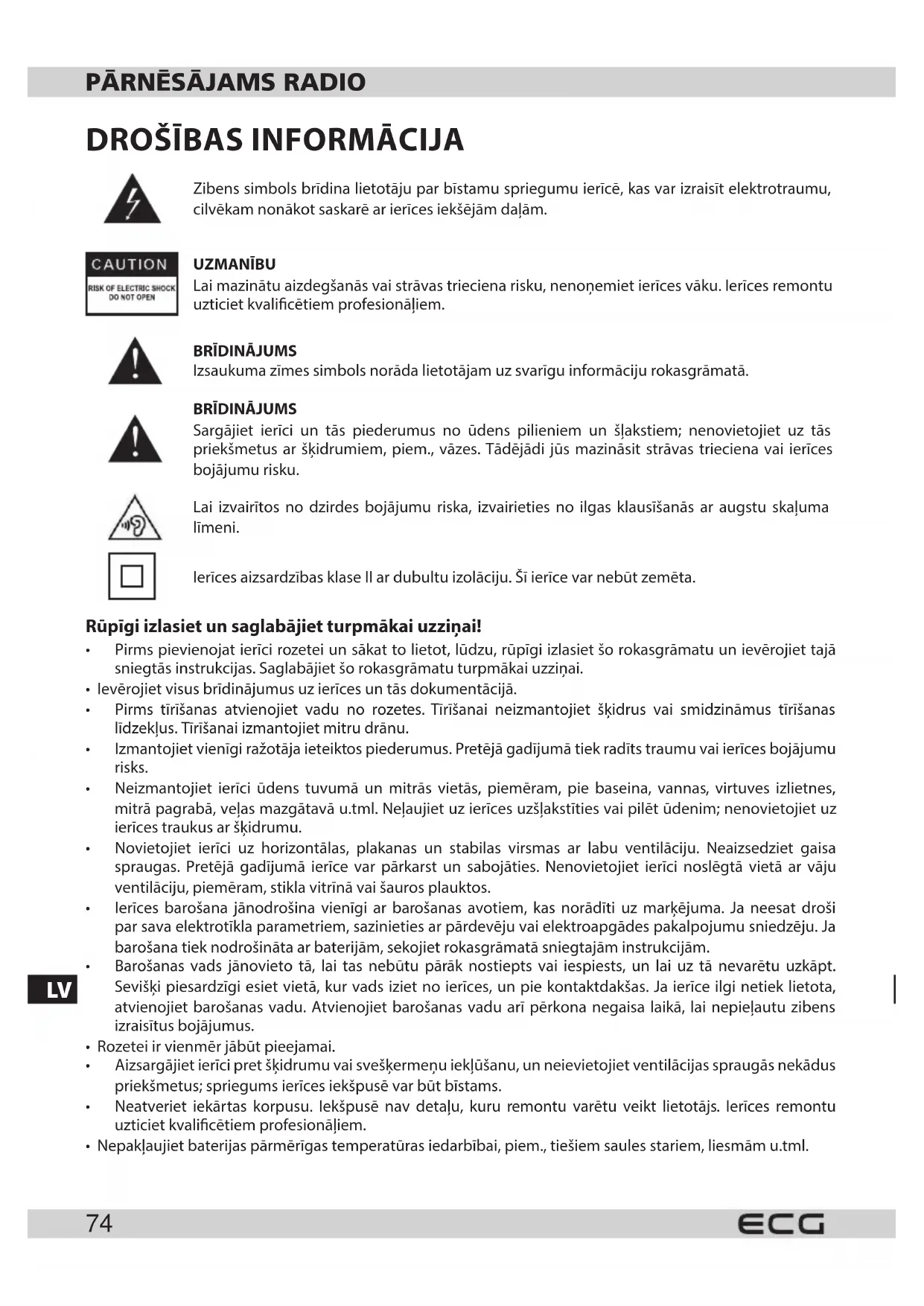 Sargājiet ierīci un tās piederumus no ūdens pilieniem un šļakstiem; nenovietojiet uz tās priekšmetus ar šķidrumiem, piem., vāzes. Tādējādi jūs mazināsit strāvas trieciena vai ierīces bojājumu risku. Lai izvairītos no dzirdes bojājumu riska, izvairieties no ilgas klausīšanās ar augstu skaļuma līmeni. Ierīces aizsardzības klase II ar dubultu izolāciju. Šī ierīce var nebūt zemēta. Rūpīgi izlasiet un saglabājiet turpmākai uzziņai!