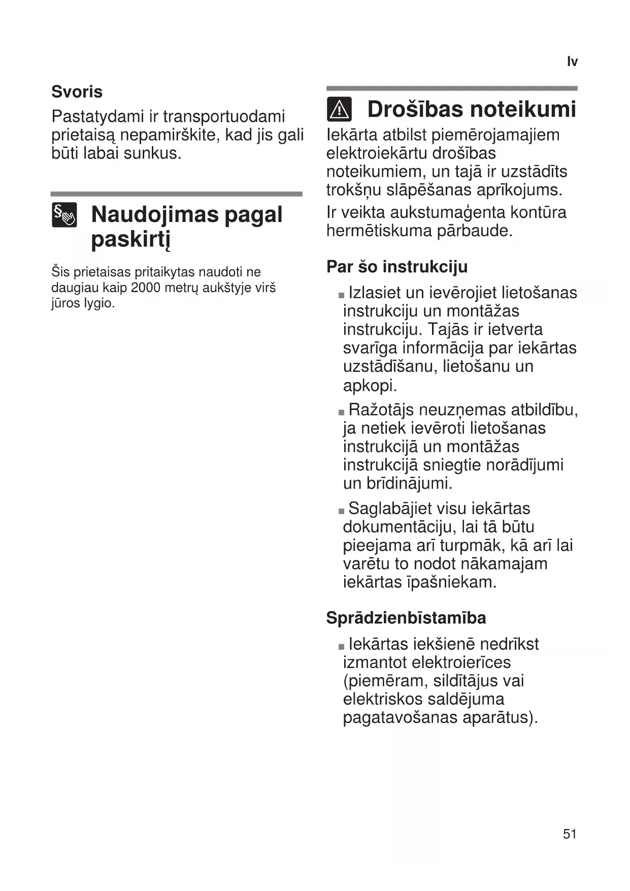 Iekārta atbilst piemērojamajiem elektroiekārtu drošības noteikumiem, un tajā ir uzstādīts trokšņu slāpēšanas aprīkojums. Ir veikta aukstumaģenta kontūra hermētiskuma pārbaude. Par šo instrukciju ■ Izlasiet un ievērojiet lietošanas instrukciju un montāžas instrukciju. Tajās ir ietverta svarīga informācija par iekārtas uzstādīšanu, lietošanu un apkopi. ■ Ražotājs neuzņemas atbildību, ja netiek ievēroti lietošanas instrukcijā un montāžas instrukcijā sniegtie norādījumi un brīdinājumi. ■ Saglabājiet visu iekārtas dokumentāciju, lai tā būtu pieejama arī turpmāk, kā arī lai varētu to nodot nākamajam iekārtas īpašniekam. Sprādzienbīstamība ■ Iekārtas iekšienē nedrīkst izmantot elektroierīces (piemēram, sildītājus vai elektriskos saldējuma pagatavošanas aparātus).52