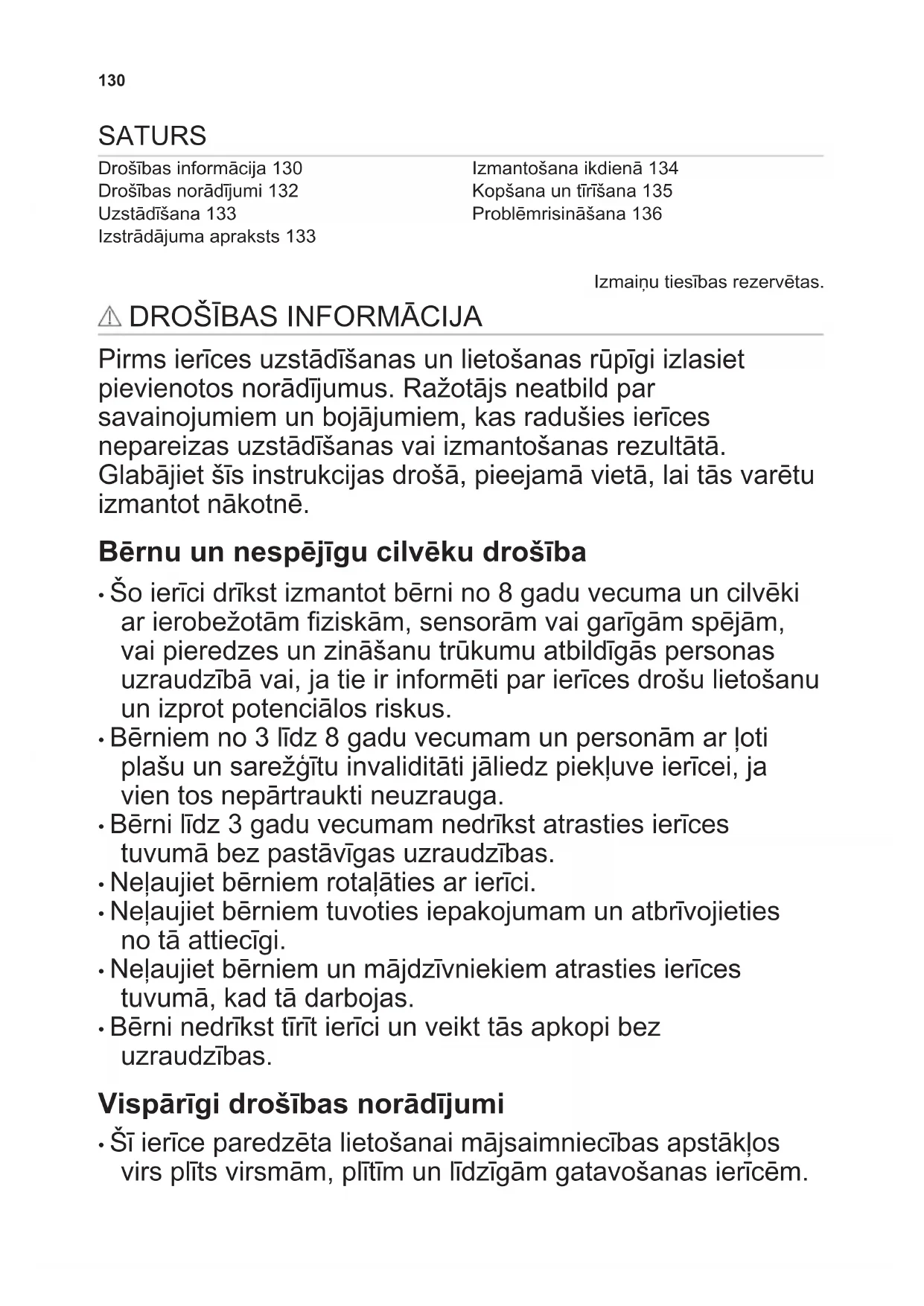 - Bērni nedrīkst tīrīt ierīci un veikt tās apkopi bez uzraudzības. Vispārīgi drošības norādījumi