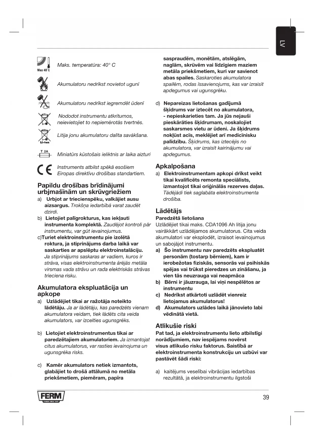 Maks. temperatūra: 40° C Akumulatoru nedrīkst novietot ugunī Akumulatoru nedrīkst iegremdēt ūdenī Nododot instrumentu atkritumos, neievietojiet to nepiemērotās tvertnēs. Litija jonu akumulatoru dalīta savākšana. Miniatūrs kūstošais ieliktnis ar laika aizturi Instruments atbilst spēkā esošiem Eiropas direktīvu drošības standartiem. Papildudrošībasbrīdinājumi urbjmašīnāmunskrūvgriežiem a) Urbjotartriecienspēku,valkājietausu aizsargus. Trokšņa iedarbībā varat zaudēt dzirdi. b) Lietojietpalīgrokturus,kasiekļauti instrumentakomplektā. Zaudējot kontroli pār instrumentu, var gūt ievainojumus. c) Turietelektroinstrumentupieizolētā roktura,jastiprinājumsdarbalaikāvar saskartiesarapslēptuelektroinstalāciju. Ja stiprinājums saskaras ar vadiem, kuros ir strāva, visas elektroinstrumenta ārējās metāla virsmas vada strāvu un rada elektriskās strāvas trieciena risku. Akumulatoraekspluatācijaun apkope a) Uzlādējiettikaiarražotājanoteikto lādētāju. Ja ar lādētāju, kas paredzēts vienam akumulatora veidam, tiek lādēts cita veida akumulators, var izcelties ugunsgrēks. b) Lietojiet elektroinstrumentus tikai ar paredzētajiemakumulatoriem. Ja izmantojat citus akumulatorus, var rasties ievainojuma un ugunsgrēka risks. c) Kamērakumulatorsnetiekizmantots, glabājiettodrošāattālumānometāla priekšmetiem,piemēram,papīra saspraudēm,monētām,atslēgām, naglām,skrūvēmvailīdzīgiemmaziem metālapriekšmetiem,kurivarsavienot abas spailes. Saskaroties akumulatora spailēm, rodas īssavienojums, kas var izraisīt apdegumus vai ugunsgrēku. d) Nepareizaslietošanasgadījumā šķidrumsvariztecētnoakumulatora, -nepieskarietiestam.Jajūsnejauši pieskārātiesšķidrumam,noskalojiet saskarsmesvietuarūdeni.Jašķidrums nokļūstacīs,meklējietarīmedicīnisku palīdzību.Šķidrums, kas iztecējis no akumulatora, var izraisīt kairinājumu vai apdegumus. Apkalpošana a) Elektroinstrumentamapkopidrīkstveikt tikaikvalificētsremontaspeciālists, izmantojottikaioriģinālāsrezervesdaļas. Tādējādi tiek saglabāta elektroinstrumenta drošība. Lādētājs Paredzētālietošana Uzlādējiet tikai maks. CDA1096 Ah litija jonu vairākkārt uzlādējamos akumulatorus. Cita veida akumulatori var eksplodēt, izraisot ievainojumus un sabojājot instrumentu. a)Šoinstrumentunavparedzētsekspluatēt personām(tostarpbērniem),kamir ierobežotasfiziskās,sensorāsvaipsihiskās spējasvaitrūkstpieredzesunzināšanu,ja vientāsneuzraugavaineapmāca b)Bērniirjāuzrauga,laiviņinespēlētosar instrumentu c)Nedrīkstatkārtotiuzlādētvienreiz lietojamus akumulatorus! d)Akumulatorsuzlādeslaikājānovietolabi vēdinātāvietā. Atlikušie riski Pattad,jaelektroinstrumentulietoatbilstīgi norādījumiem,naviespējamsnovērst visusatlikušoriskufaktorus.Saistībāar elektroinstrumentakonstrukcijuunuzbūvivar pastāvētšādiriski: a) kaitējums veselībai vibrācijas iedarbības rezultātā, ja elektroinstrumentu ilgstoši40