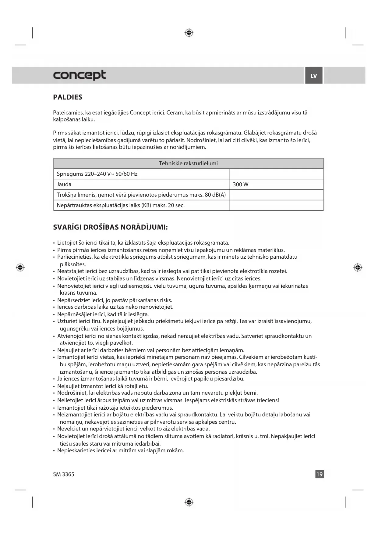 PALDIES Pateicamies, ka esat iegādājies Concept ierīci. Ceram, ka būsit apmierināts ar mūsu izstrādājumu visu tā kalpošanas laiku. Pirms sākat izmantot ierīci, lūdzu, rūpīgi izlasiet ekspluatācijas rokasgrāmatu. Glabājiet rokasgrāmatu drošā vietā, lai nepieciešamības gadījumā varētu to pārlasīt. Nodrošiniet, lai arī citi cilvēki, kas izmanto šo ierīci, pirms šīs ierīces lietošanas būtu iepazinušies ar norādījumiem. Tehniskie raksturlielumi Spriegums 220–240 V~ 50/60 Hz Jauda 300 W Trokšņa līmenis, ņemot vērā pievienotos piederumus maks. 80 dB(A) Nepārtrauktas ekspluatācijas laiks (KB) maks. 20 sec. SVARĪGI DROŠĪBAS NORĀDĪJUMI: