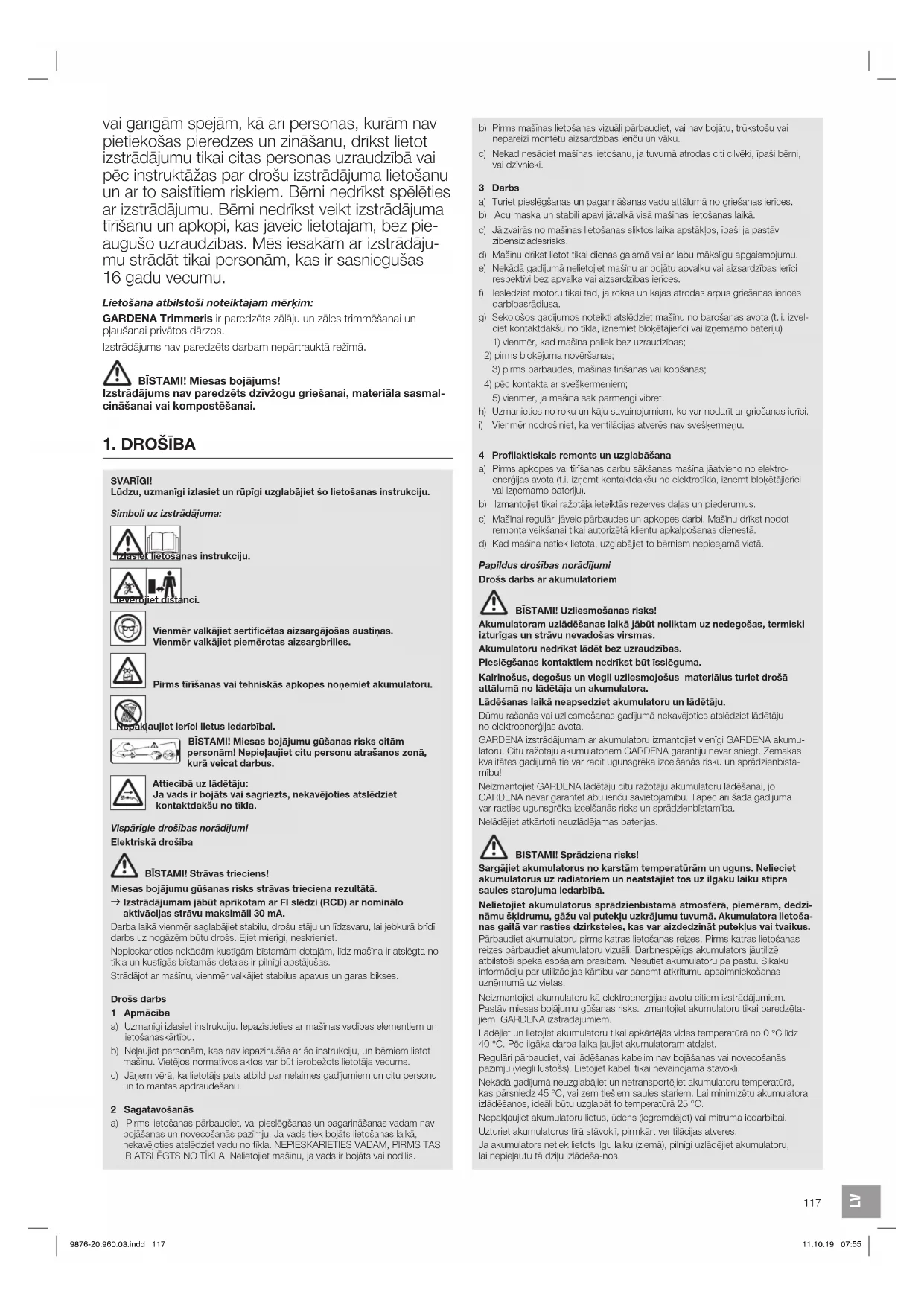 Lai novērstu pašizlādi, neatbilstošu lietošanu un nelaimes gadījumus, neuzglabā- jiet akumulatoru izstrādājumā. Neuzglabājiet akumulatoru telpās, kur iespējama elektro statiska izlāde. Elektriskā drošība BĪSTAMI! Sirds apstāšanās! Šīs izstrādājums darba laikā rada elektromagnētisko lauku. Šis lauks noteiktos apstākļos var ietekmēt pasīvu vai aktīvu medicīnisko implantā- tu funkcionēšanu. Lai nepieļautu tādas situācijas, kurās cilvēki var gūt smagus vai nāvīgus ievainojumus, cilvēkiem ar medicīnisko implantātu pirms izstrādājuma lietošanas ieteicams konsultēties ar ārstu vai implan- tāta ražotāju. Lietojiet ar akumulatoru darbināmo izstrādājumu tikai temperatūrā no 0 līdz 40 °C. Ārkārtas gadījumā izņemiet akumulatoru. Nelietojiet izstrādājumu ūdens tuvumā vai dīķu kopšanai. Individuālā drošība BĪSTAMI! Nosmakšanas risks! Mazas detaļas var viegli norīt. Polietilēna maisiņš rada nosmakšanas risku maziem bērniem. Montāžas darbu izpildes laikā turiet mazus bērnus drošā attālumā. Spēcīgu vibrāciju gadījumā nomainīt nazi un pārbaudīt, vai nav bojāts naža turētājs. Pirms lietošanas pārbaudiet, vai dilstošā riba nav bojāta. Transportēšana aiz priekšējā roktura. Izmantojiet individuālās aizsardzības līdzekļus. Griešanas mehānisma tīrīšanai uzvelciet cimdus. Vienmēr izmantojiet aizsargbrilles. Aizsardzības līdzekļi, tādi kā cimdi, neslīdoši apavi vai aizsardzības austiņas, kurus izmanto noteiktos apstākļos, būtiski mazina savainojumu gūšanas risku. Veicot izstrādājuma iestatīšanu, ievērojiet piesardzību, lai nepieļautu pirkstu iespiešanu starp mašīnas kustīgajām un nekustīgajām detaļām vai montējot kopā aizsargpārsegu. Aizsarga vai citu trimmera detaļu tīrīšanai neizmantojiet ūdeni vai ķīmiskus līdzekļus. Visiem uzgriežņiem un skrūvēm jābūt cieši pievilktiem, lai nodrošinātu izstrādāju- ma drošu darba stāvokli. Izjaukt izstrādājumu drīkst tikai līdz tādam stāvoklim, kādā izstrādājums tiek piegādāts. Brīdinājums! Valkājot aizsardzības austiņas, izstrādājuma izraisītā trokšņa dēļ lietotājs nav nepamanīt tuvojošus cilvēkus. Darba un transportēšanas laikā pievērsiet īpašu uzmanību tam, lai citi cilvēki netiktu pakļauti riskiem. Esiet piesardzīgs, uzmanieties, ko Jūs darāt un strādājot ar elektroinstrumentu, esiet saprātīgs. Nelietojiet elektroinstrumentu, ja esat noguris vai slims vai arī atrodaties narko- tisku vielu, alkohola vai medikamentu ietekmē. Pat maza neievērība elektroinstrumenta darba laikā nav kļūt par smagu savaino- jumu cēloni.