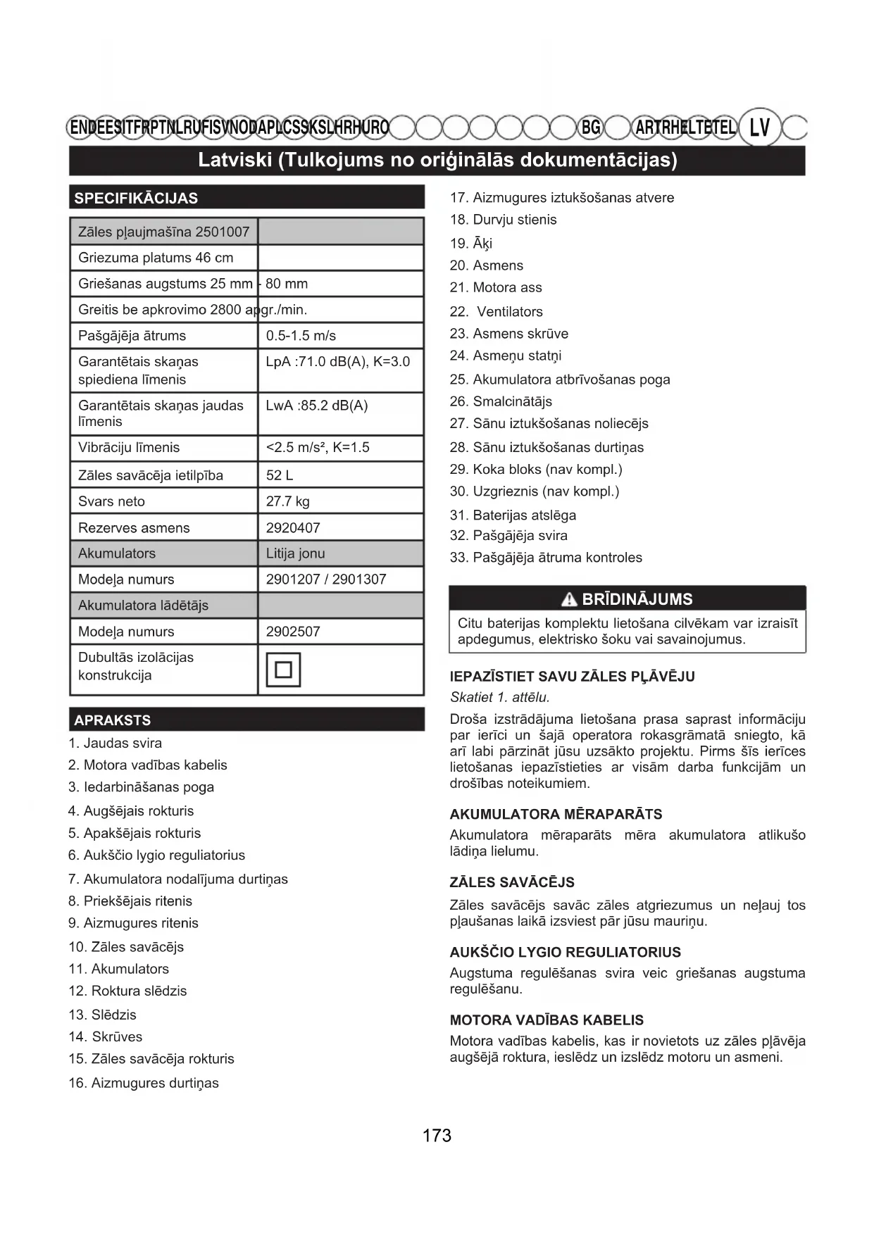 SPECIFIKĀCIJASZāles pļaujmašīna 2501007Griezuma platums 46 cmGriešanas augstums 25 mm - 80 mmGreitis be apkrovimo 2800 apgr./min.Pašgājēja ātrums 0.5-1.5 m/sGarantētais skaņas spiediena līmenisLpA :71.0 dB(A), K=3.0Garantētais skaņas jaudas līmenisLwA :85.2 dB(A)Vibrāciju līmenis <2.5 m/s², K=1.5Zāles savācēja ietilpība 52 LSvars neto 27.7 kgRezerves asmens 2920407Akumulators Litija jonuModeļa numurs 2901207 / 2901307Akumulatora lādētājsModeļa numurs 2902507Dubultās izolācijaskonstrukcijaAPRAKSTS1. Jaudas svira2. Motora vadības kabelis3. Iedarbināšanas poga4. Augšējais rokturis5. Apakšējais rokturis6. Aukščio lygio reguliatorius7. Akumulatora nodalījuma durtiņas8. Priekšējais ritenis9. Aizmugures ritenis10. Zāles savācējs11. Akumulators12. Roktura slēdzis13. Slēdzis Skrūves15. Zāles savācēja rokturis16. Aizmugures durtiņas17. Aizmugures iztukšošanas atvere18. Durvju stienis19. Āķi20. Asmens21. Motora ass22. Ventilators23. Asmens skrūve24. Asmeņu statņi25. Akumulatora atbrīvošanas poga26. Smalcinātājs27. Sānu iztukšošanas noliecējs28. Sānu iztukšošanas durtiņas29. Koka bloks (nav kompl.)30. Uzgrieznis (nav kompl.)31. Baterijas atslēga32. Pašgājēja svira 33. Pašgājēja ātruma kontroles