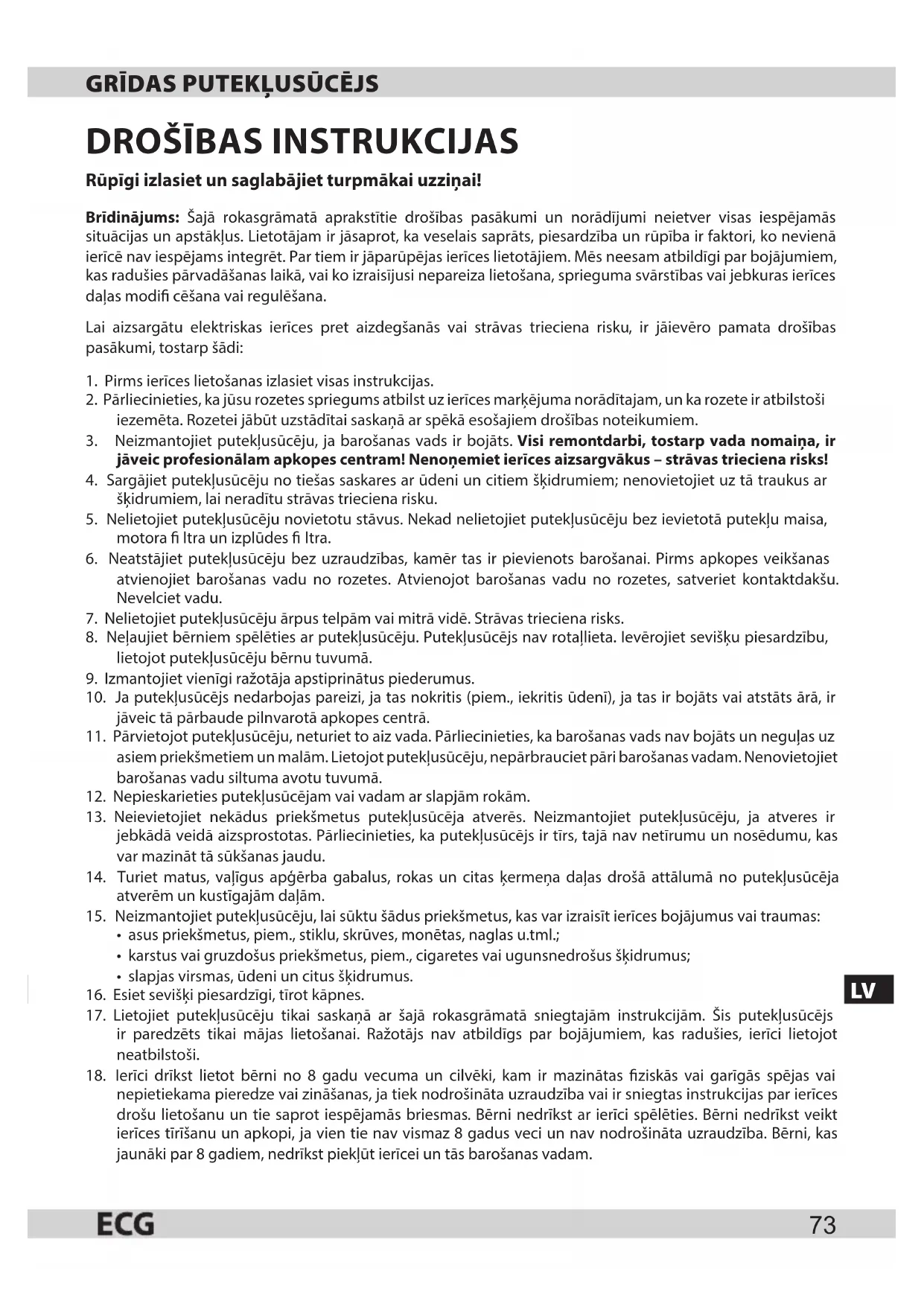 nepietiekama pieredze vai zināšanas, ja tiek nodrošināta uzraudzība vai ir sniegtas instrukcijas par ierīces drošu lietošanu un tie saprot iespējamās briesmas. Bērni nedrīkst ar ierīci spēlēties. Bērni nedrīkst veikt ierīces tīrīšanu un apkopi, ja vien tie nav vismaz 8 gadus veci un nav nodrošināta uzraudzība. Bērni, kas jaunāki par 8 gadiem, nedrīkst piekļūt ierīcei un tās barošanas vadam.LV