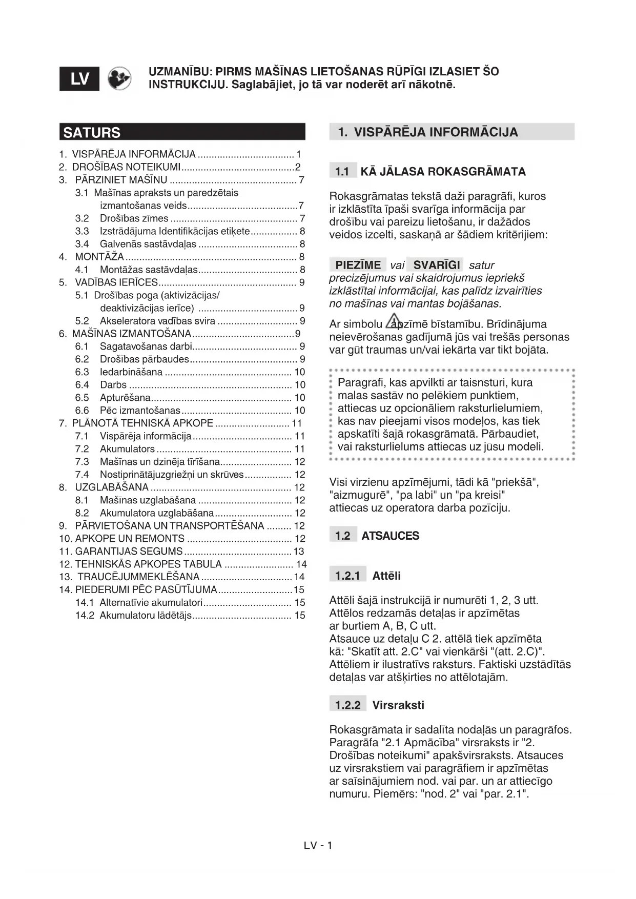 Šajā rokasgrāmatā ir sniegti visi mašīnas vadībai un pareizai lietotāja veicamajai pamata tehniskajai apkopei nepieciešamie norādījumi. Visi regulēšanas un tehniskās apkopes darbi, kas nav aprakstīti šajā rokasgrāmatā, ir jāveic pie dīlera vai specializētajā servisa centrā, kura darbiniekiem ir zināšanas un iekārtas, kuras nepieciešamas, šo darbu pareizai veikšanai, saglabājot mašīnas pirmatnējo drošības līmeni un sākotnējo stāvokli. Ja darbus veic nepiemērotajās darbnīcās, vai tos veic nekvalicēts personāls, jebkāda veida garantija tiek anulēta, kā arī ražotājs tiek atbrīvots no jebkādām saistībām vai atbildības.LV - 13