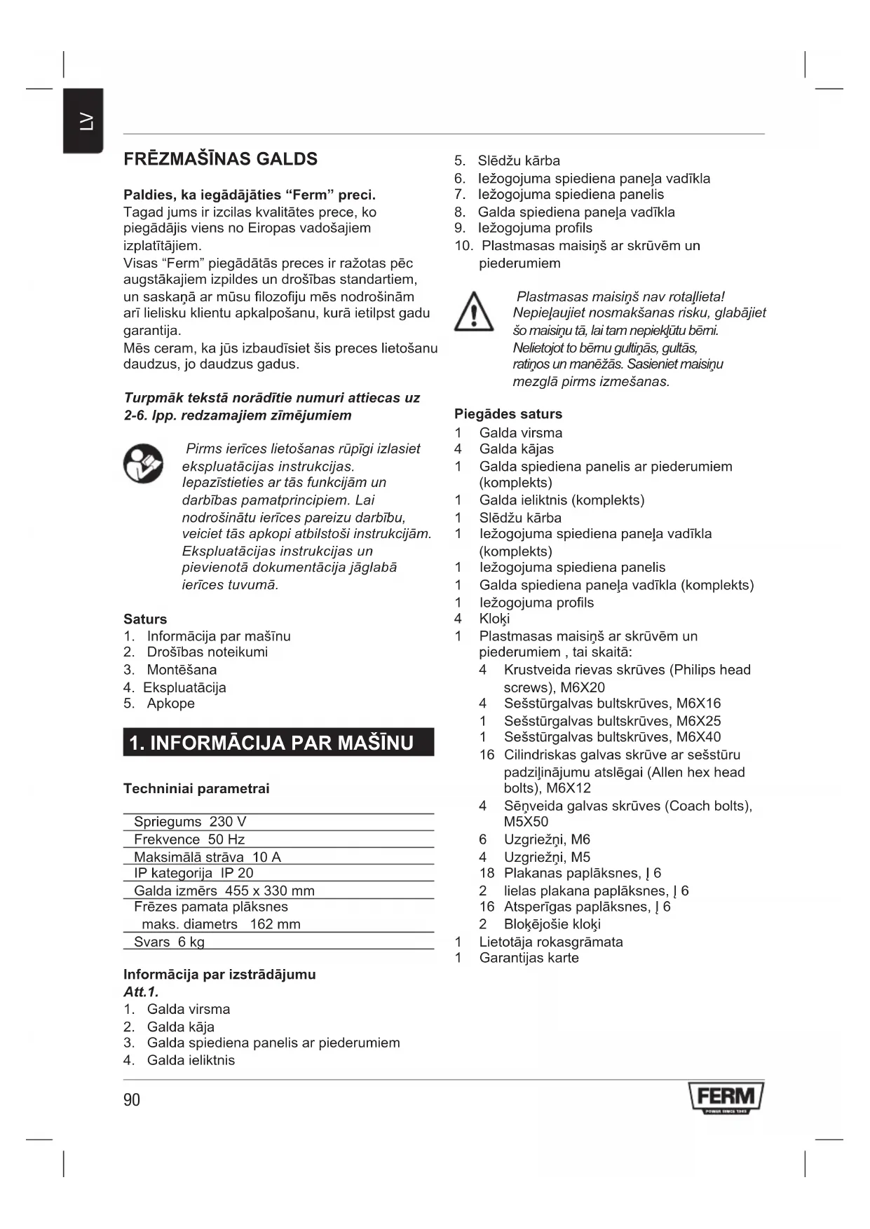 Paldies, ka iegādājāties “Ferm” preci. Tagad jums ir izcilas kvalitātes prece, ko piegādājis viens no Eiropas vadošajiem izplatītājiem. Visas “Ferm” piegādātās preces ir ražotas pēc augstākajiem izpildes un drošības standartiem, un saskaņā ar mūsu filozofiju mēs nodrošinām arī lielisku klientu apkalpošanu, kurā ietilpst gadu garantija. Mēs ceram, ka jūs izbaudīsiet šis preces lietošanu daudzus, jo daudzus gadus. Turpmāk tekstā norādītie numuri attiecas uz 2-6. lpp. redzamajiem zīmējumiem Pirmsierīceslietošanasrūpīgiizlasiet ekspluatācijasinstrukcijas. Iepazīstietiesartāsfunkcijāmun darbībaspamatprincipiem.Lai nodrošinātuierīcespareizudarbību, veiciettāsapkopiatbilstošiinstrukcijām. Ekspluatācijasinstrukcijasun pievienotādokumentācijajāglabā ierīcestuvumā. Saturs