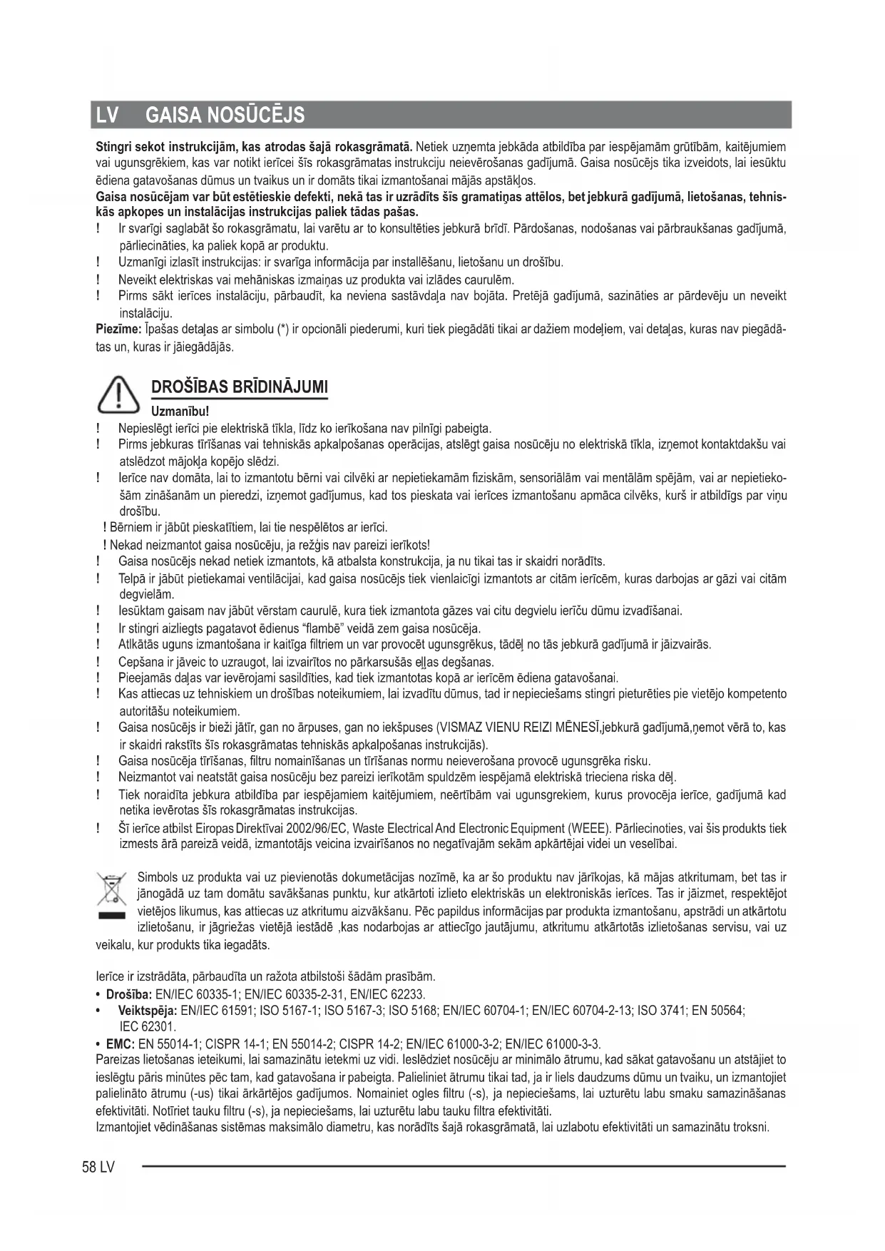 Uzmanību! ! Nepieslēgt ierīci pie elektriskā tīkla, līdz ko ierīkošana nav pilnīgi pabeigta. ! Pirms jebkuras tīrīšanas vai tehniskās apkalpošanas operācijas, atslēgt gaisa nosūcēju no elektriskā tīkla, izņemot kontaktdakšu vai atslēdzot mājokļa kopējo slēdzi. ! Ierīce nav domāta, lai to izmantotu bērni vai cilvēki ar nepietiekamām ziskām, sensoriālām vai mentālām spējām, vai ar nepietieko- šām zināšanām un pieredzi, izņemot gadījumus, kad tos pieskata vai ierīces izmantošanu apmāca cilvēks, kurš ir atbildīgs par viņu drošību. ! Bērniem ir jābūt pieskatītiem, lai tie nespēlētos ar ierīci. ! Nekad neizmantot gaisa nosūcēju, ja režģis nav pareizi ierīkots! ! Gaisa nosūcējs nekad netiek izmantots, kā atbalsta konstrukcija, ja nu tikai tas ir skaidri norādīts. ! Telpā ir jābūt pietiekamai ventilācijai, kad gaisa nosūcējs tiek vienlaicīgi izmantots ar citām ierīcēm, kuras darbojas ar gāzi vai citām degvielām. ! Iesūktam gaisam nav jābūt vērstam caurulē, kura tiek izmantota gāzes vai citu degvielu ierīču dūmu izvadīšanai. ! Ir stingri aizliegts pagatavot ēdienus “ambē” veidā zem gaisa nosūcēja. ! Atlkātās uguns izmantošana ir kaitīga ltriem un var provocēt ugunsgrēkus, tādēļ no tās jebkurā gadījumā ir jāizvairās. ! Cepšana ir jāveic to uzraugot, lai izvairītos no pārkarsušās eļļas degšanas. ! Pieejamās daļas var ievērojami sasildīties, kad tiek izmantotas kopā ar ierīcēm ēdiena gatavošanai. ! Kas attiecas uz tehniskiem un drošības noteikumiem, lai izvadītu dūmus, tad ir nepieciešams stingri pieturēties pie vietējo kompetento autoritāšu noteikumiem. ! Gaisa nosūcējs ir bieži jātīr, gan no ārpuses, gan no iekšpuses (VISMAZ VIENU REIZI MĒNESĪ,jebkurā gadījumā,ņemot vērā to, kas ir skaidri rakstīts šīs rokasgrāmatas tehniskās apkalpošanas instrukcijās). ! Gaisa nosūcēja tīrīšanas, ltru nomainīšanas un tīrīšanas normu neieverošana provocē ugunsgrēka risku. ! Neizmantot vai neatstāt gaisa nosūcēju bez pareizi ierīkotām spuldzēm iespējamā elektriskā trieciena riska dēļ. ! Tiek noraidīta jebkura atbildība par iespējamiem kaitējumiem, neērtībām vai ugunsgrekiem, kurus provocēja ierīce, gadījumā kad netika ievērotas šīs rokasgrāmatas instrukcijas. ! Šī ierīce atbilst Eiropas Direktīvai 2002/96/EC, Waste Electrical And Electronic Equipment (WEEE). Pārliecinoties, vai šis produkts tiek izmests ārā pareizā veidā, izmantotājs veicina izvairīšanos no negatīvajām sekām apkārtējai videi un veselībai. Simbols uz produkta vai uz pievienotās dokumetācijas nozīmē, ka ar šo produktu nav jārīkojas, kā mājas atkritumam, bet tas ir jānogādā uz tam domātu savākšanas punktu, kur atkārtoti izlieto elektriskās un elektroniskās ierīces. Tas ir jāizmet, respektējot vietējos likumus, kas attiecas uz atkritumu aizvākšanu. Pēc papildus informācijas par produkta izmantošanu, apstrādi un atkārtotu izlietošanu, ir jāgriežas vietējā iestādē ,kas nodarbojas ar attiecīgo jautājumu, atkritumu atkārtotās izlietošanas servisu, vai uz veikalu, kur produkts tika iegadāts. Ierīce ir izstrādāta, pārbaudīta un ražota atbilstoši šādām prasībām.