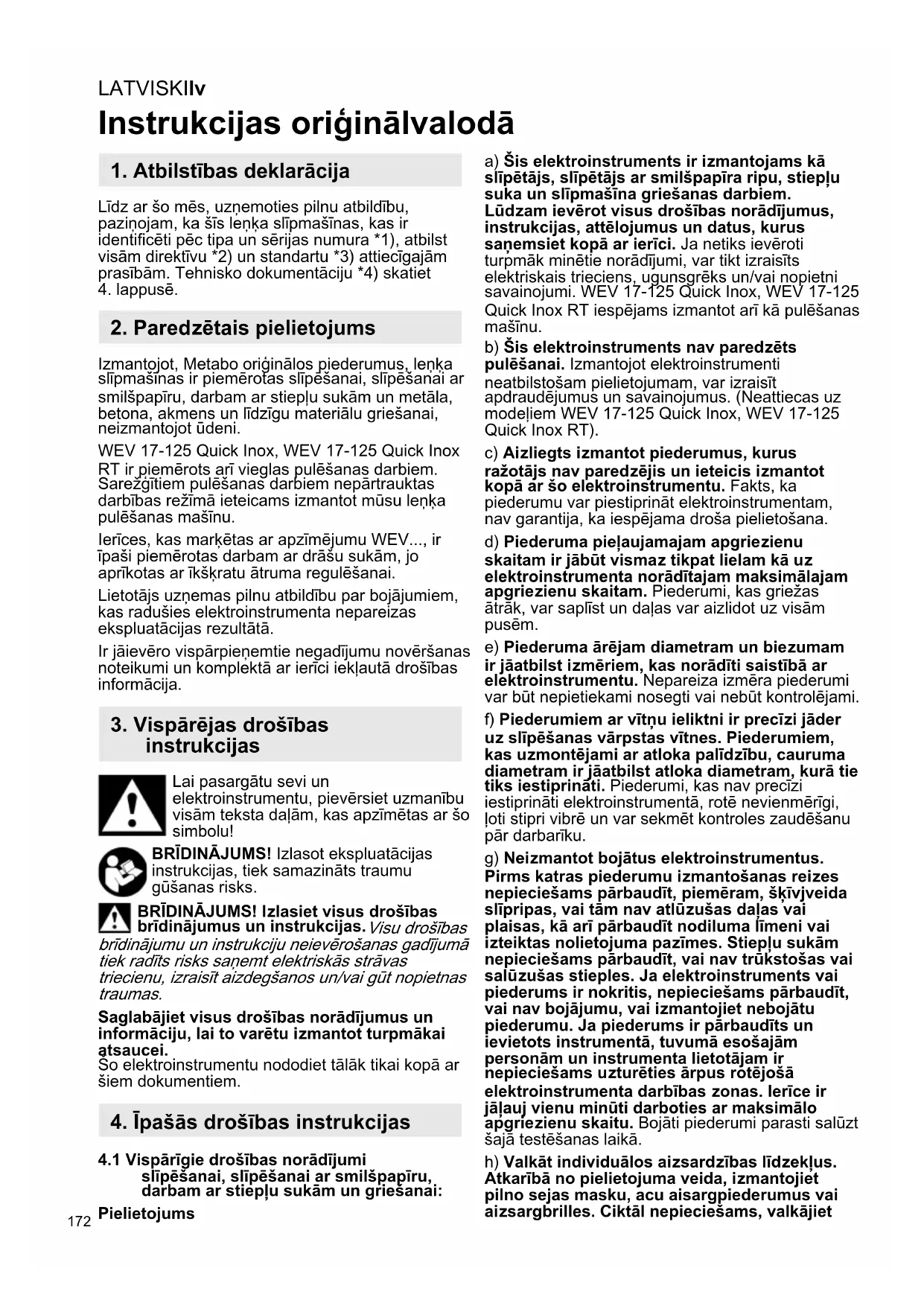 Izmantojot, Metabo oriģinālos piederumus, leņķa slīpmašīnas ir piemērotas slīpēšanai, slīpēšanai ar smilšpapīru, darbam ar stiepļu sukām un metāla, betona, akmens un līdzīgu materiālu griešanai, neizmantojot ūdeni. WEV 17-125 Quick Inox, WEV 17-125 Quick Inox RT ir piemērots arī vieglas pulēšanas darbiem. Sarežģītiem pulēšanas darbiem nepārtrauktas darbības režīmā ieteicams izmantot mūsu leņķa pulēšanas mašīnu. Ierīces, kas marķētas ar apzīmējumu WEV..., ir īpaši piemērotas darbam ar drāšu sukām, jo aprīkotas ar īkšķratu ātruma regulēšanai. Lietotājs uzņemas pilnu atbildību par bojājumiem, kas radušies elektroinstrumenta nepareizas ekspluatācijas rezultātā. Ir jāievēro vispārpieņemtie negadījumu novēršanas noteikumi un komplektā ar ierīci iekļautā drošības informācija. Lai pasargātu sevi un elektroinstrumentu, pievērsiet uzmanību visām teksta daļām, kas apzīmētas ar šo simbolu! BRĪDINĀJUMS! Izlasot ekspluatācijas instrukcijas, tiek samazināts traumu gūšanas risks. BRĪDINĀJUMS! Izlasiet visus drošības brīdinājumus un instrukcijas. Visu drošības brīdinājumu un instrukciju neievērošanas gadījumā tiek radīts risks saņemt elektriskās strāvas triecienu, izraisīt aizdegšanos un/vai gūt nopietnas traumas. Saglabājiet visus drošības norādījumus un informāciju, lai to varētu izmantot turpmākai atsaucei. Šo elektroinstrumentu nododiet tālāk tikai kopā ar šiem dokumentiem.