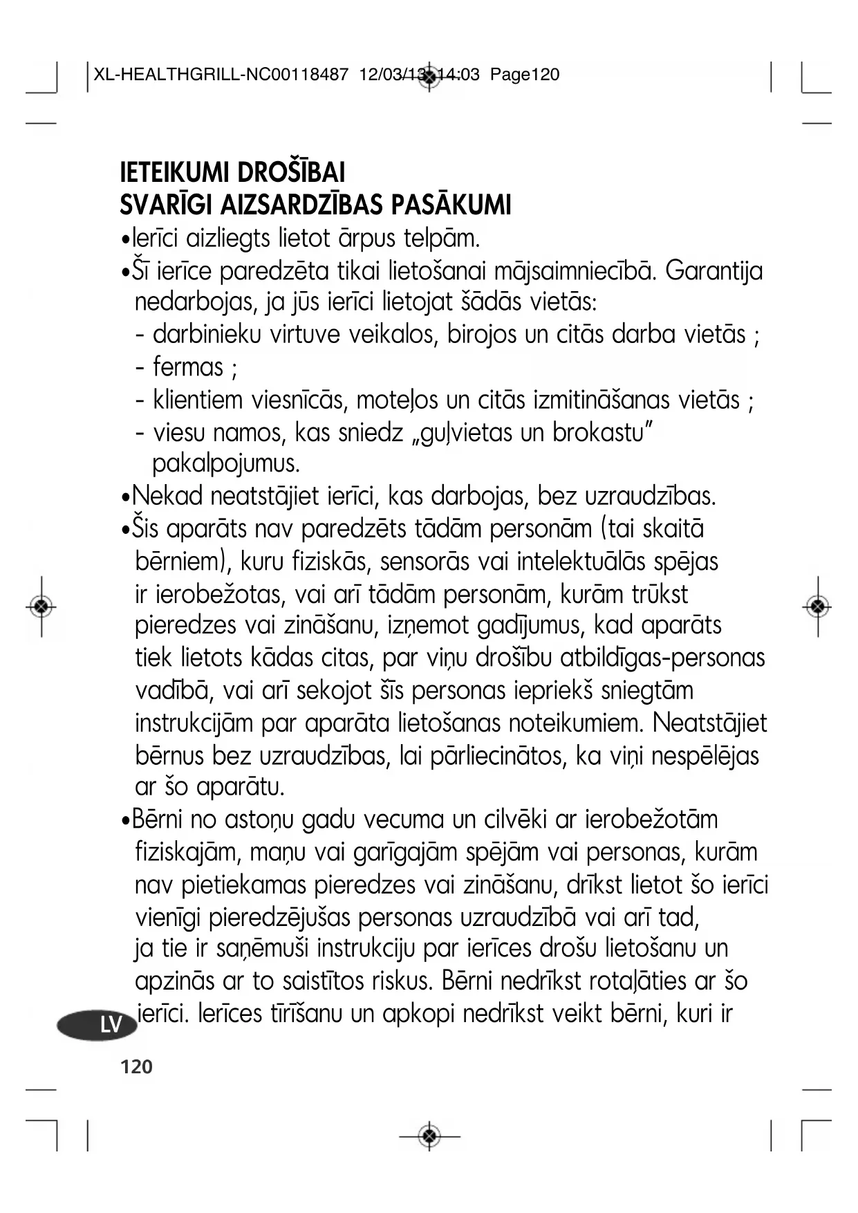 XL-HEALTHGRILL-NC00118487 12/03/13 14:03 Page120jaunāki par astoņiem gadiem, un bērni to drīkst darīt vienīgi pieaugušo uzraudzībā. Glabājiet ierīci un tās elektrības kabeli vietā, kas nav pieejama bērniem, kuri ir jaunāki par astoņiem gadiem.